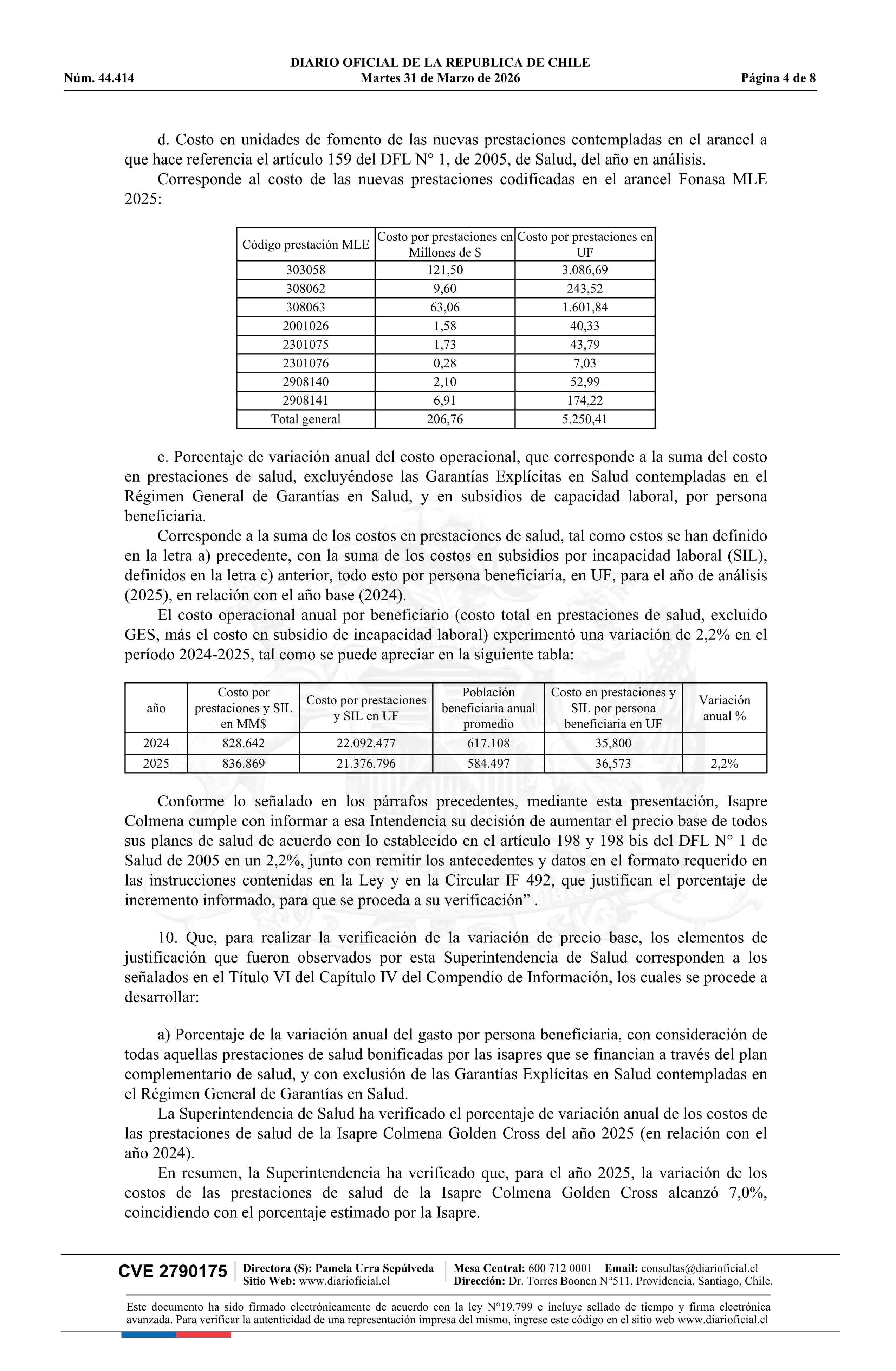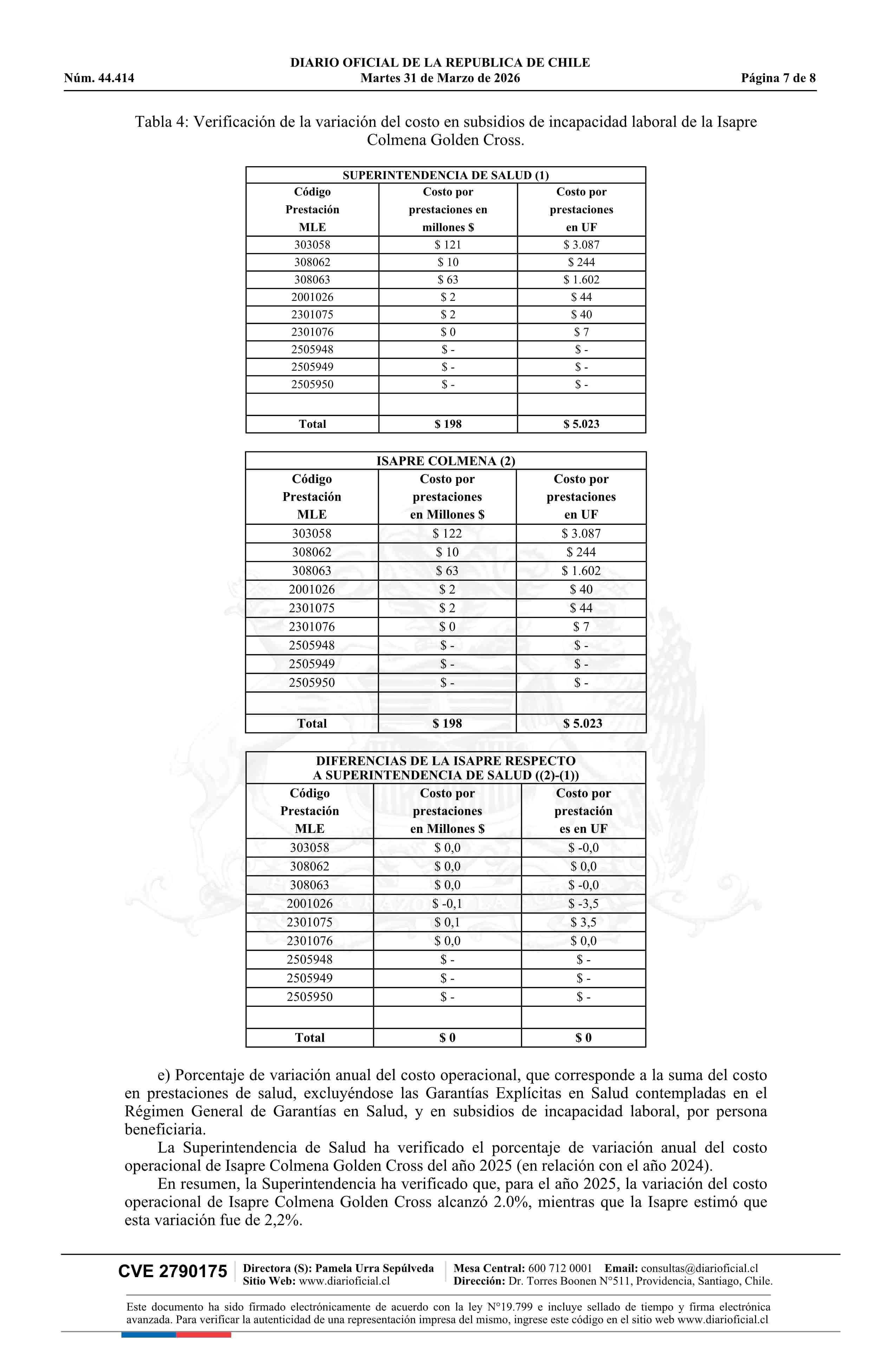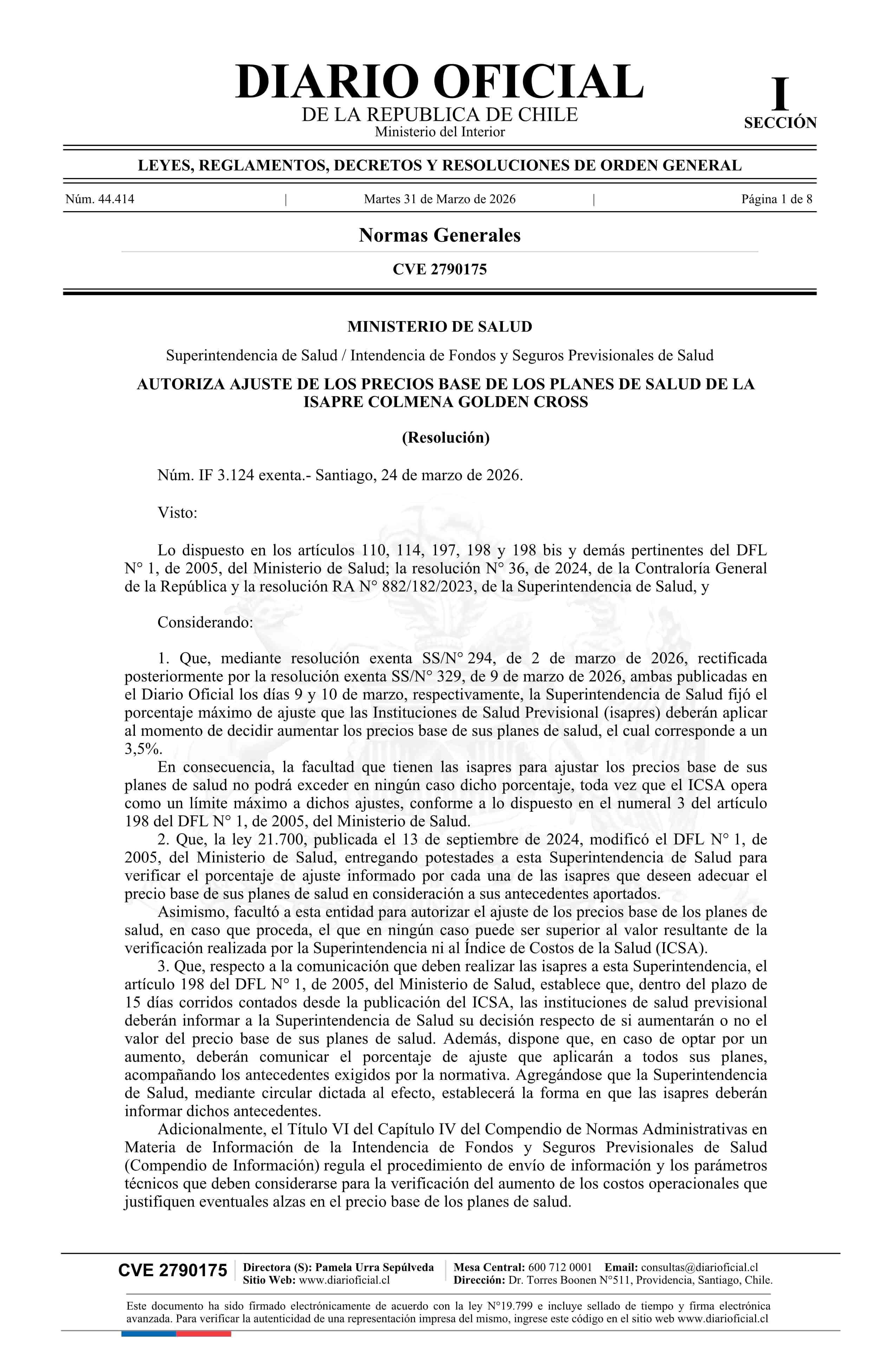 Resolución exenta número IF 3.124, de 2026.- Autoriza ajuste de los precios base de los planes de salud de la Isapre Colmena Golden Cross 31-03-2026 Diario Oficial Edición Electrónica |