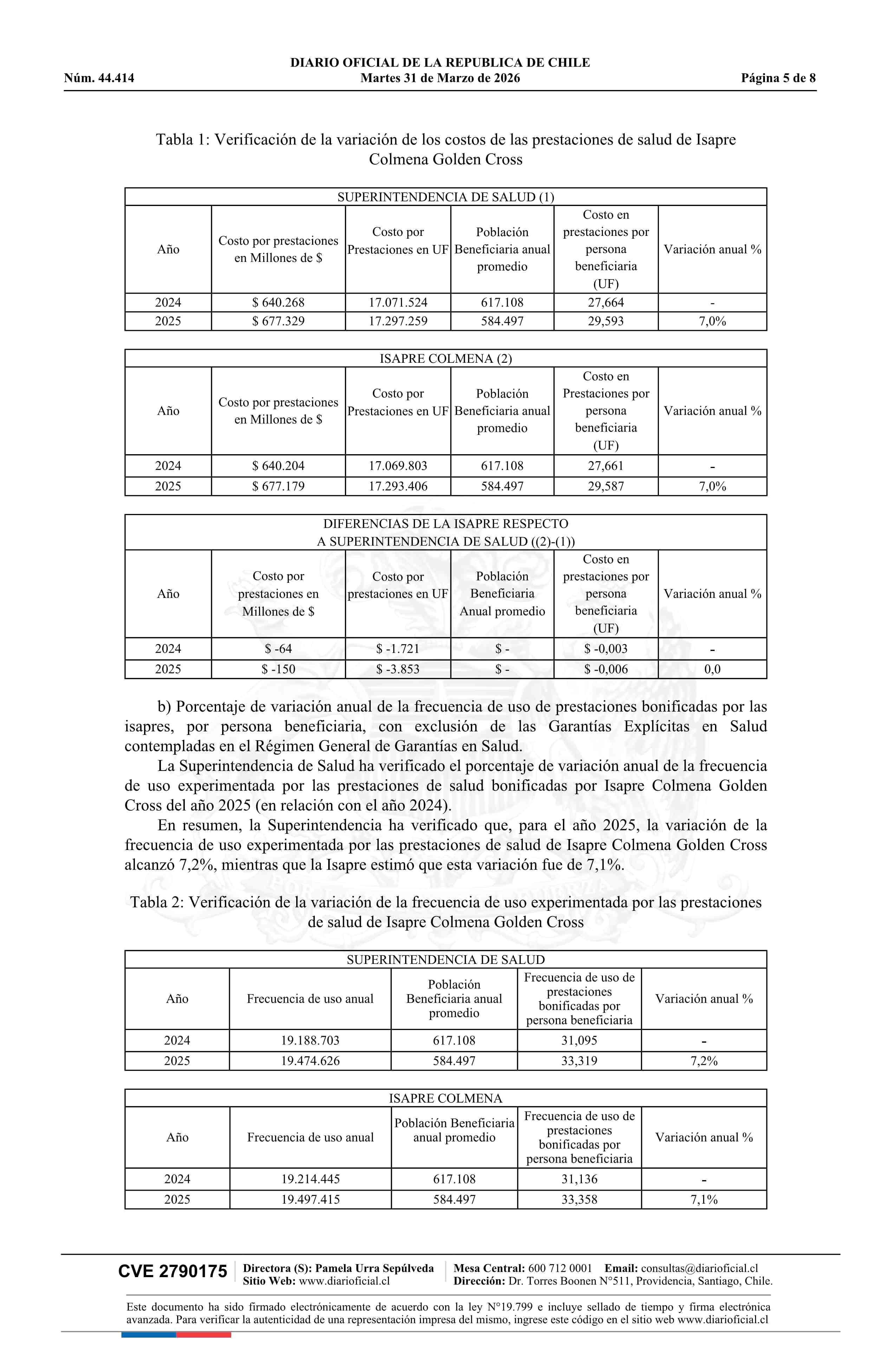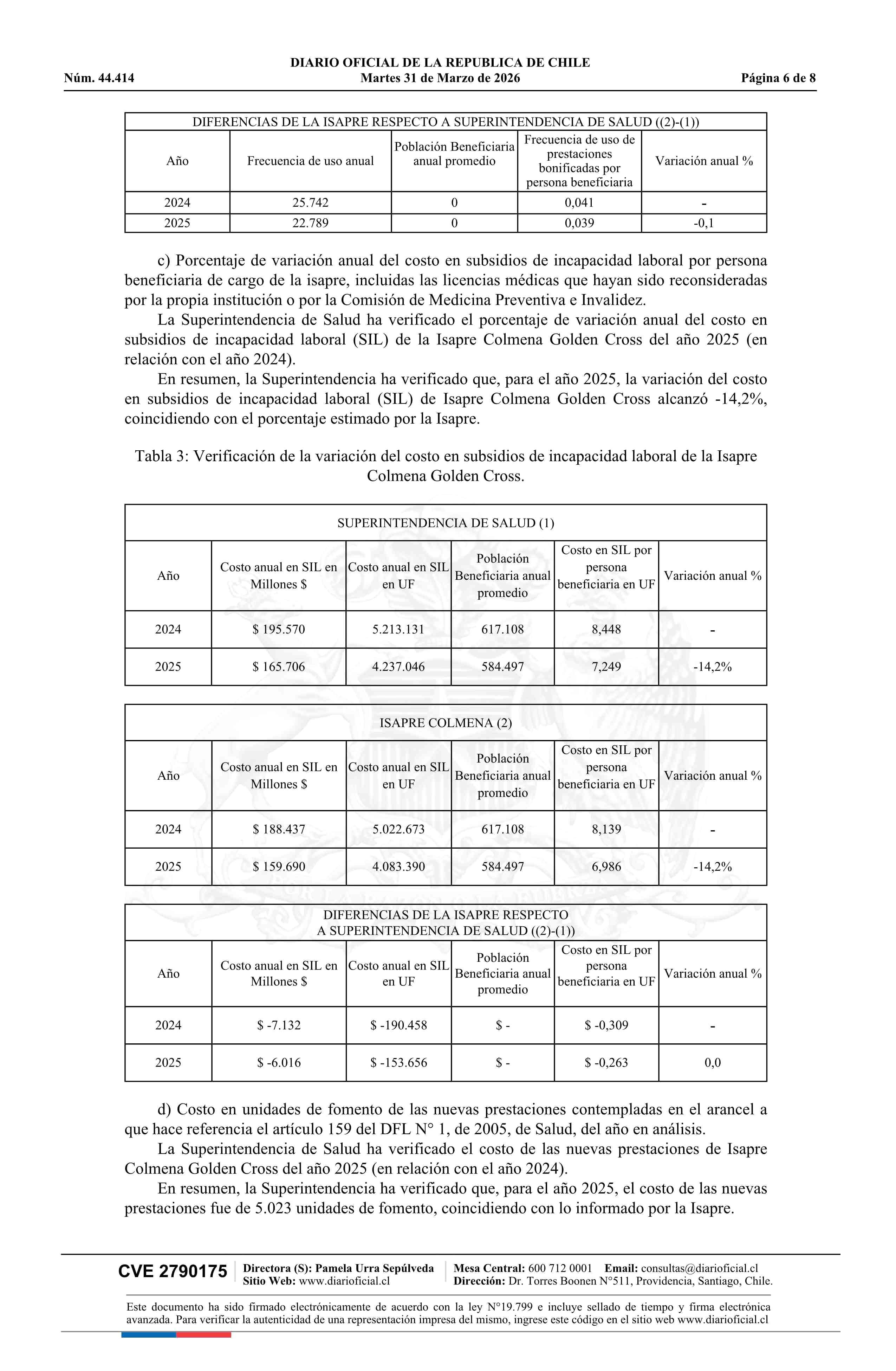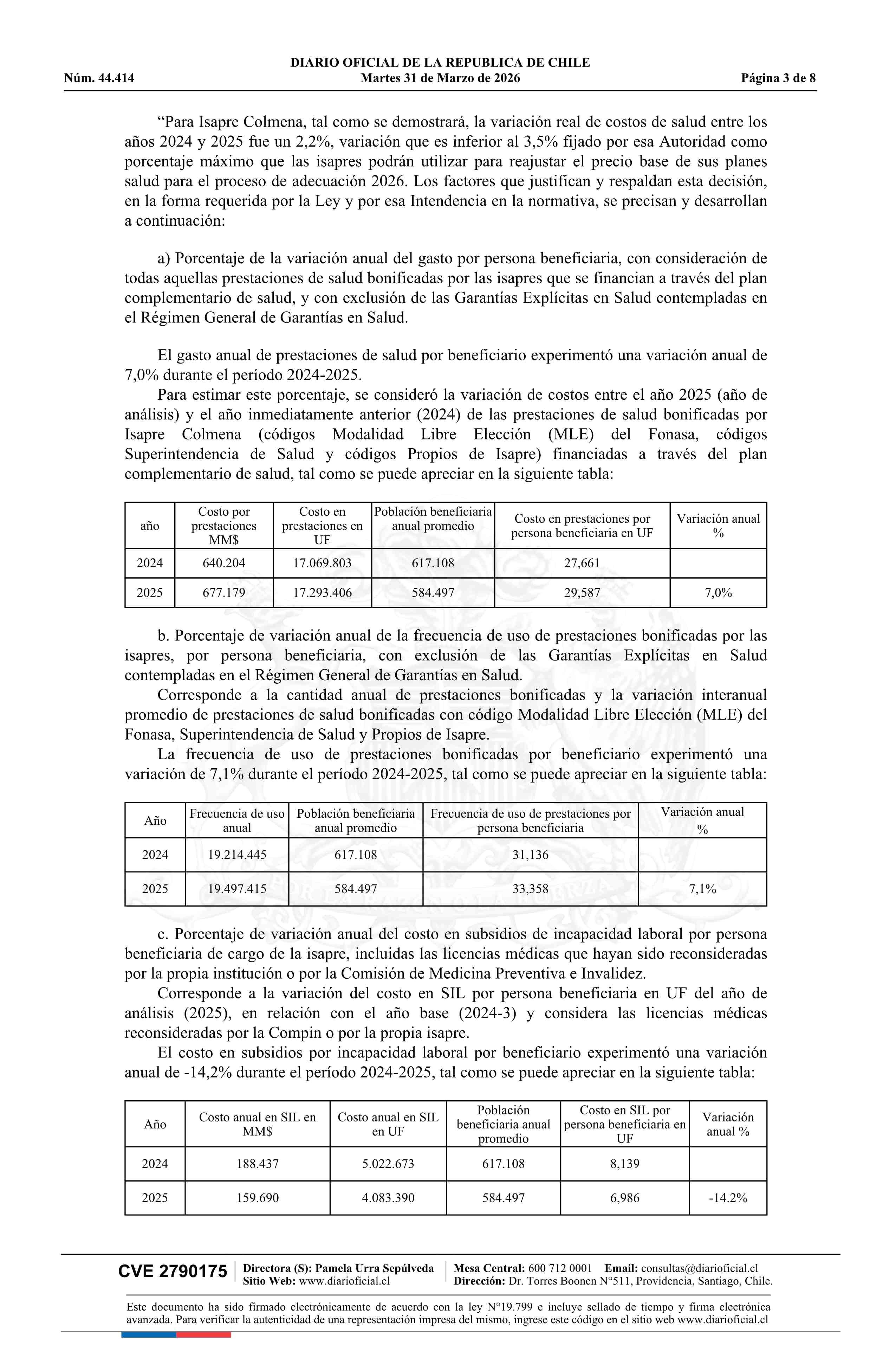 Resolución exenta número IF 3.124, de 2026.- Autoriza ajuste de los precios base de los planes de salud de la Isapre Colmena Golden Cross 31-03-2026 Diario Oficial Edición Electrónica |