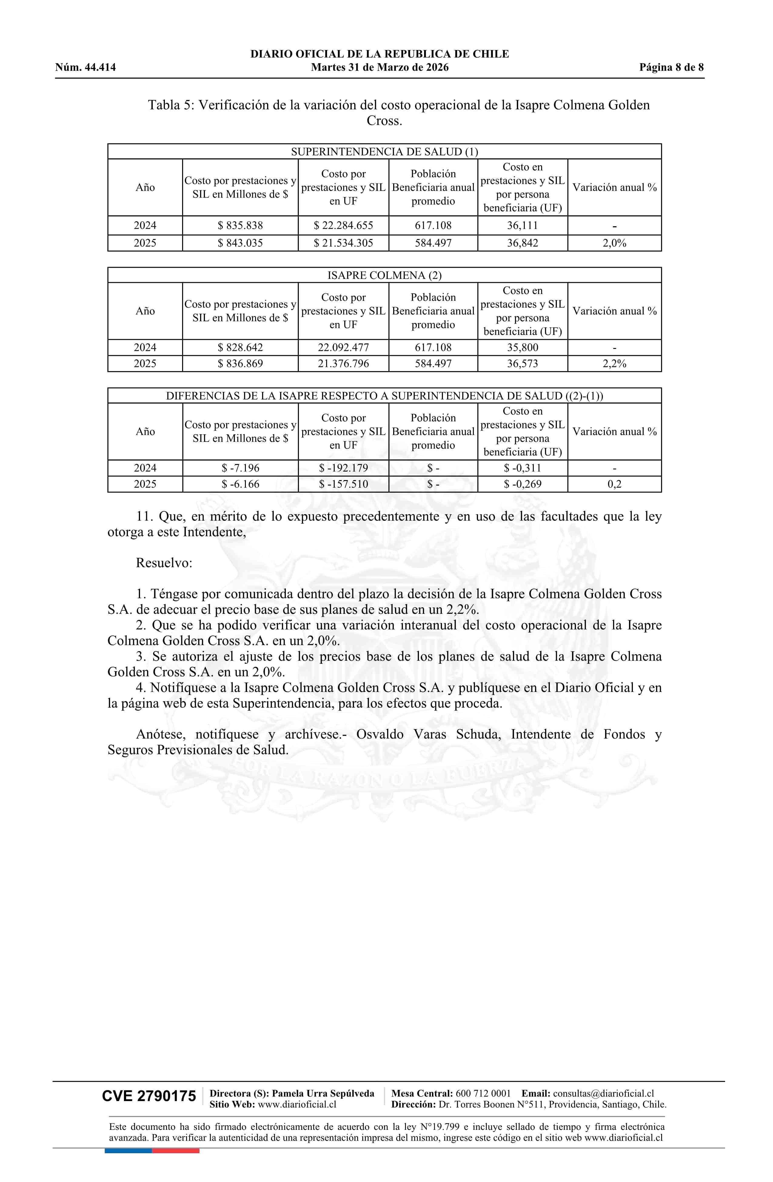 | Título: | Resolución exenta número IF 3.124, de 2026.- Autoriza ajuste de los precios base de los planes de salud de la Isapre Colmena Golden Cross |