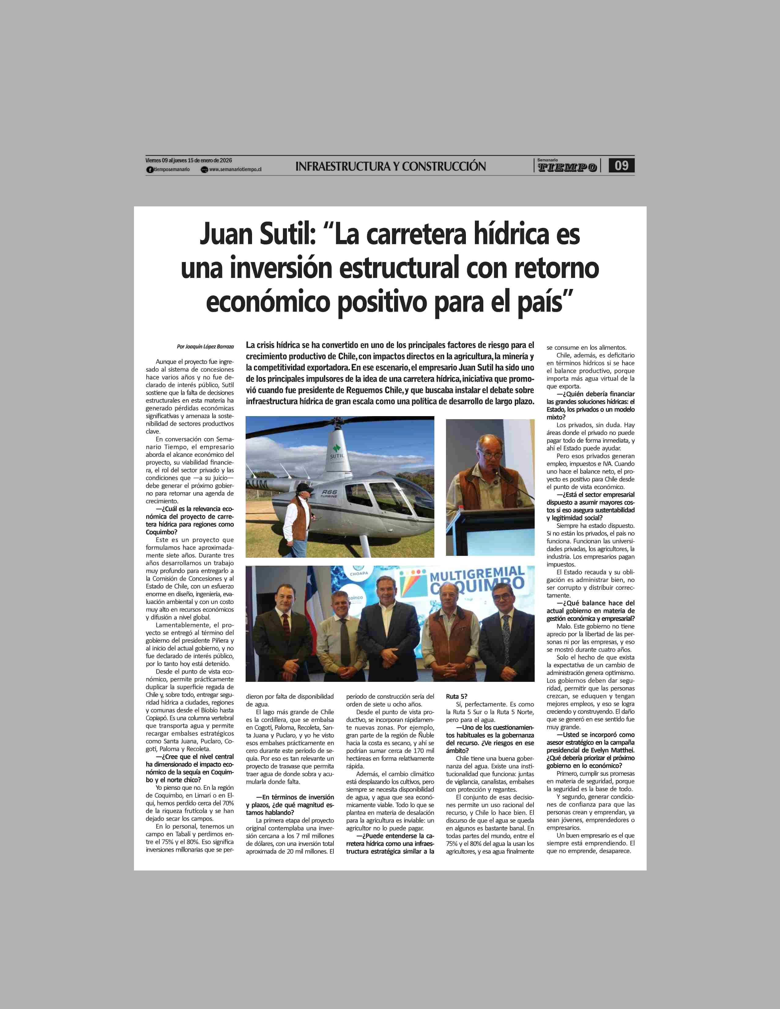 Juan Sutil: "La carretera hídrica es una inversión estructural con retorno económico positivo para el país" 09-01-2026 Semanario Tiempo |