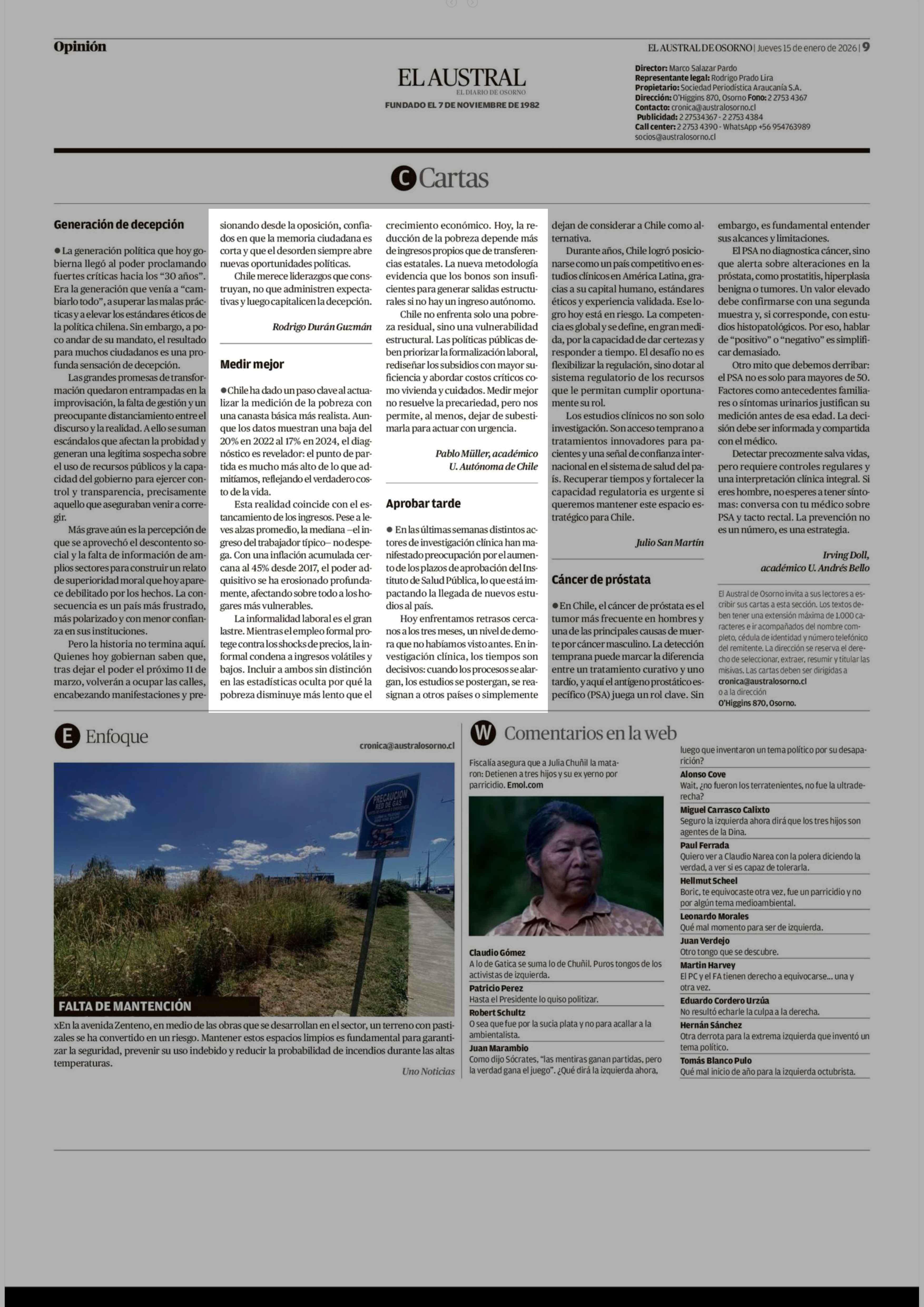 Cartas: Medir mejor 15-01-2026 El Austral de Osorno |