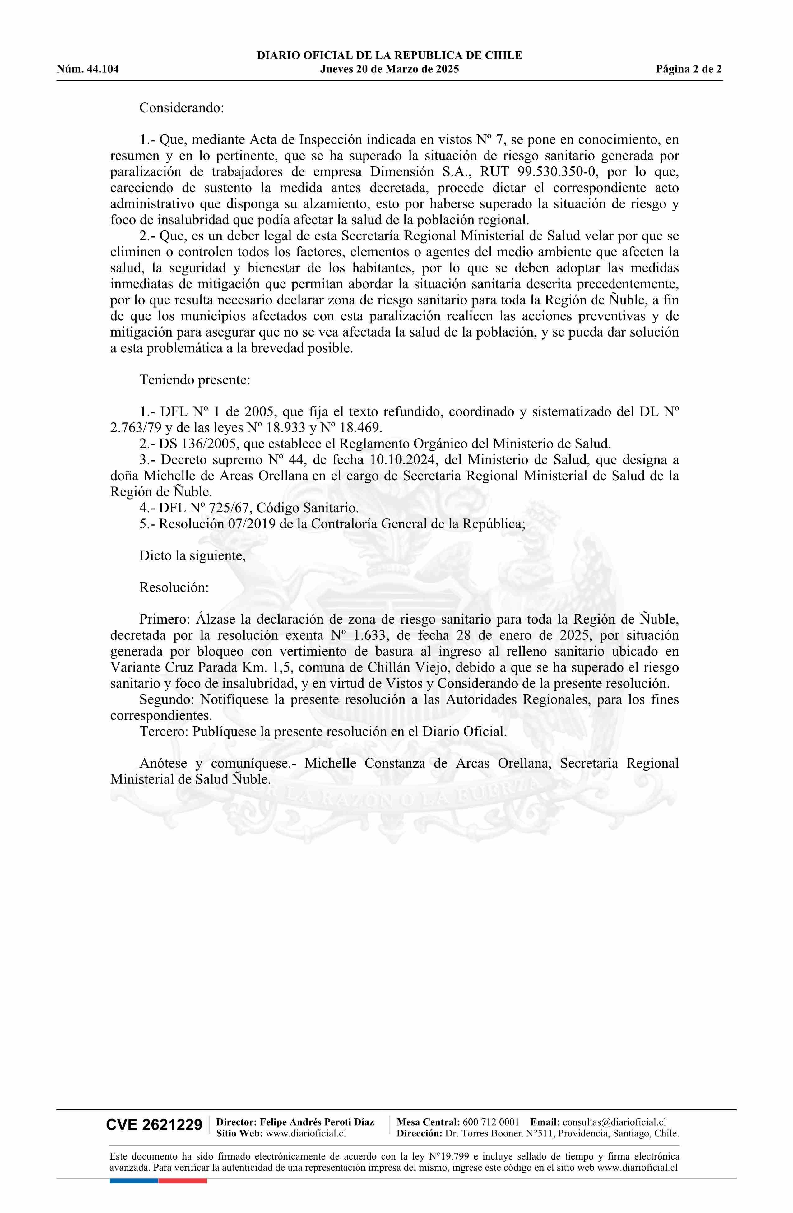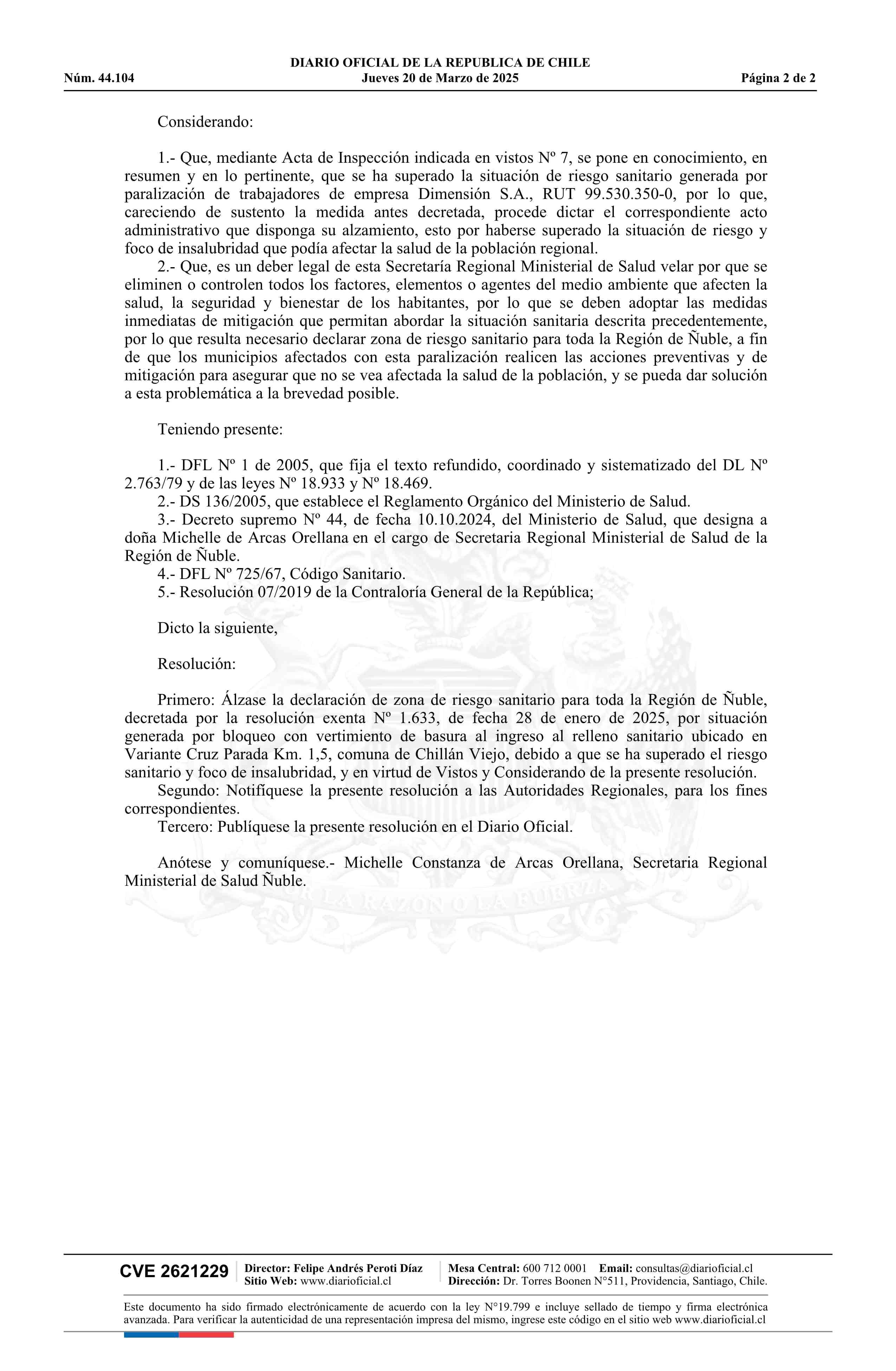 | Título: | Resolución exenta número CP 1.713, de 2025.- Alza declaración de zona de riesgo sanitario en la Región de Ñuble por situación que se indica |