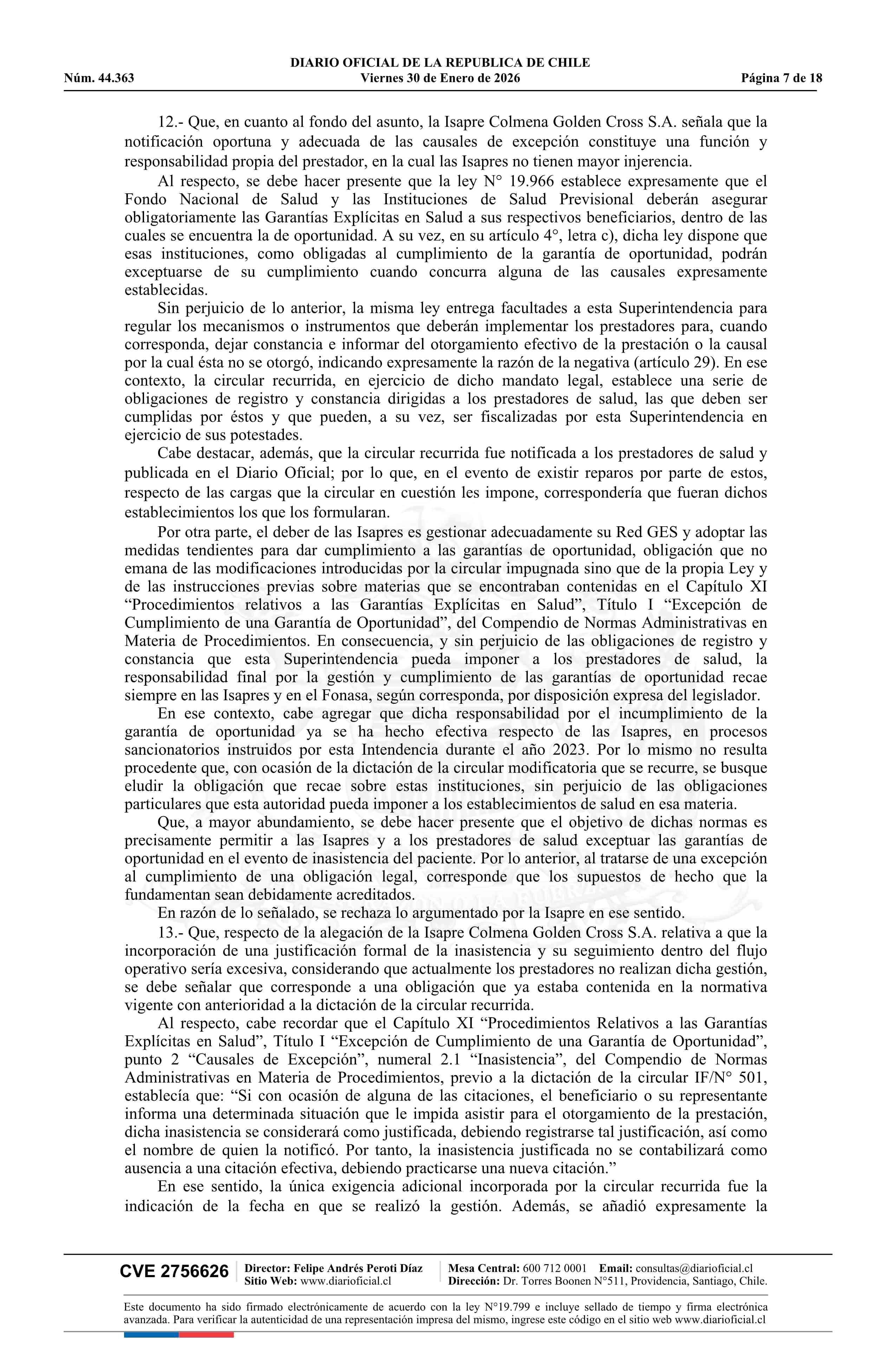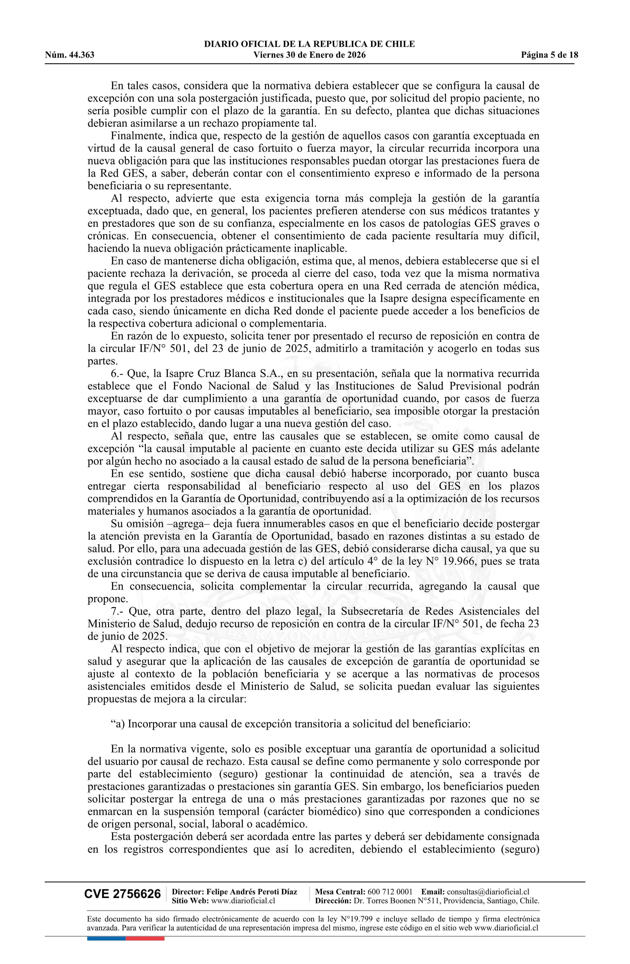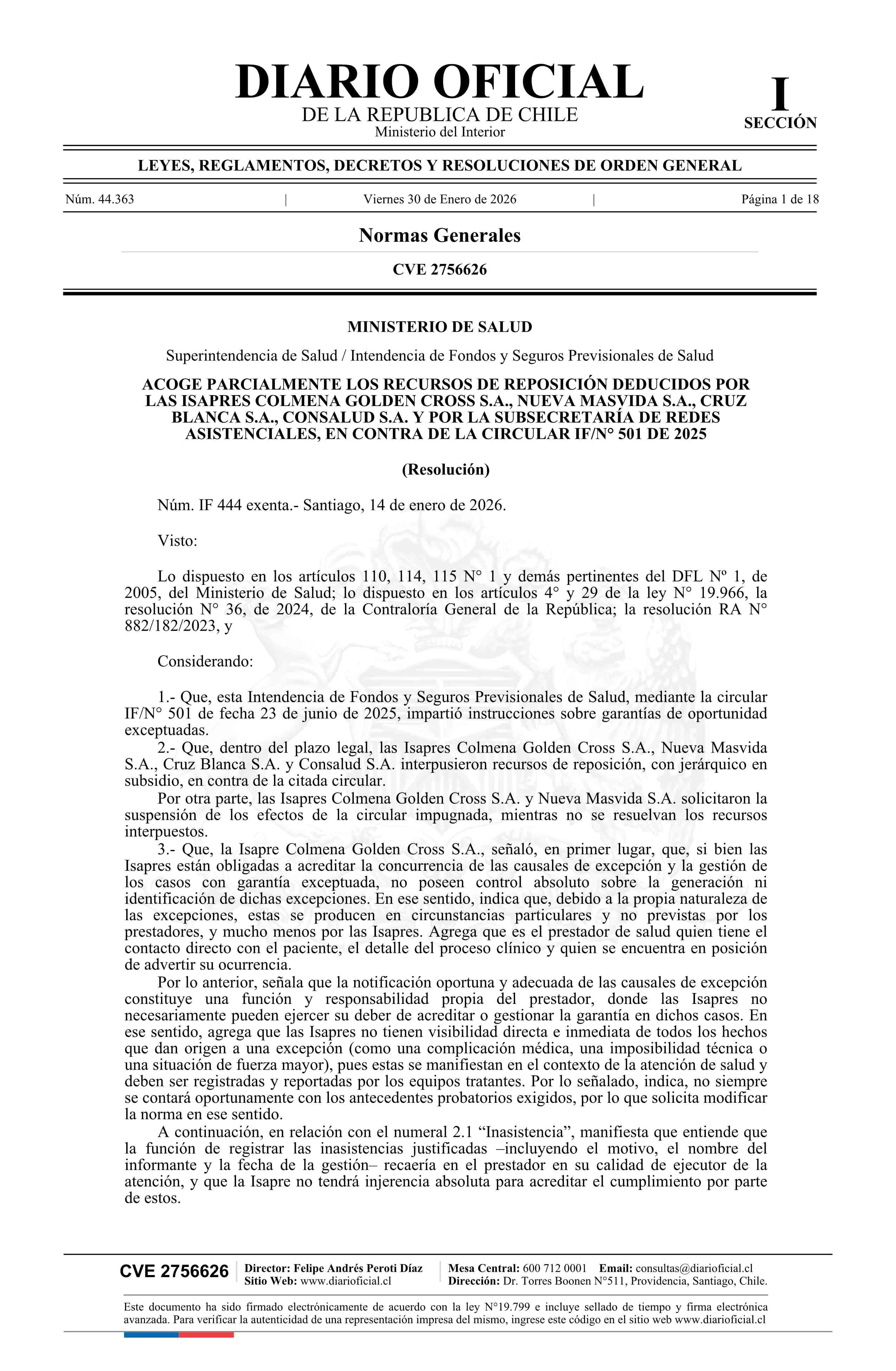 | Título: | Resolución exenta número IF 444, de 2026.- Acoge parcialmente los recursos de reposición deducidos por las isapres Colmena Golden Cross S.A., Nueva Masvida S.A., Cruz Blanca S.A. y Consalud S.A., y por la Subsecretaría de Redes Asistenciales, en contra de la circular IF/N° 501 de 2025 |