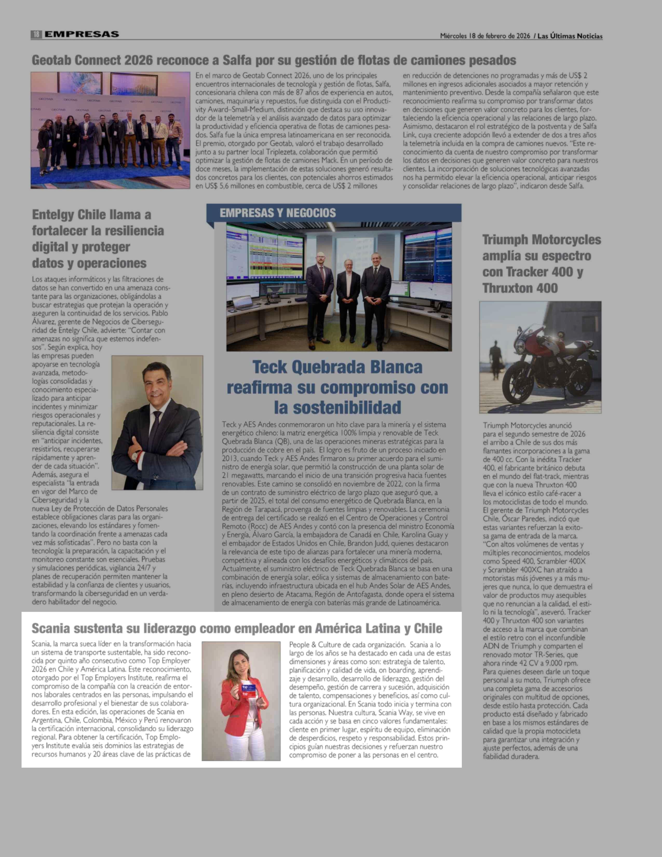 Scania sustenta su liderazgo como empleador en América Latina y Chile 18-02-2026 Las Últimas Noticias |