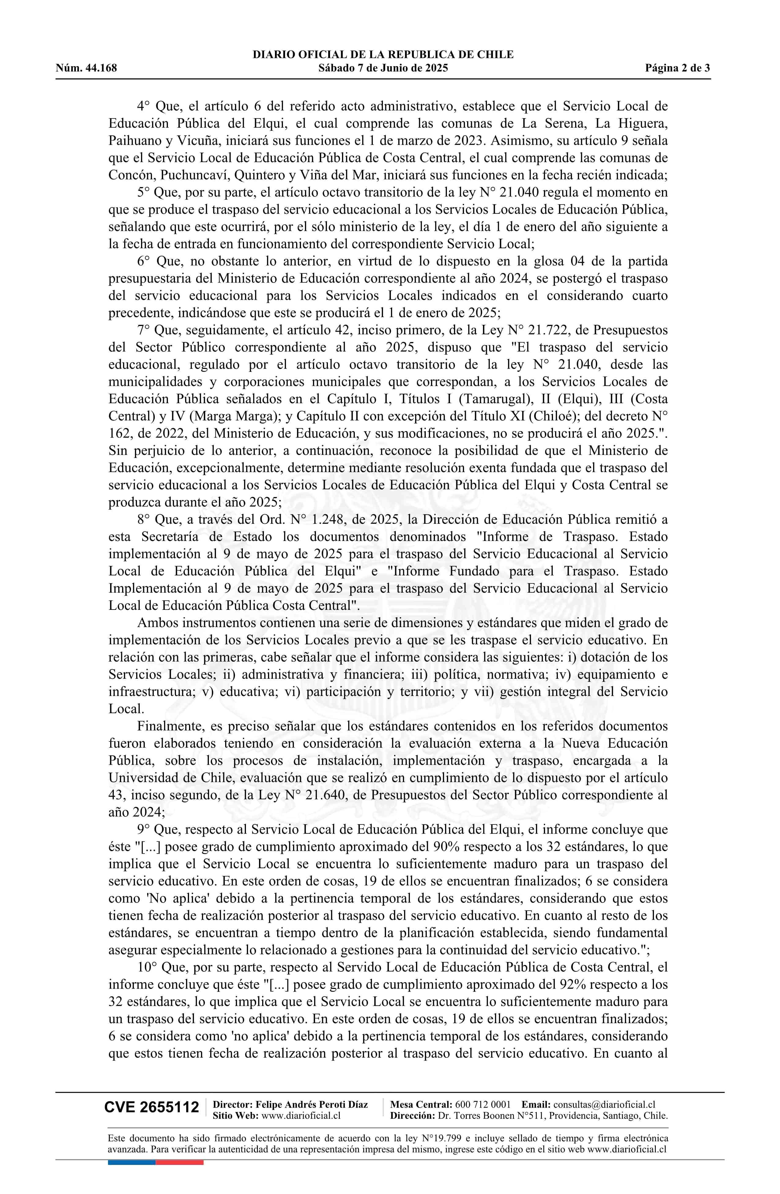 Resolución exenta número 7.343, de 2025.- Dispone el traspaso del servicio educacional correspondiente a los sostenedores que se indican a los Servicios Locales de Educación Pública del Elqui y Costa Central 07-06-2025 DIARIO OFICIAL CHILE - BOLETÍN OFICIAL DE MINERÍA |