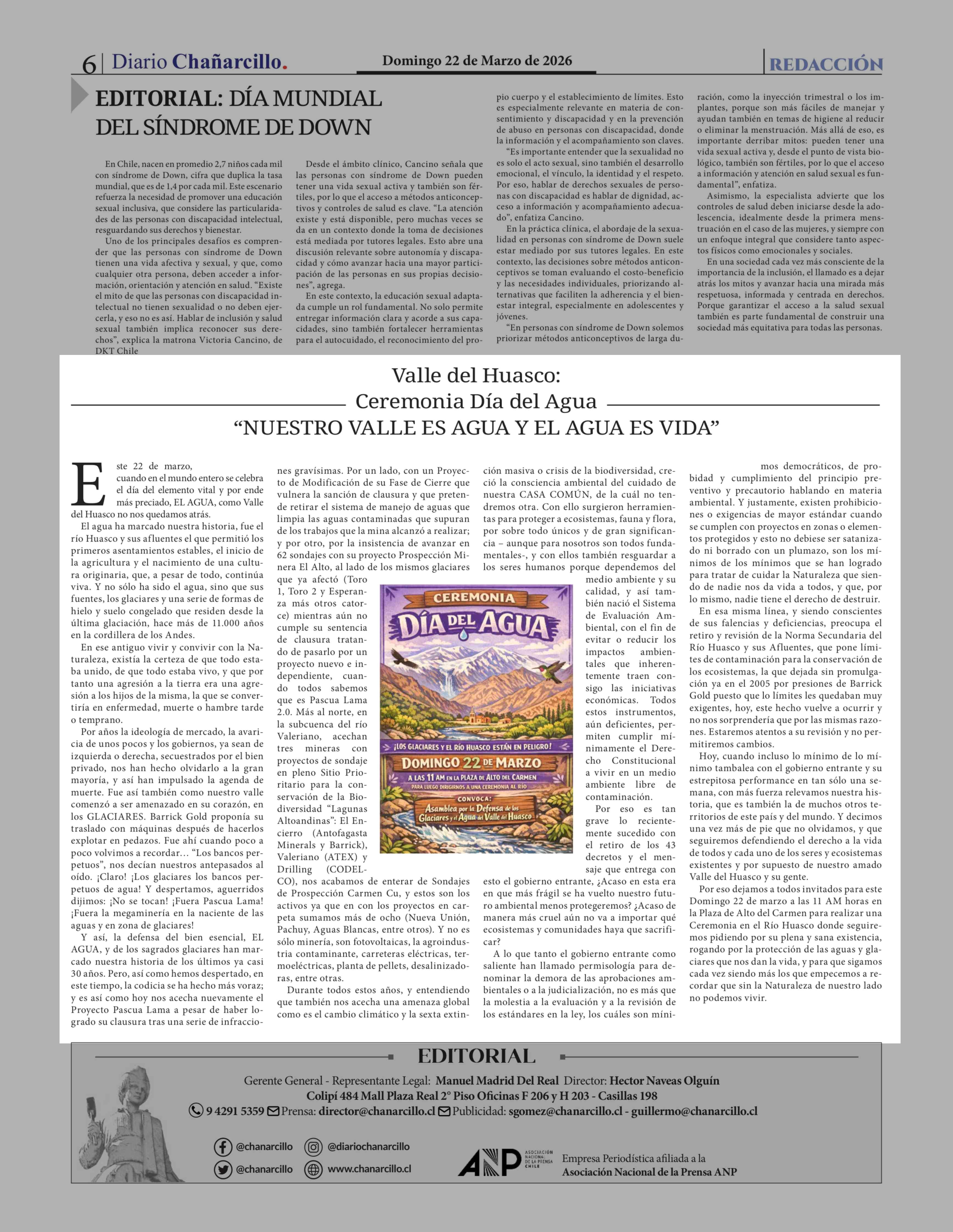 "NUESTRO VALLE ES AGUA Y EL AGUA ES VIDA" 22-03-2026 Diario Chañarcillo |