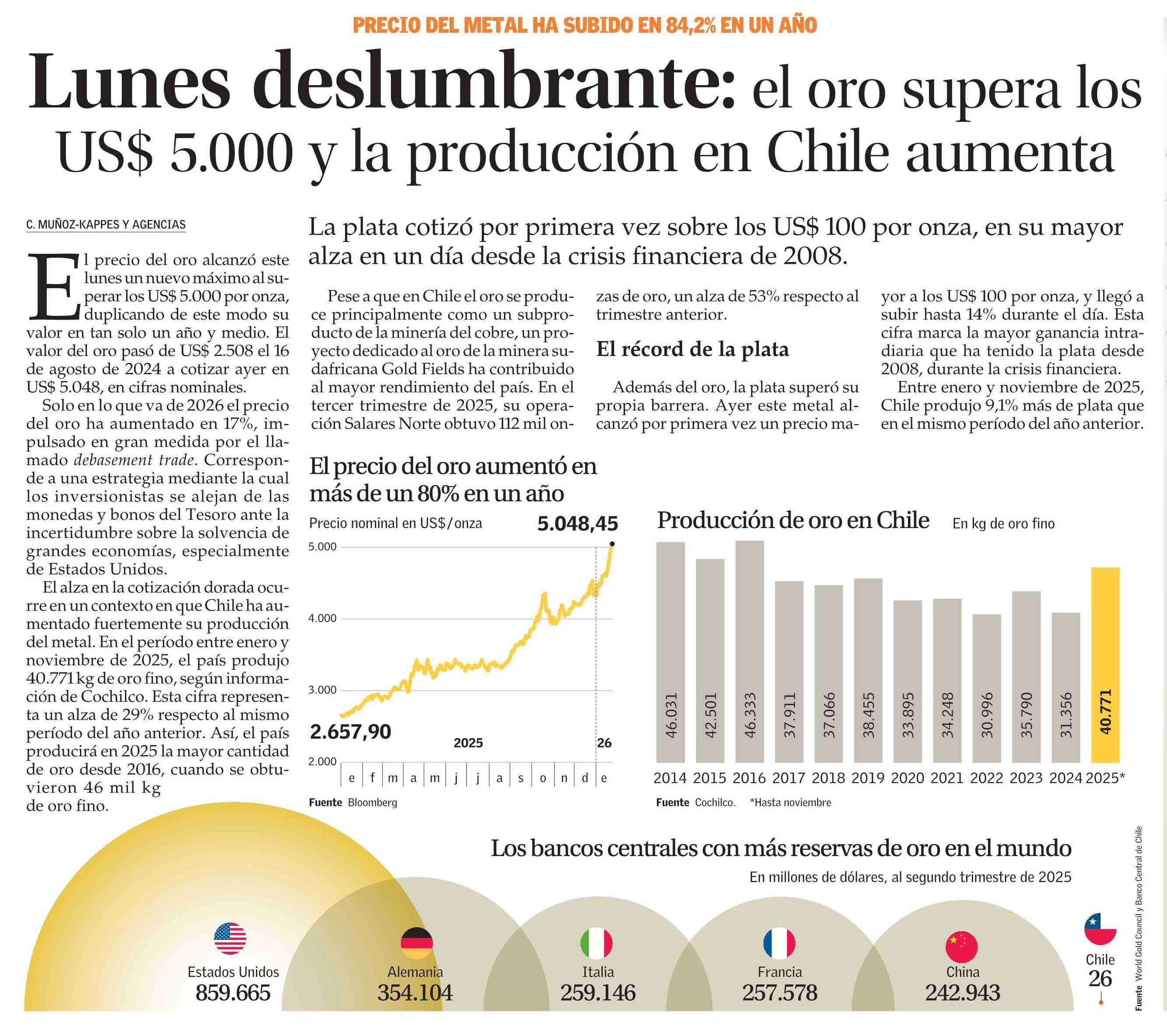 Título: Lunes deslumbrante: el oro supera los US$ 5.000 y la producción en Chile aumenta