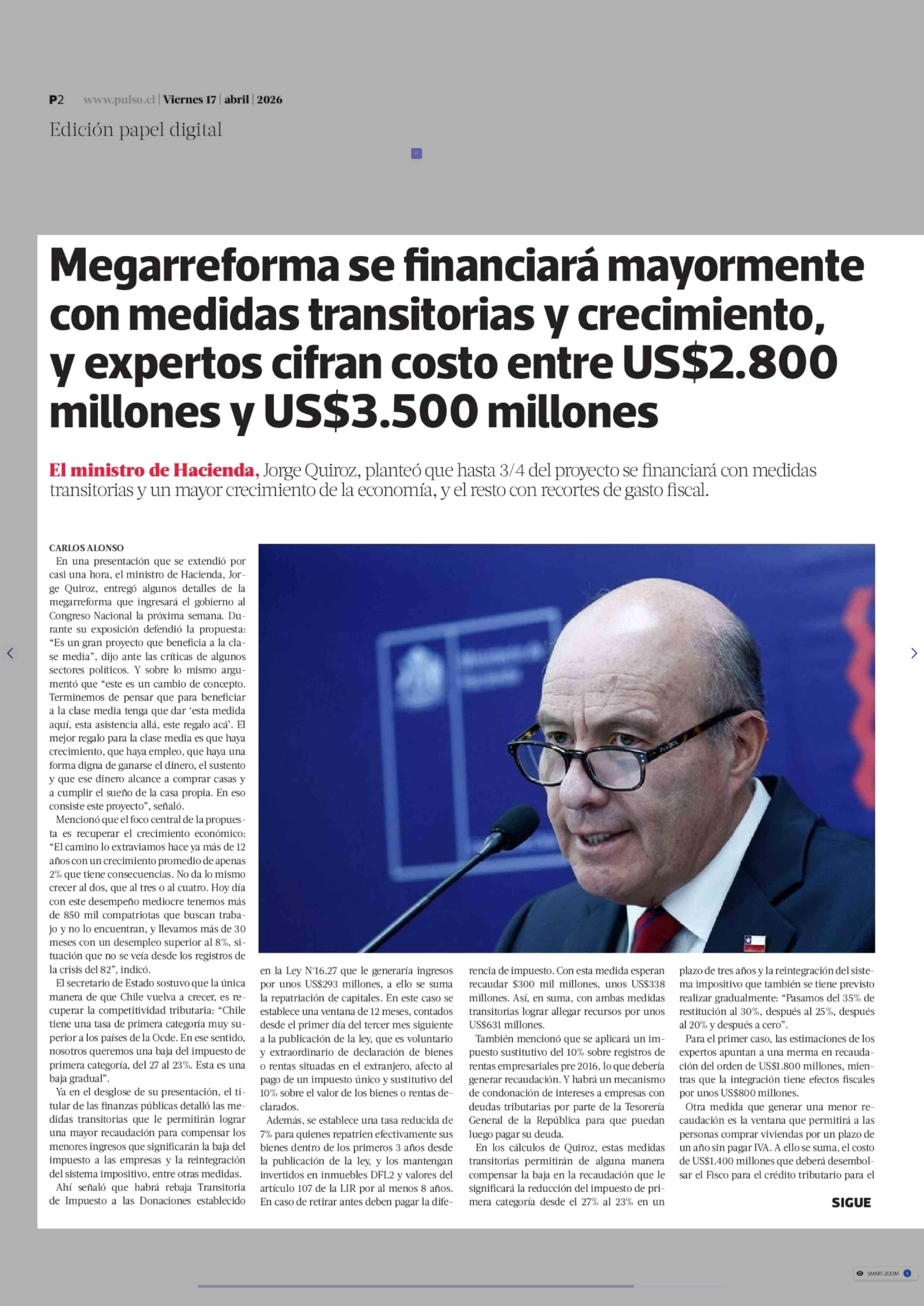 Megarreforma se financiará mayormente con medidas transitorias y crecimiento, y expertos cifran costo entre US$2.800 millones y US$3.500 millones 17-04-2026 La Tercera |