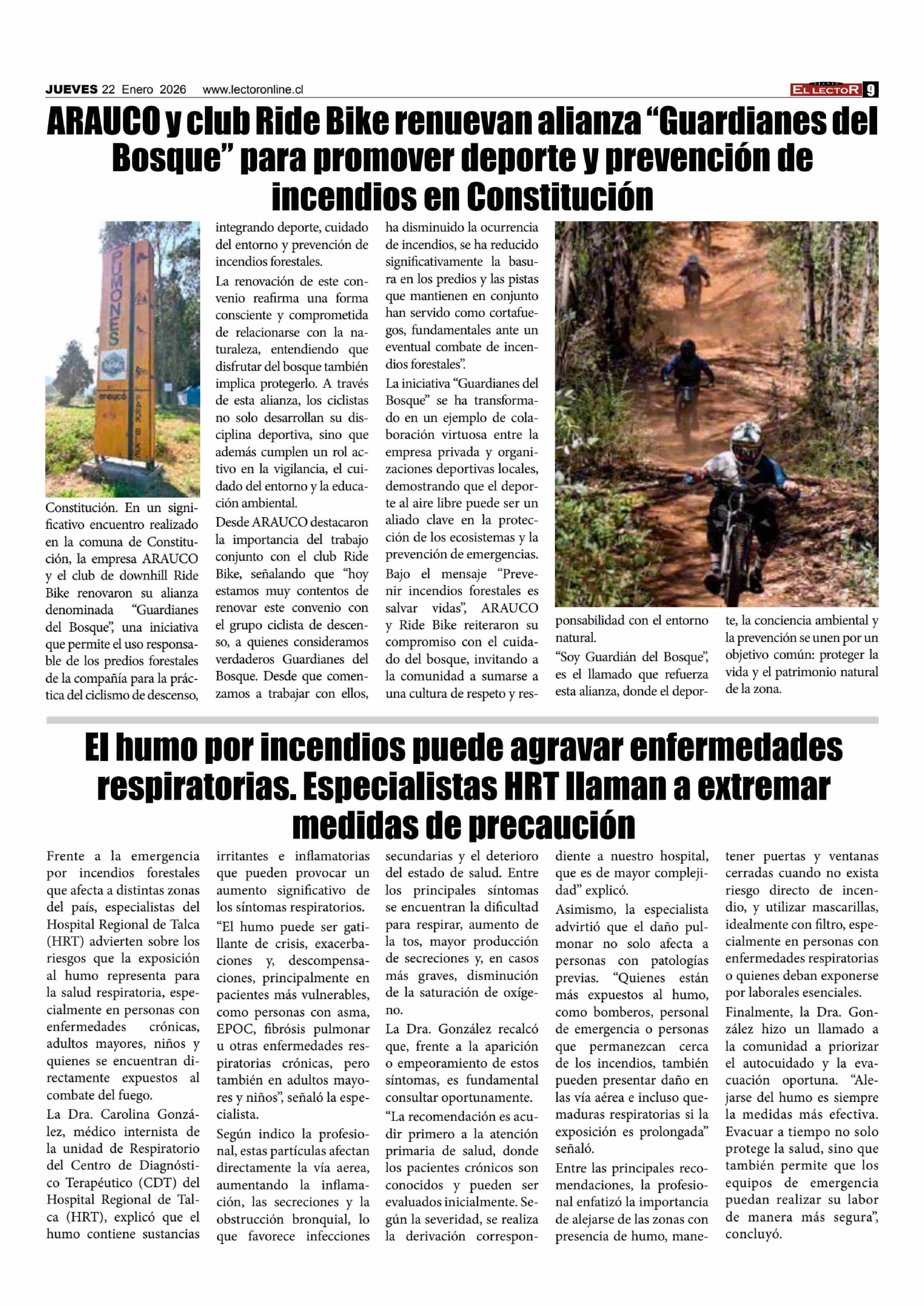 Título: ARAUCO y club Ride Bike renuevan alianza "Guardianes del Bosque" para promover deporte y prevención de incendios en Constitución