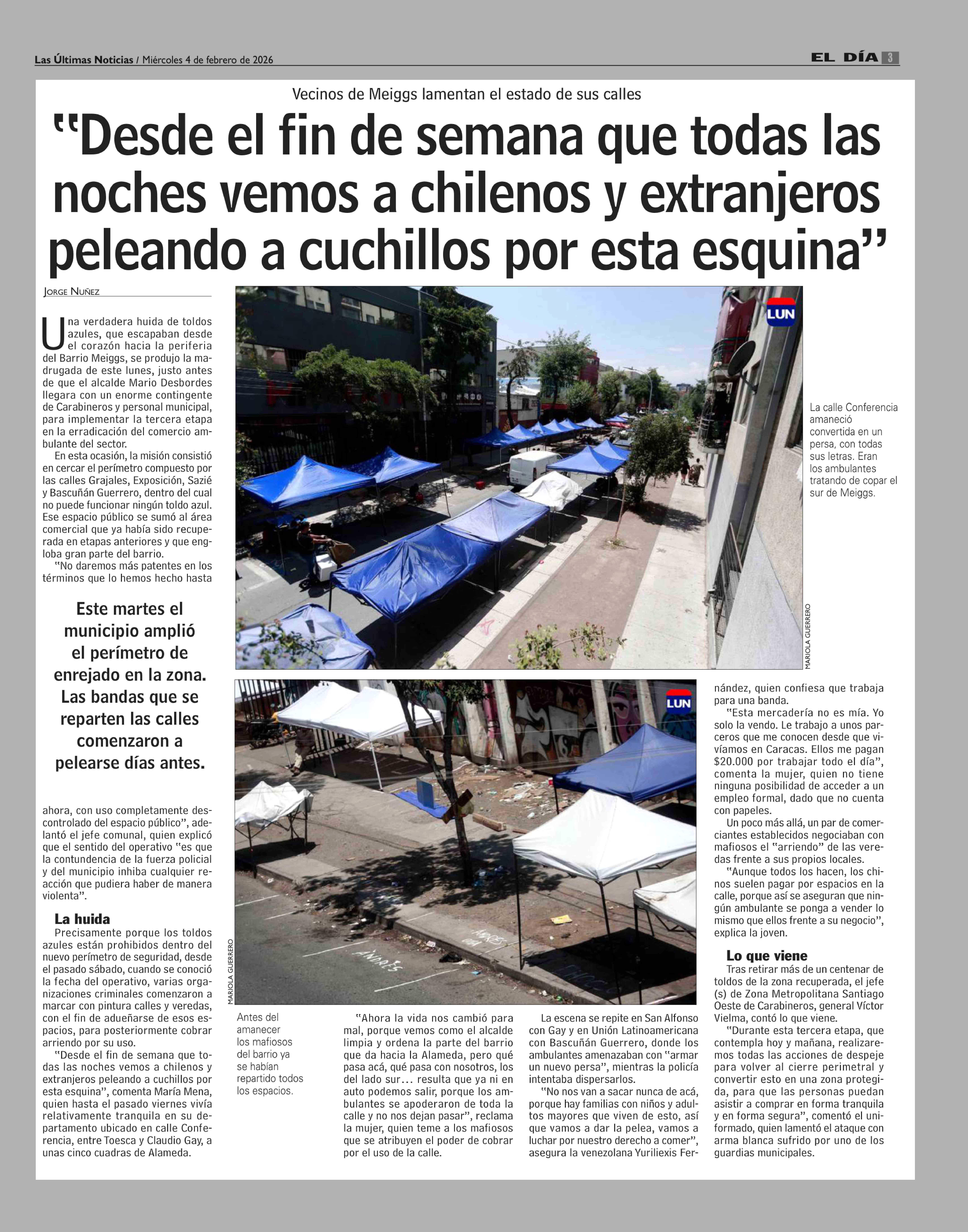 "Desde el fin de semana que todas las noches vemos a chilenos y extranjeros peleando a cuchillos por esta esquina" 04-02-2026 Las Últimas Noticias |