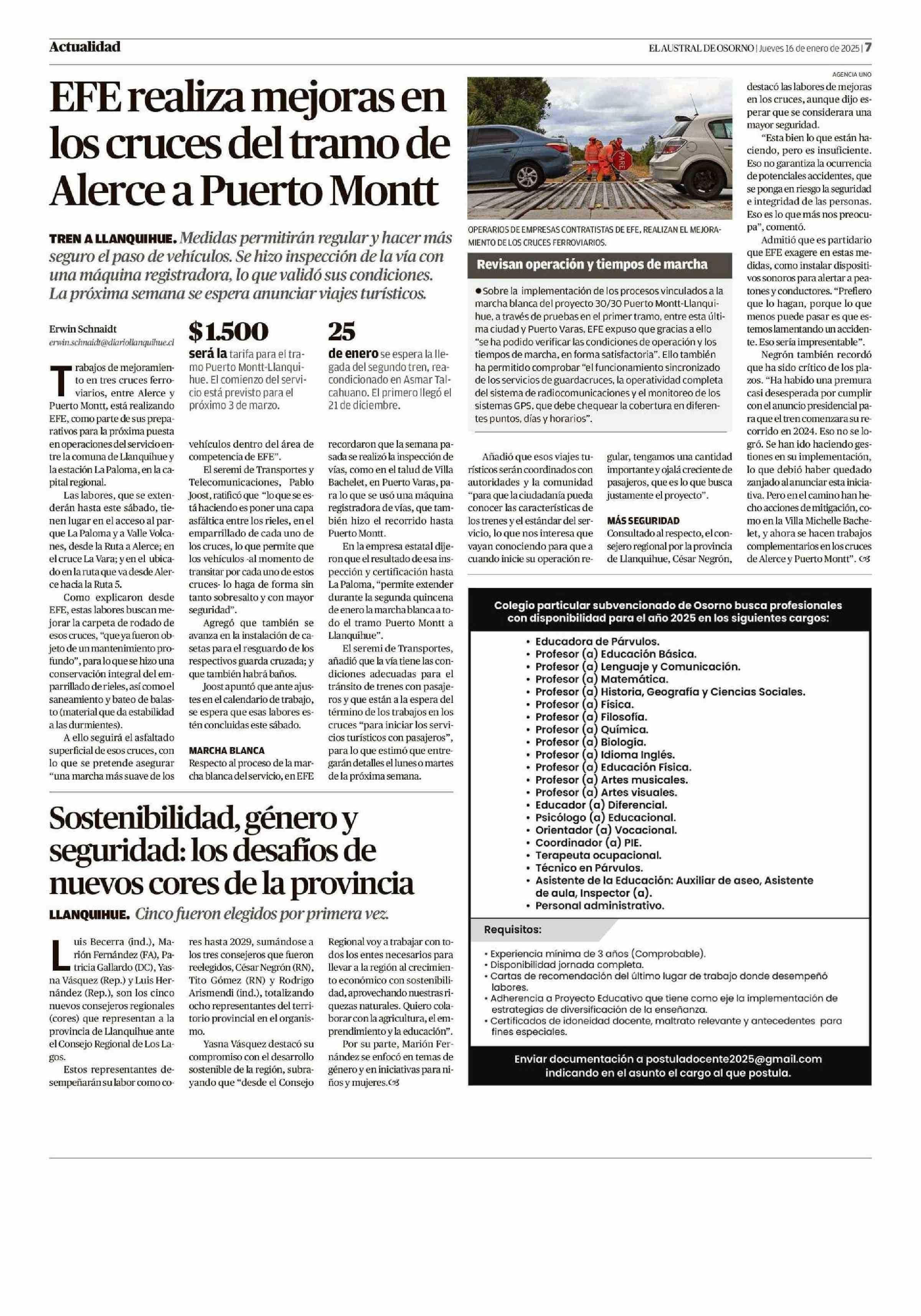 EFE realiza mejoras en los cruces del tramo de Alerce a Puerto Montt 16-01-2025 El Austral de Osorno |