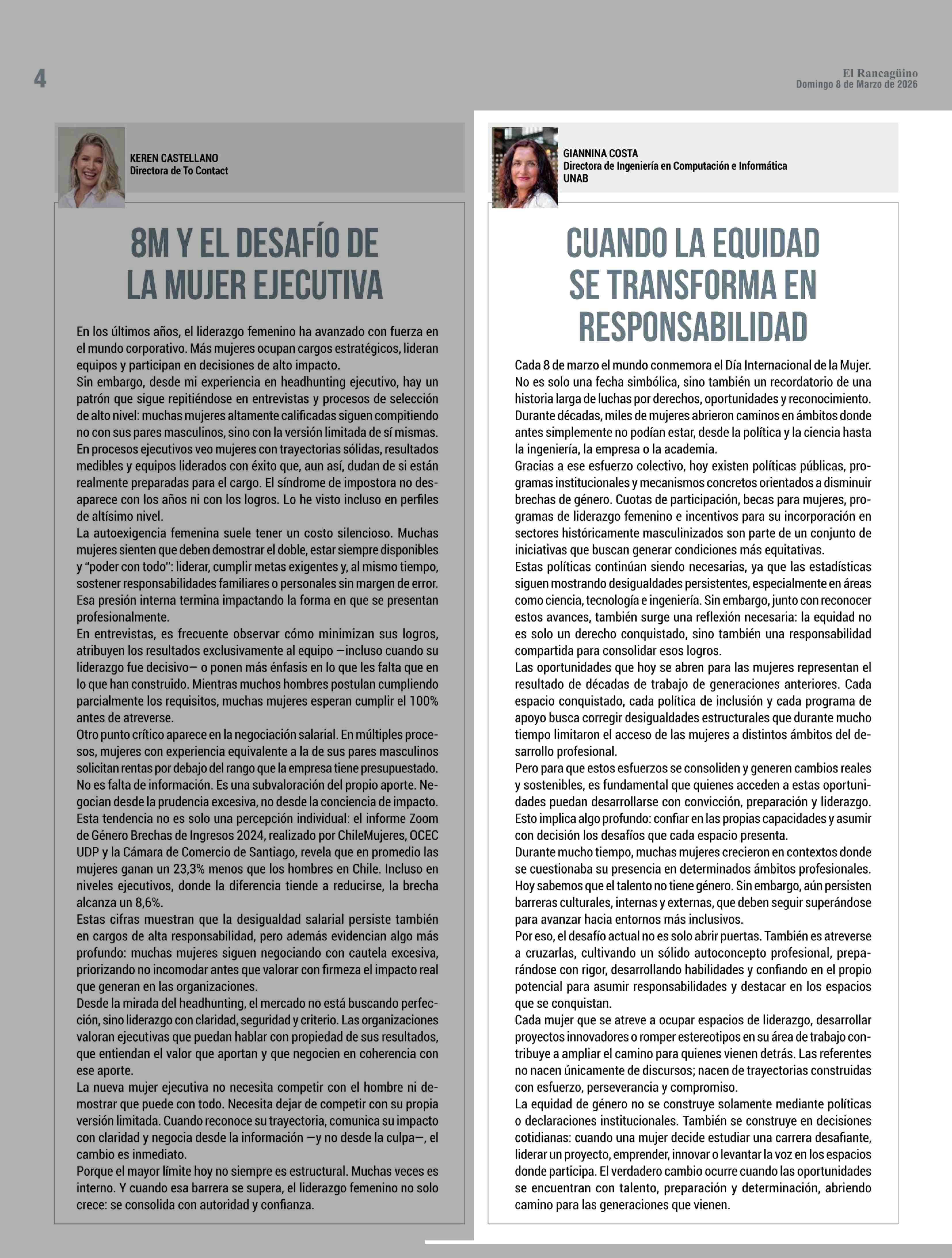 CUANDO LA EQUIDAD SE TRANSFORMA EN RESPONSABILIDAD 08-03-2026 El Rancagüino |