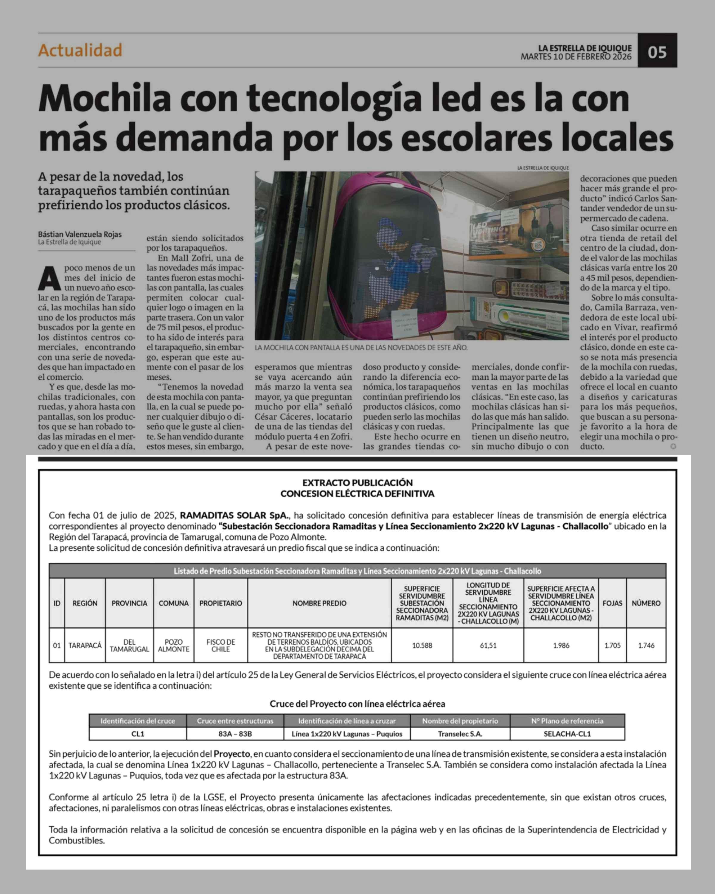 Extractos: EXTRACTO PUBLICACIÓN CONCESION ELÉCTRICA DEFINITIVA 10-02-2026 La Estrella de Iquique |