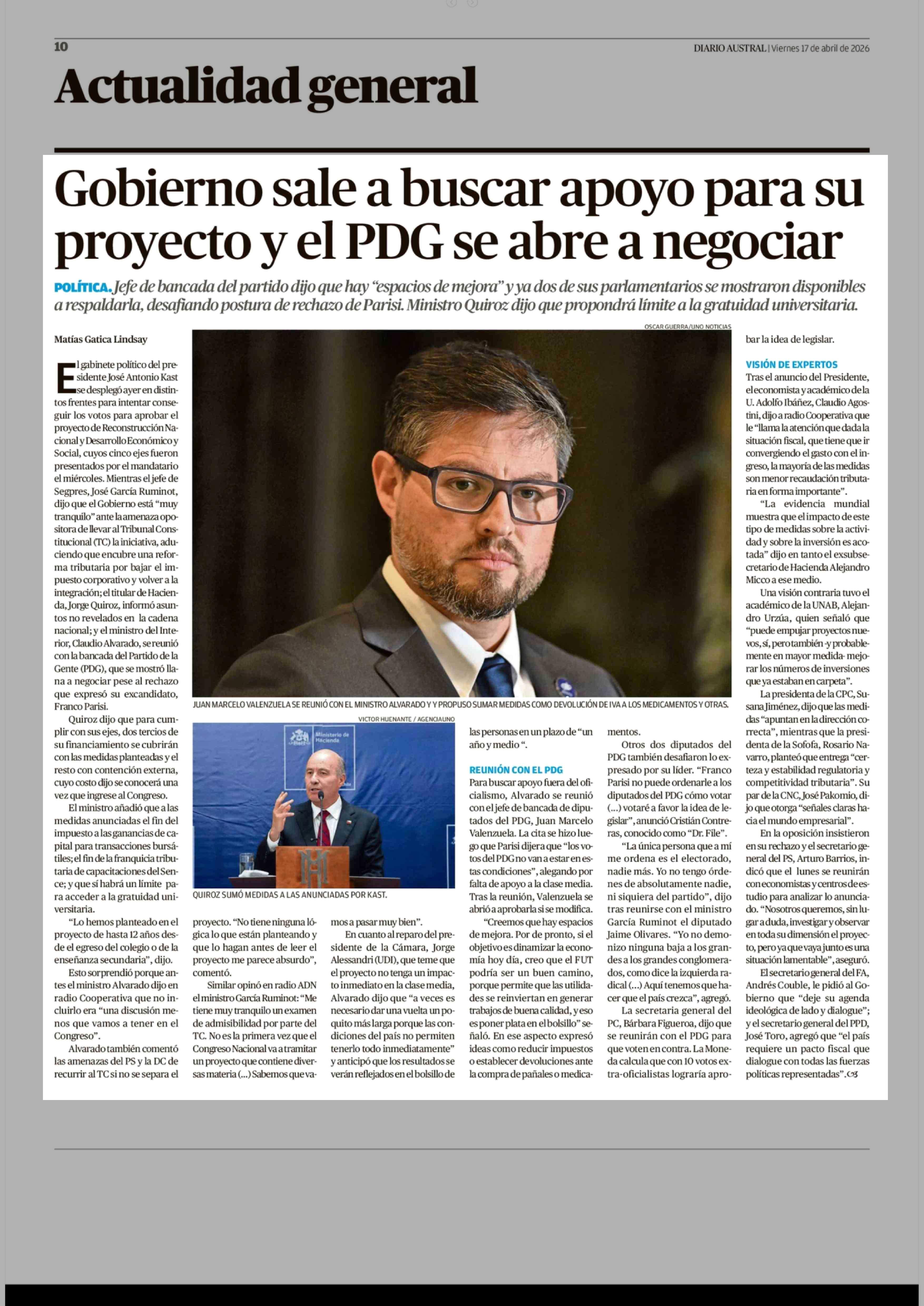 Gobierno sale a buscar apoyo para su proyecto y el PDG se abre a negociar 17-04-2026 Diario Austral Región de Los Ríos |