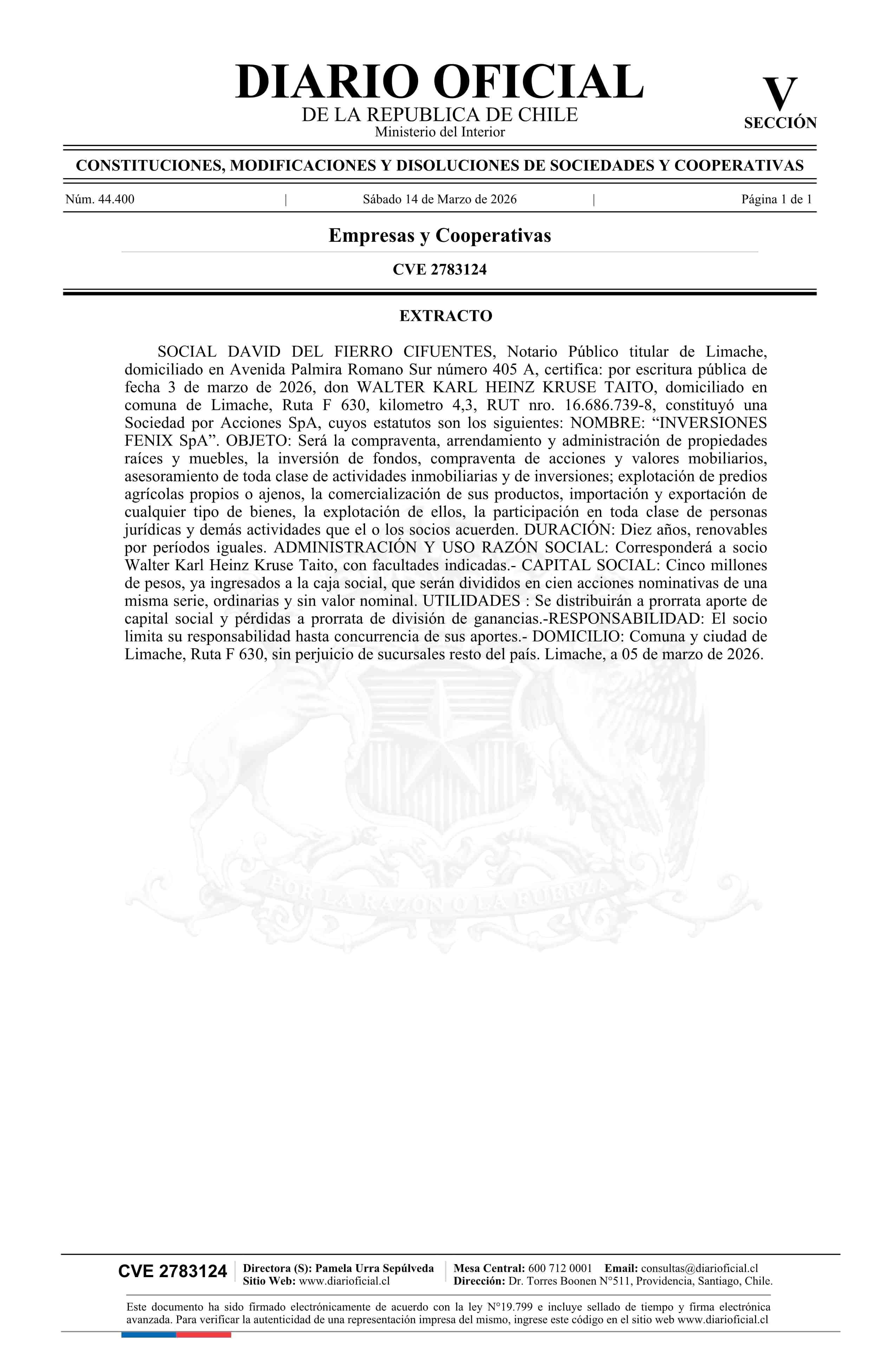 INVERSIONES FENIX SpA 14-03-2026 Diario Oficial Edición Electrónica |