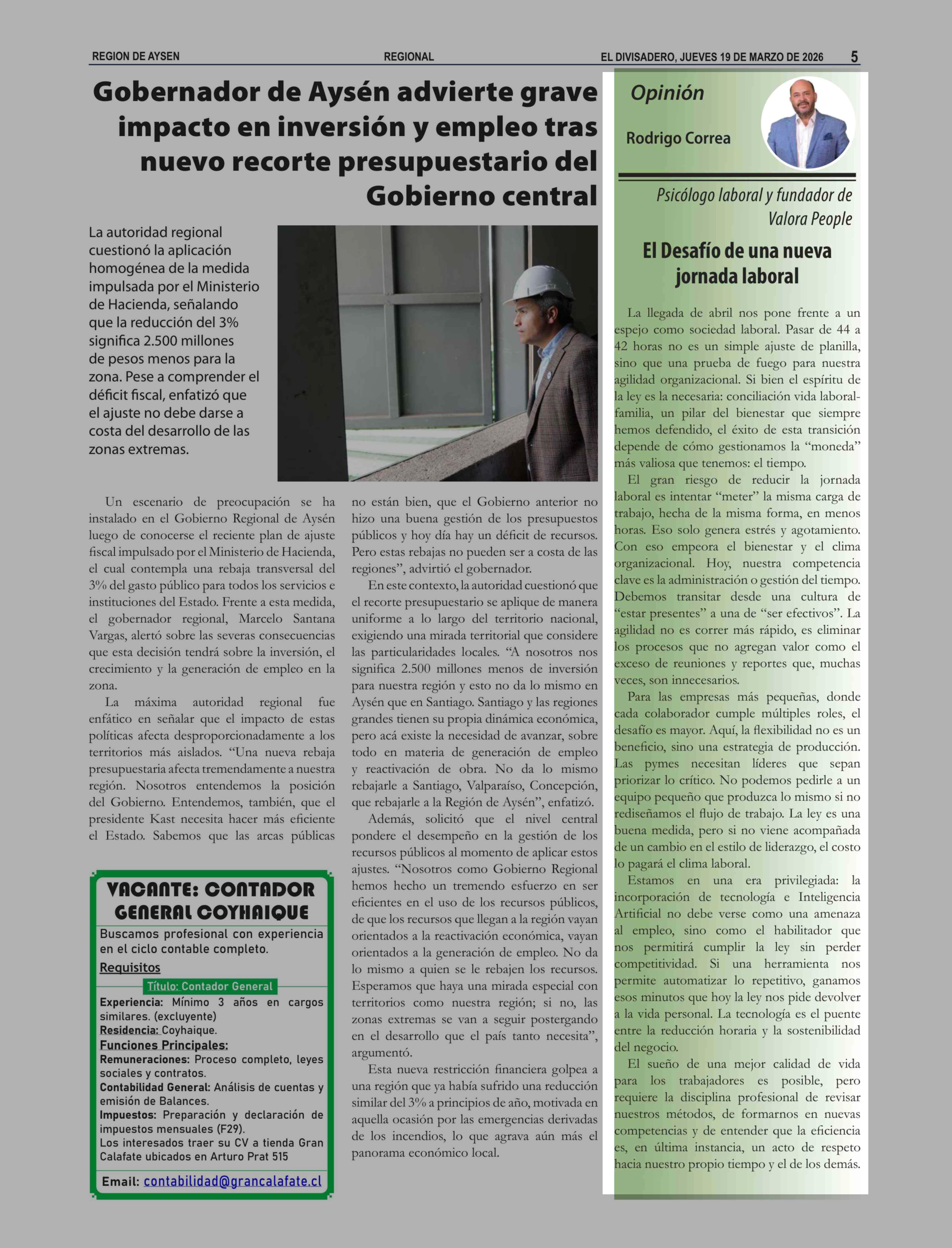Columnas de Opinión: El Desafío de una nueva jornada laboral 19-03-2026 El Divisadero |