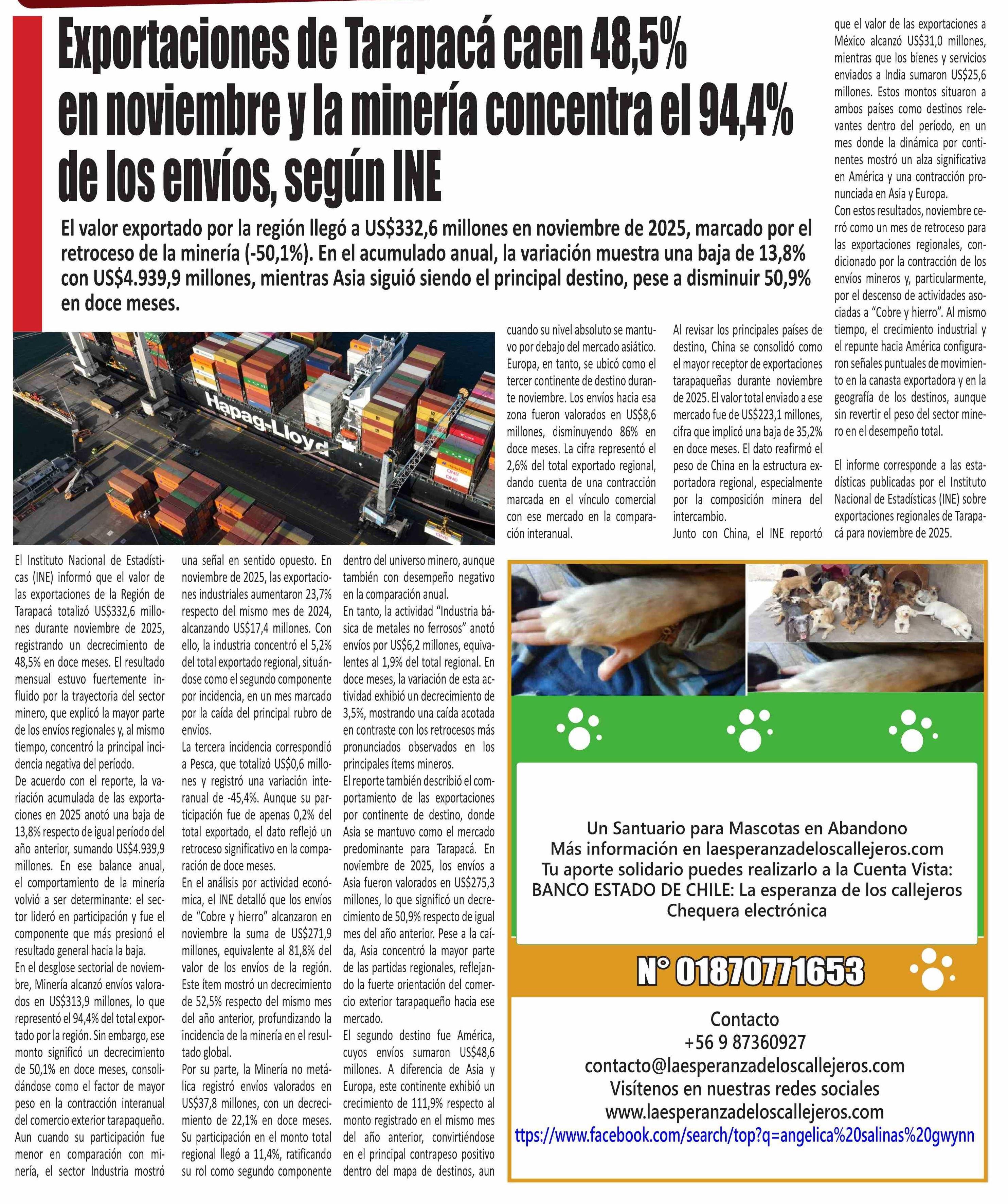 | Título: | Exportaciones de Tarapacá caen 48,5% en noviembre y la minería concentra el 94,4% de los envíos, según INE |