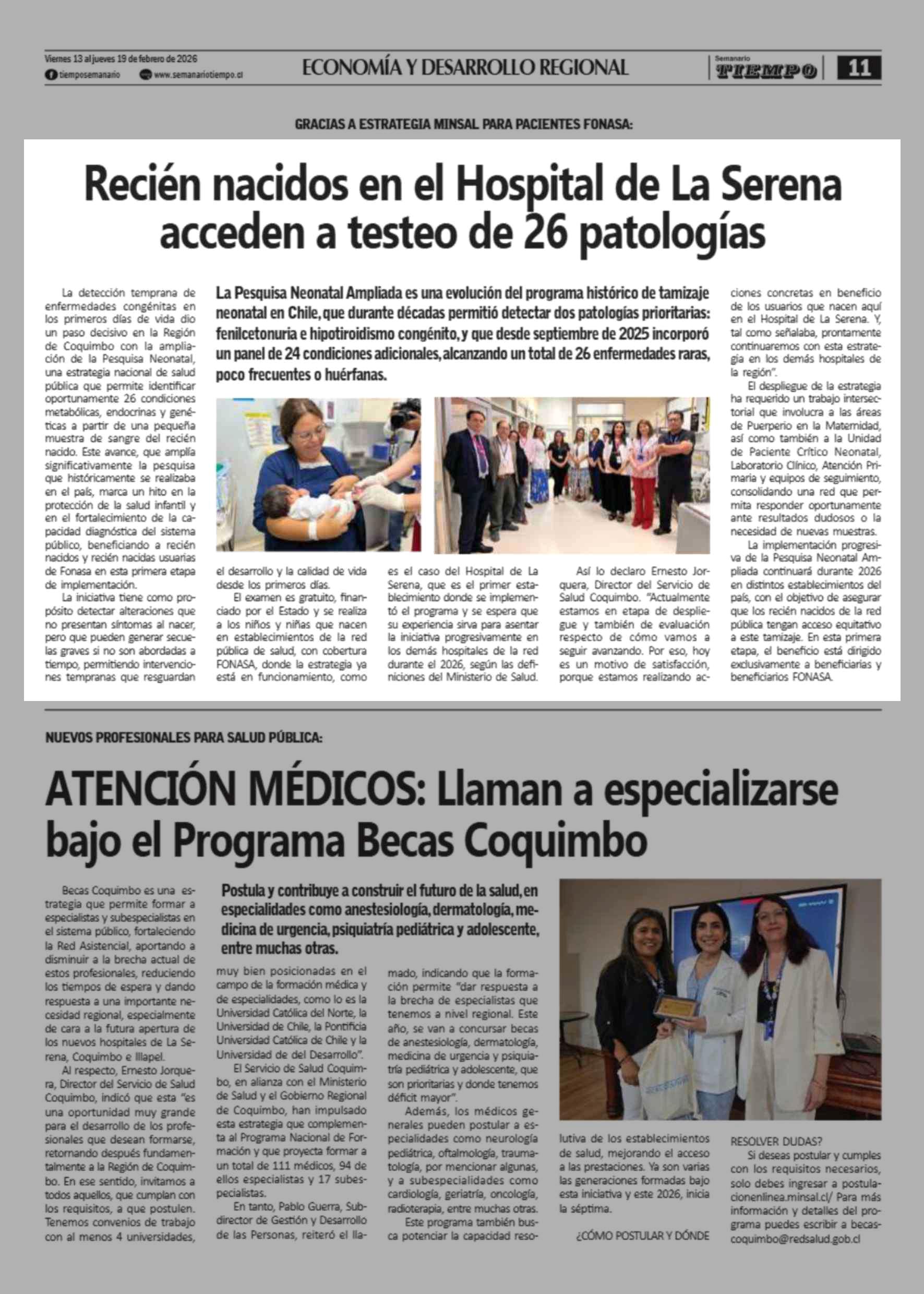 Recién nacidos en el Hospital de La Serena acceden a testeo de 26 patologías 13-02-2026 Semanario Tiempo |