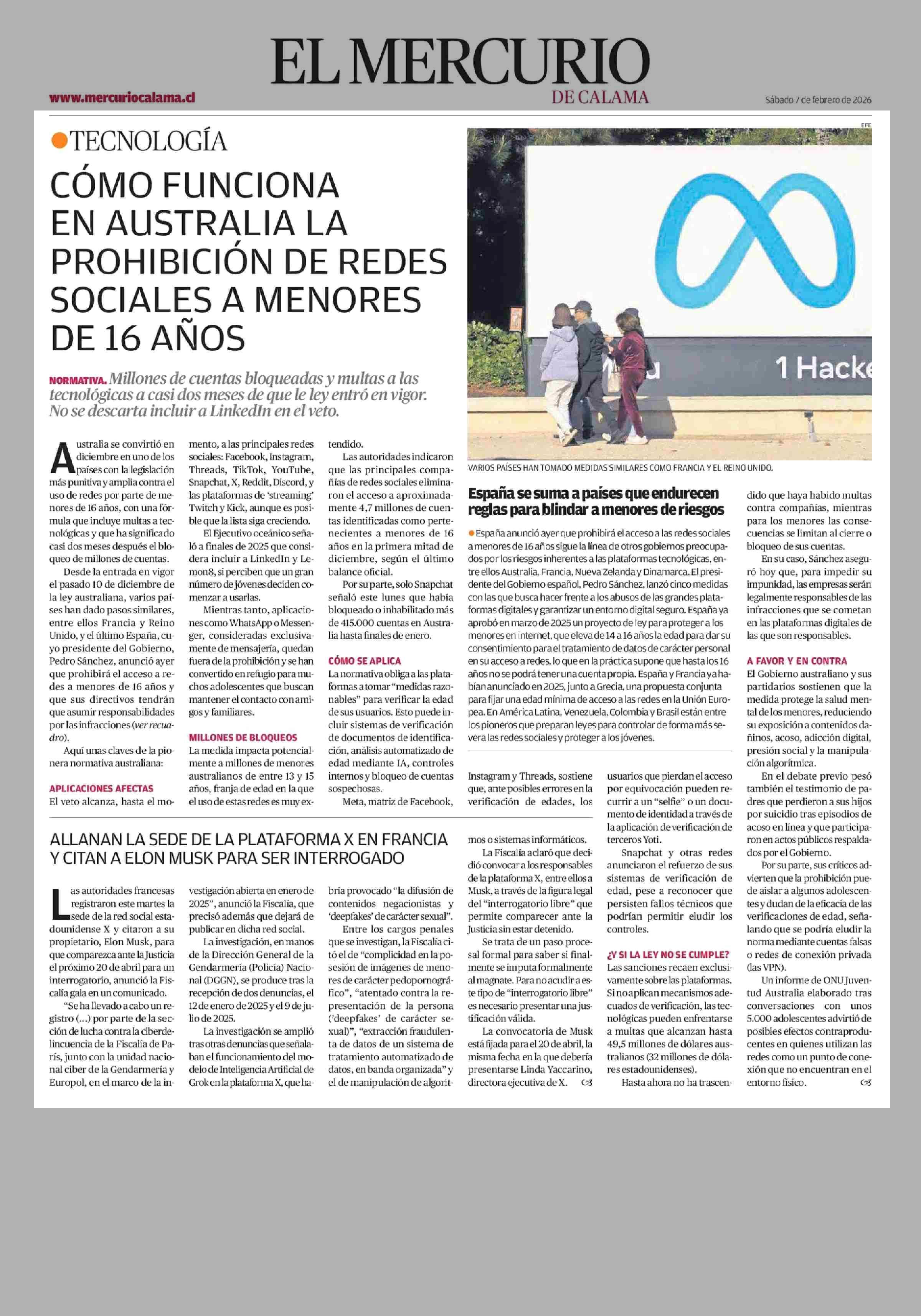 CÓMO FUNCIONA EN AUSTRALIA LA PROHIBICIÓN DE REDES SOCIALES A MENORES DE 16 AÑOS 07-02-2026 El Mercurio de Calama |