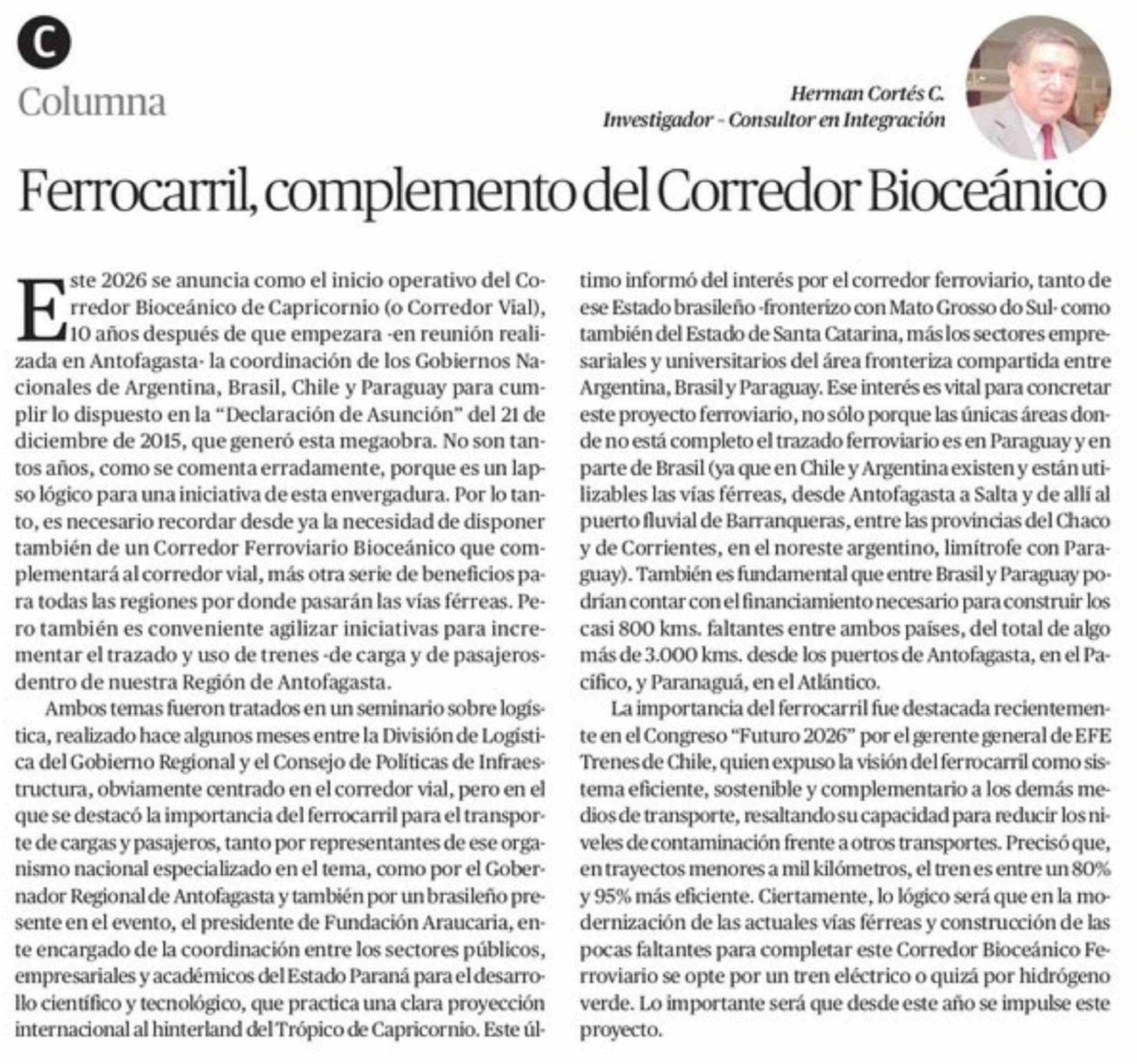 Título: Columnas de Opinión: Ferrocarril, complemento del Corredor Bioceánico