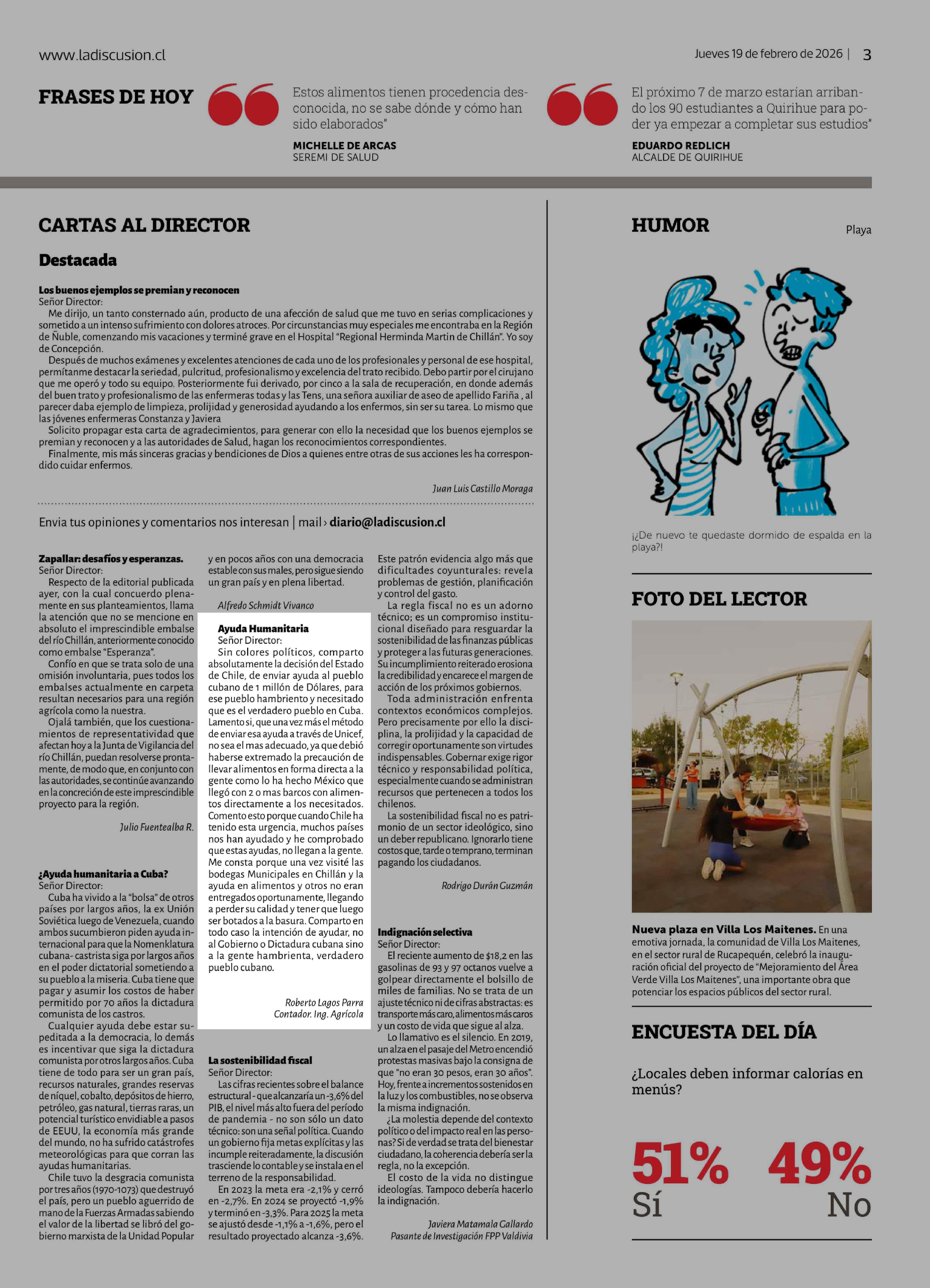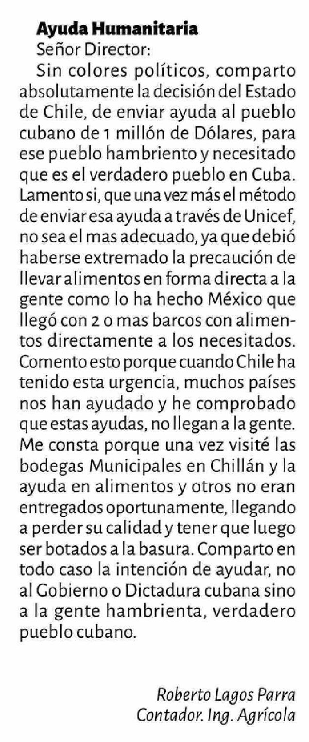 Título: Cartas: Ayuda Humanitaria Señor Director: Sin colores políticos, comparto absolutamente la decisión del Estado de Chile, de enviar ayuda al pueblo cubano de 1 millón de Dólares, para ese pueblo hambriento y necesitado que es el verdadero pueblo en Cuba. Lamento si, que una vez más el método de envia