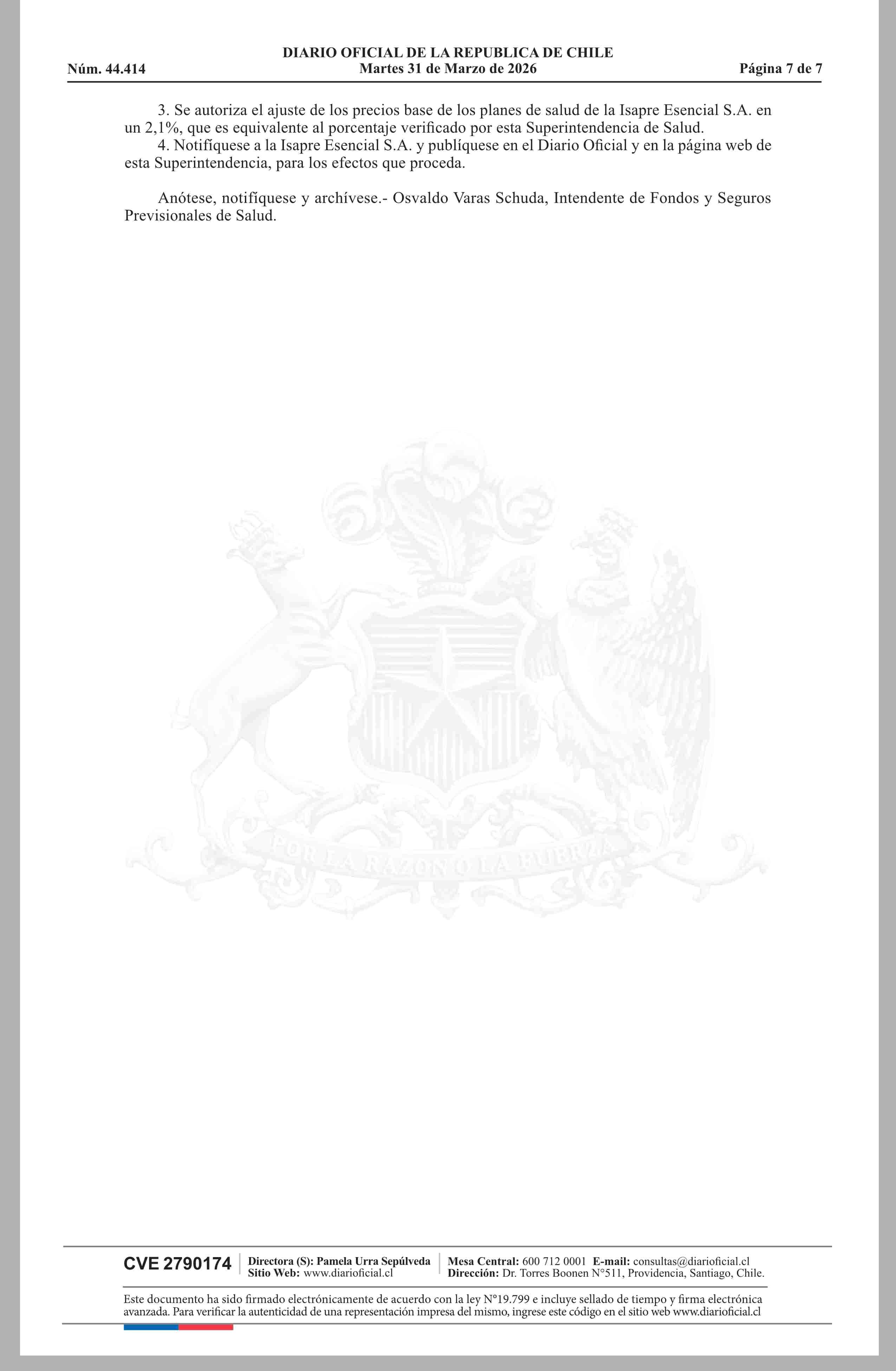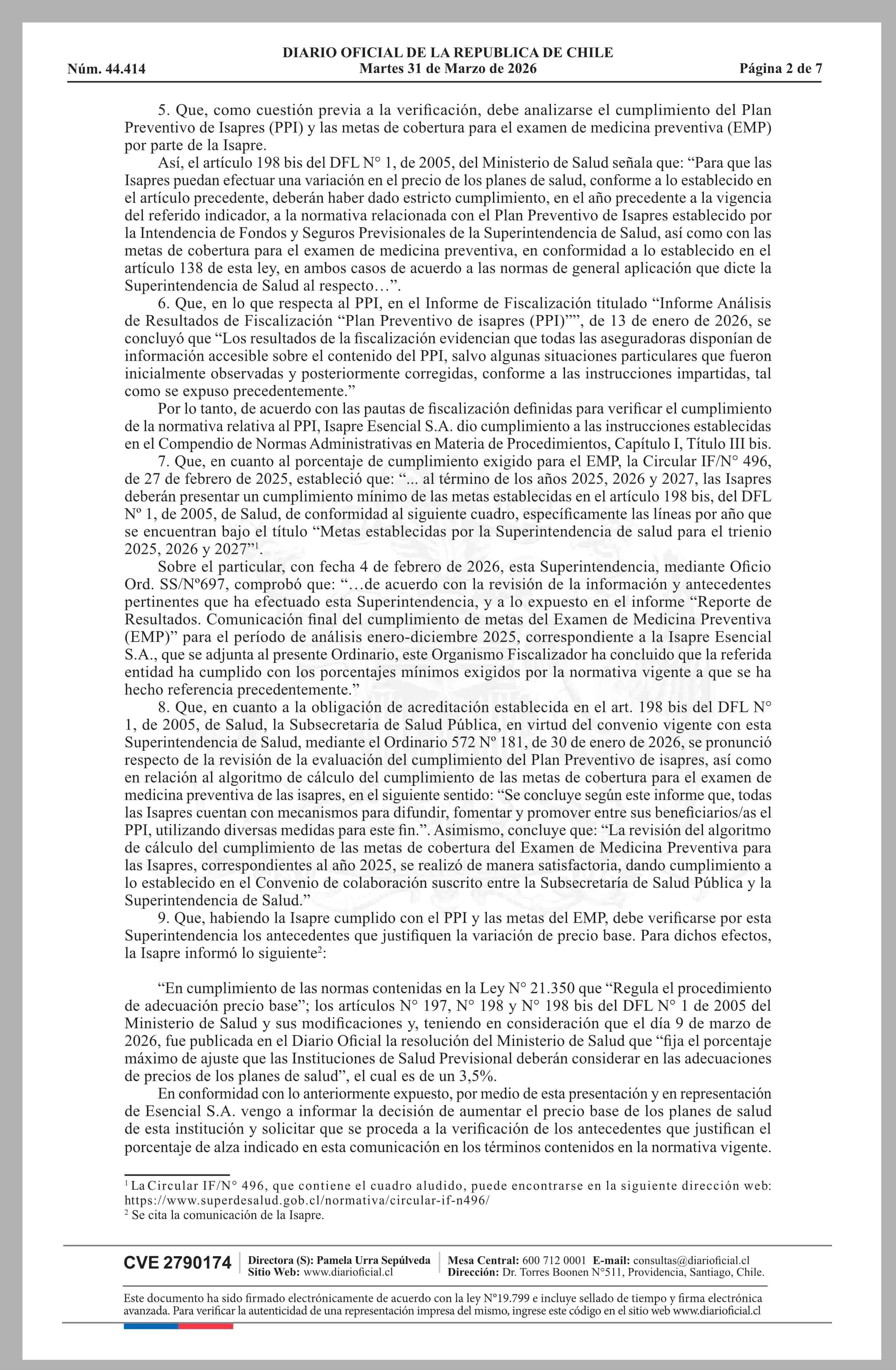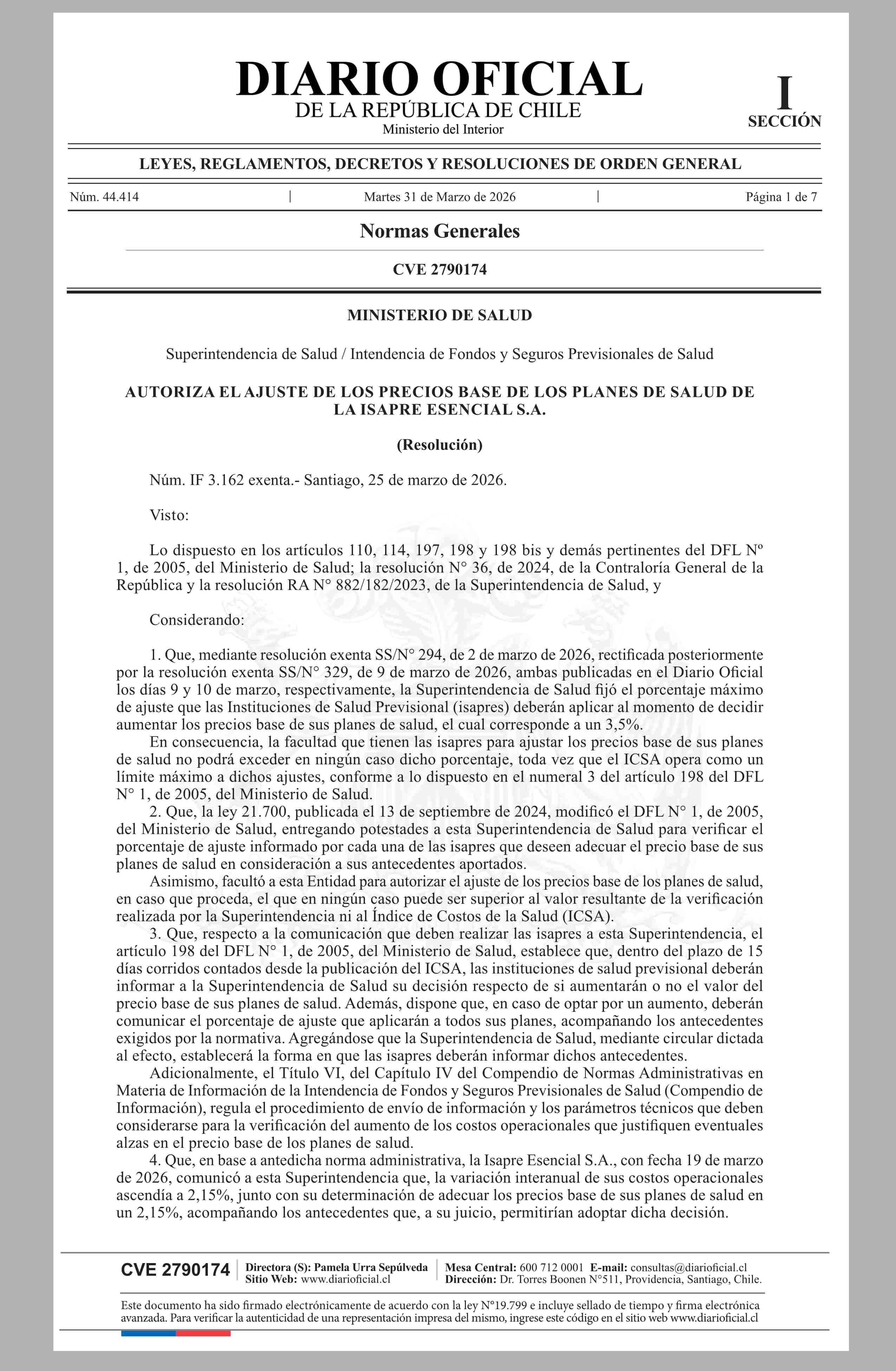 | Título: | MINISTERIO DE SALUD Superintendencia de Salud / Intendencia de Fondos y Seguros Previsionales de Salud AUTORIZA EL AJUSTE DE LOS PRECIOS BASE DE LOS PLANES DE SALUD DE LA ISAPRE ESENCIAL S.A. |