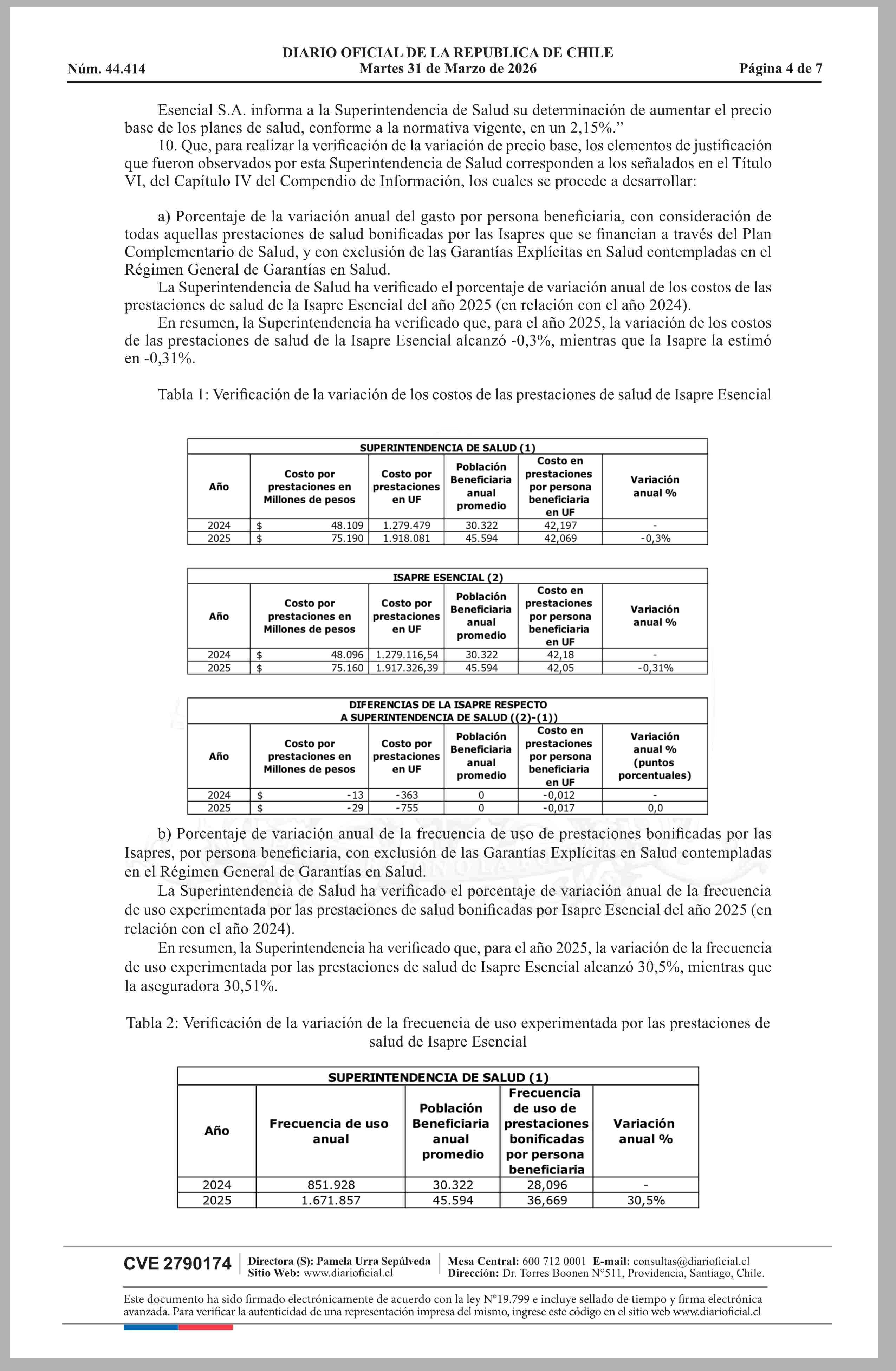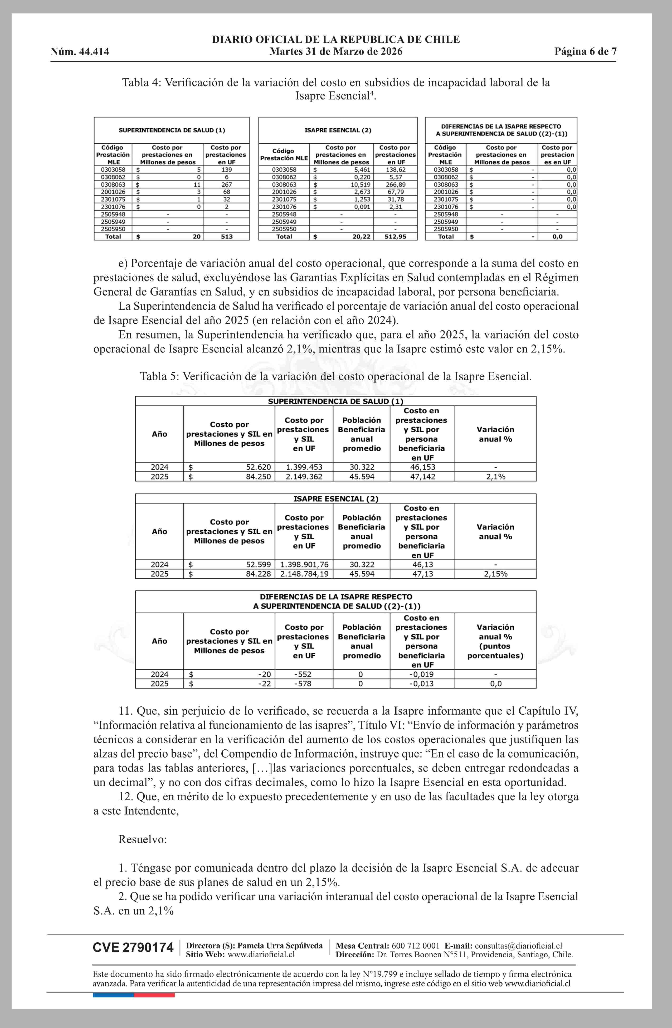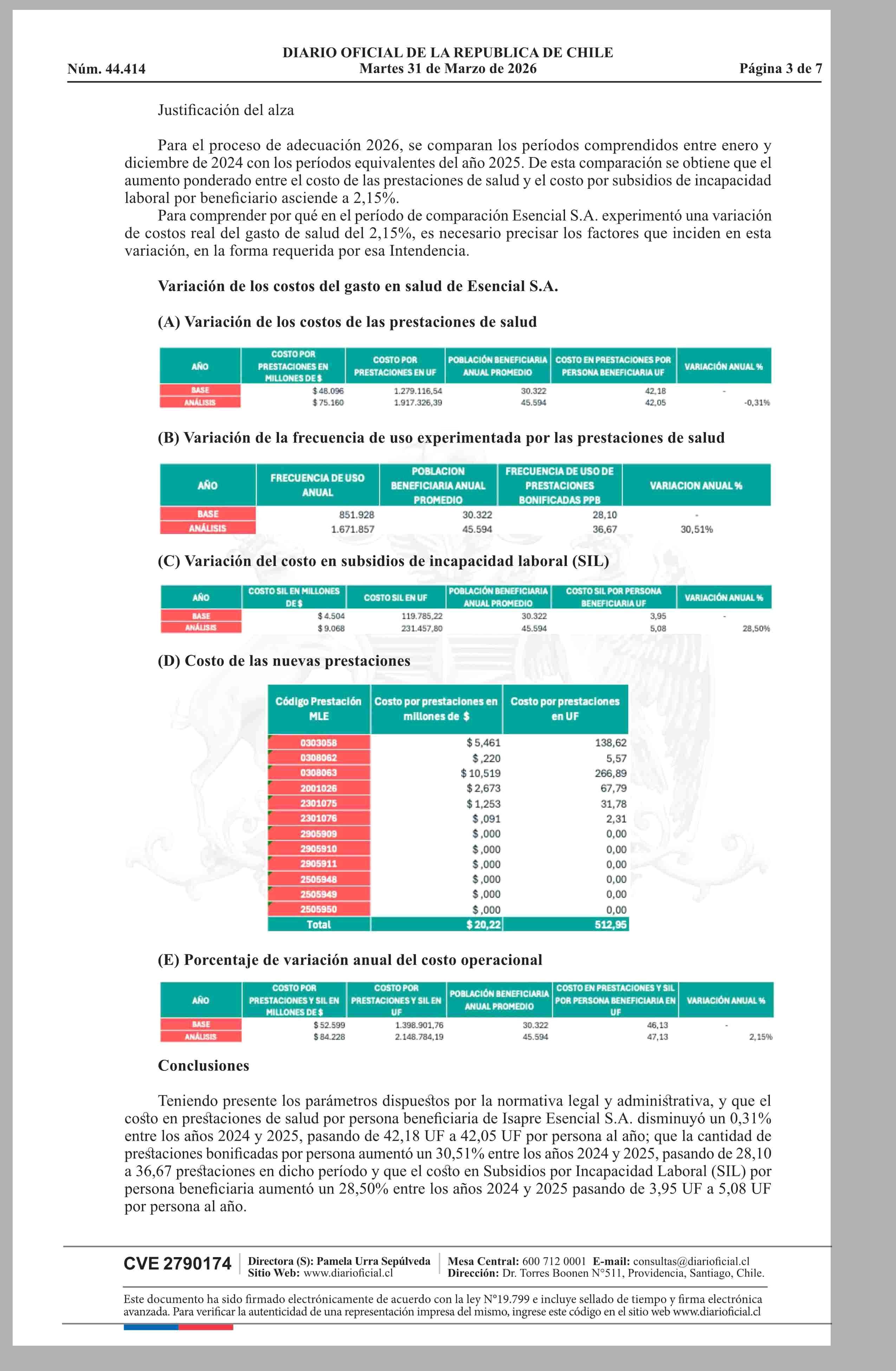 | Título: | MINISTERIO DE SALUD Superintendencia de Salud / Intendencia de Fondos y Seguros Previsionales de Salud AUTORIZA EL AJUSTE DE LOS PRECIOS BASE DE LOS PLANES DE SALUD DE LA ISAPRE ESENCIAL S.A. |