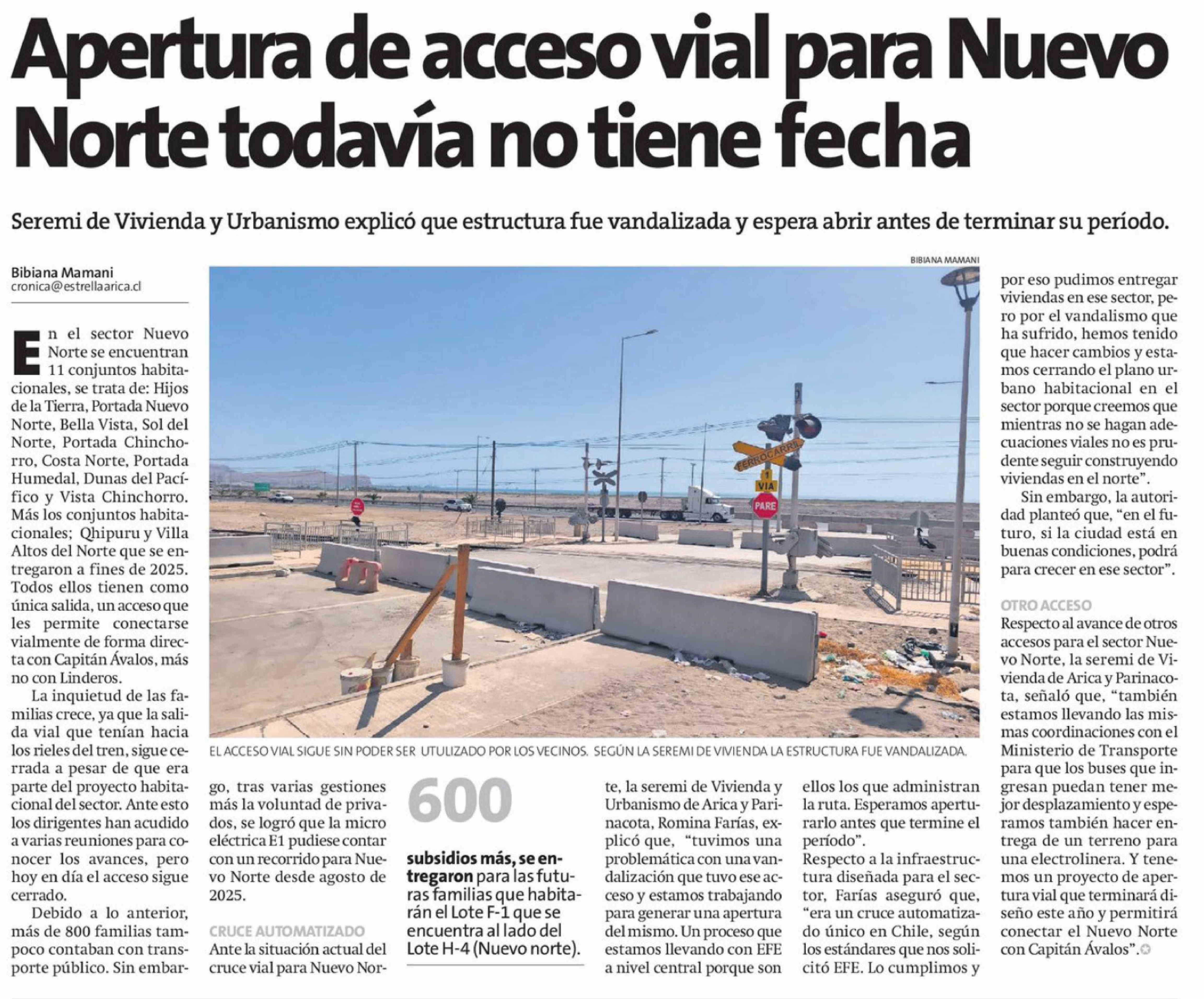 Título: Apertura de acceso vial para Nuevo Norte todavía no tiene fecha