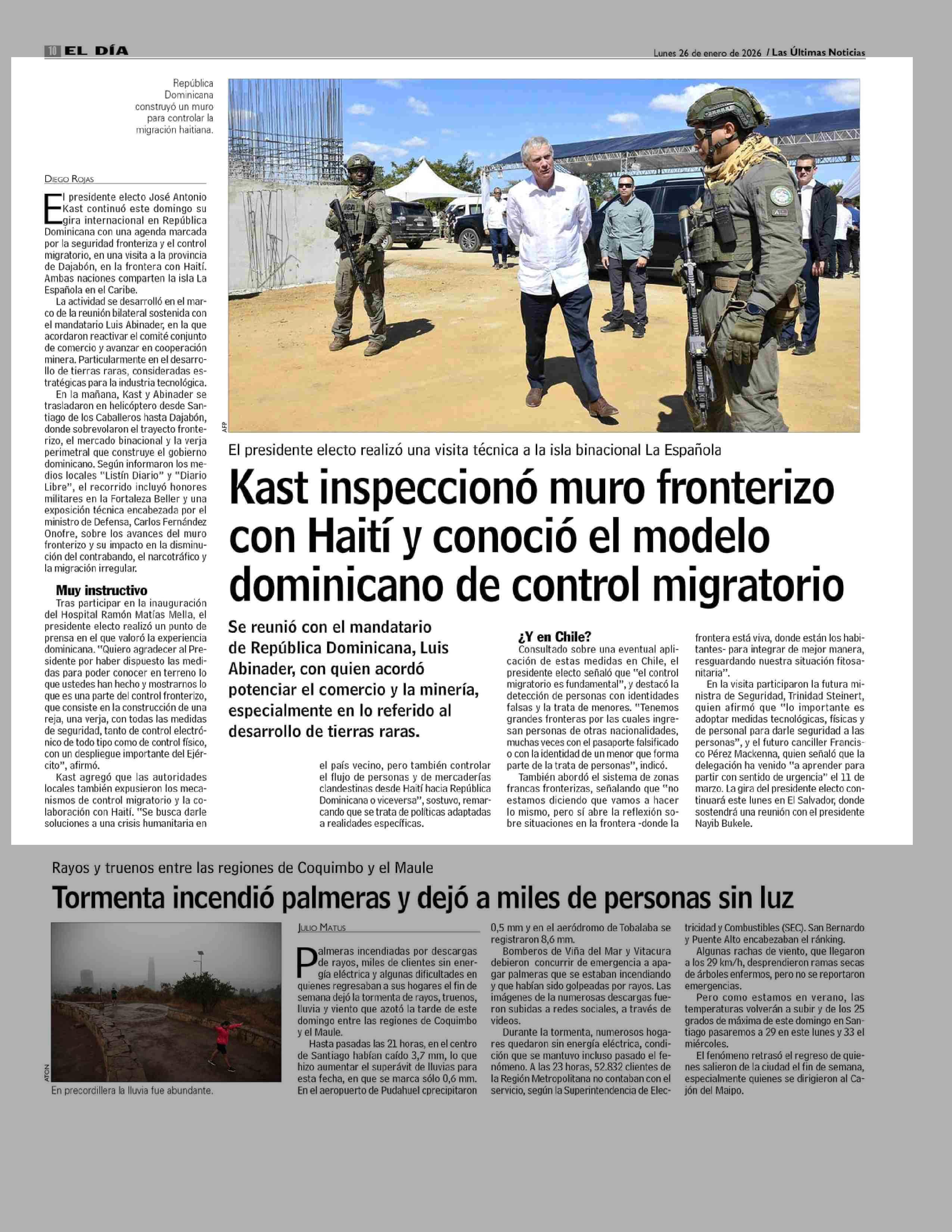 Kast inspeccionó muro fronterizo con Haití y conoció el modelo dominicano de control migratorio 26-01-2026 Las Últimas Noticias |