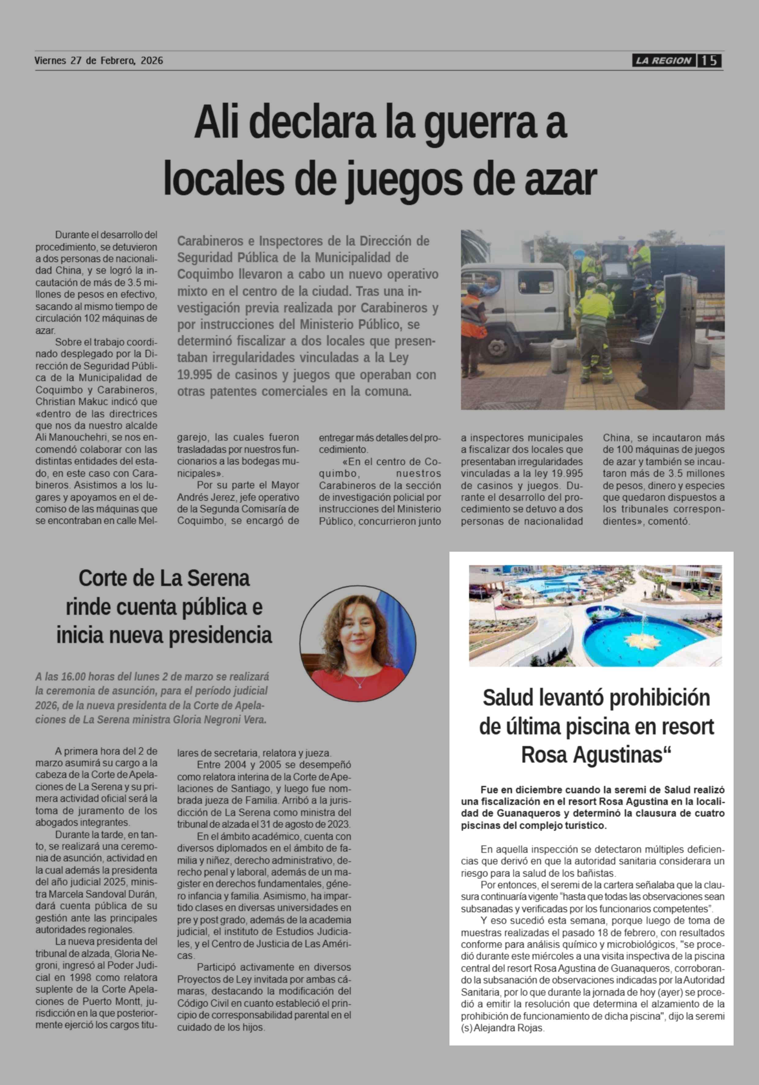 Salud levantó prohibición de última piscina en resort Rosa Agustinas“ 27-02-2026 Diario la Región |