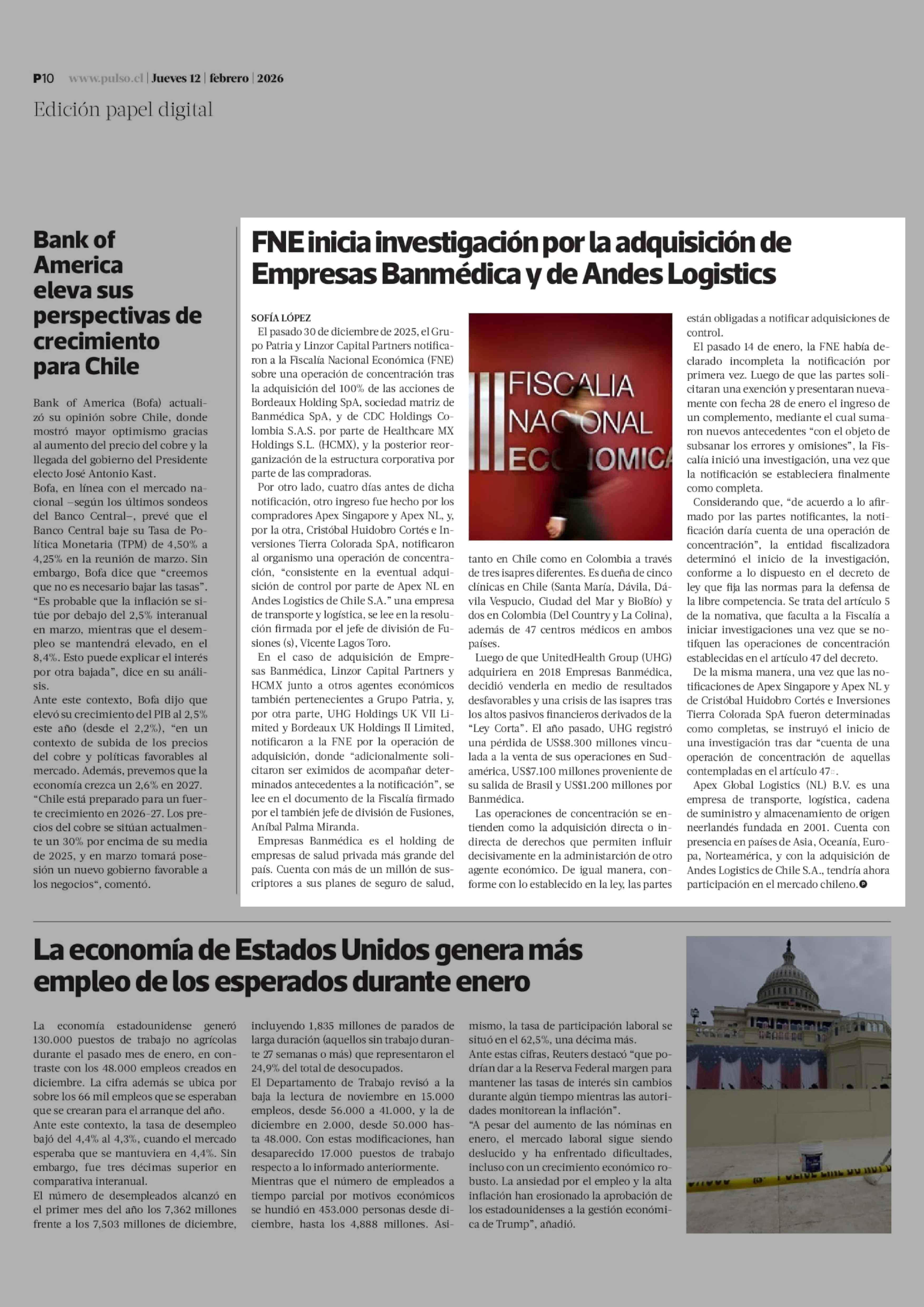 FNE inicia investigación por la adquisición de Empresas Banmédica y de Andes Logistics 12-02-2026 La Tercera |