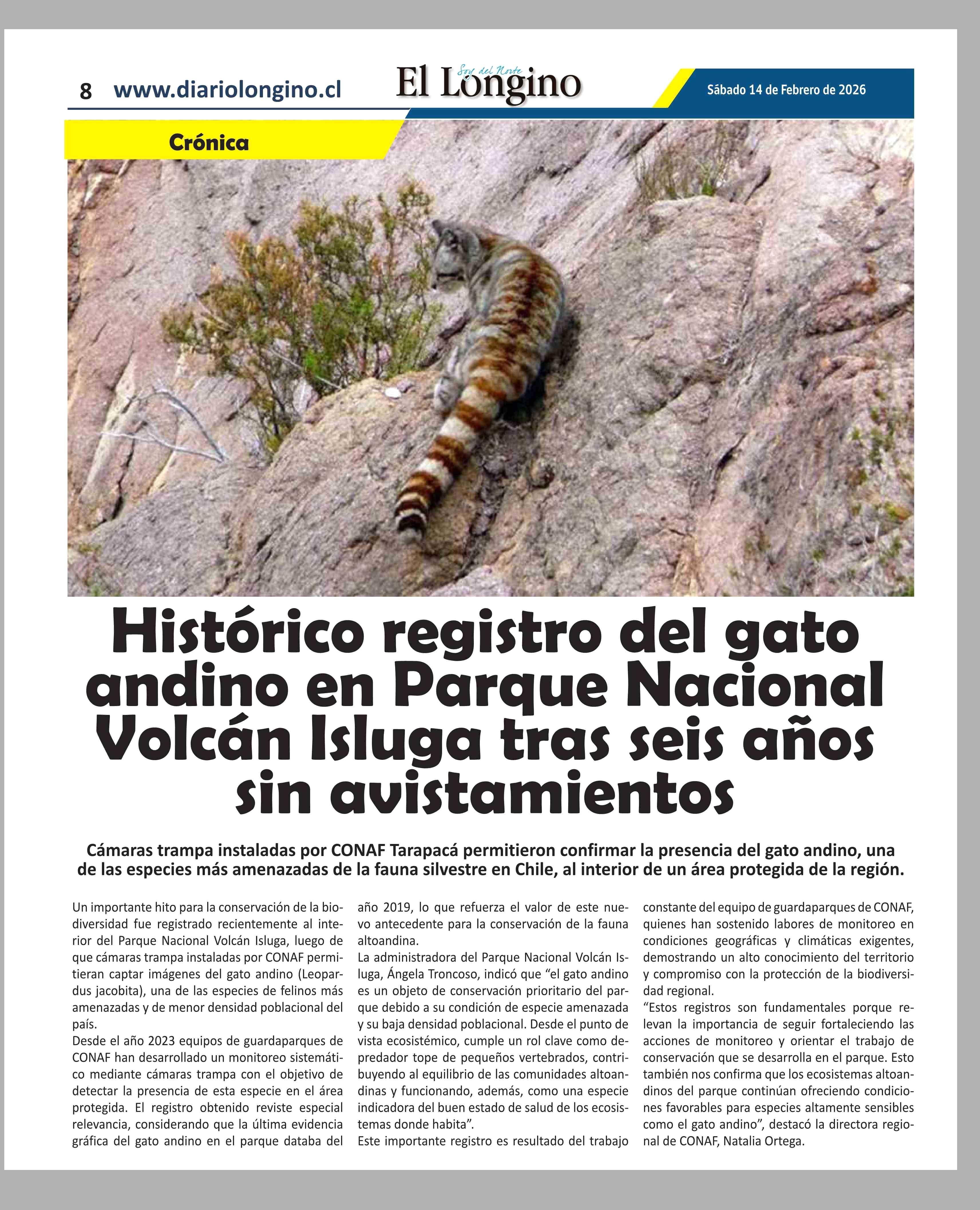 Histórico registro del gato andino en Parque Nacional Volcán Isluga tras seis años sin avistamientos 14-02-2026 El Longino |