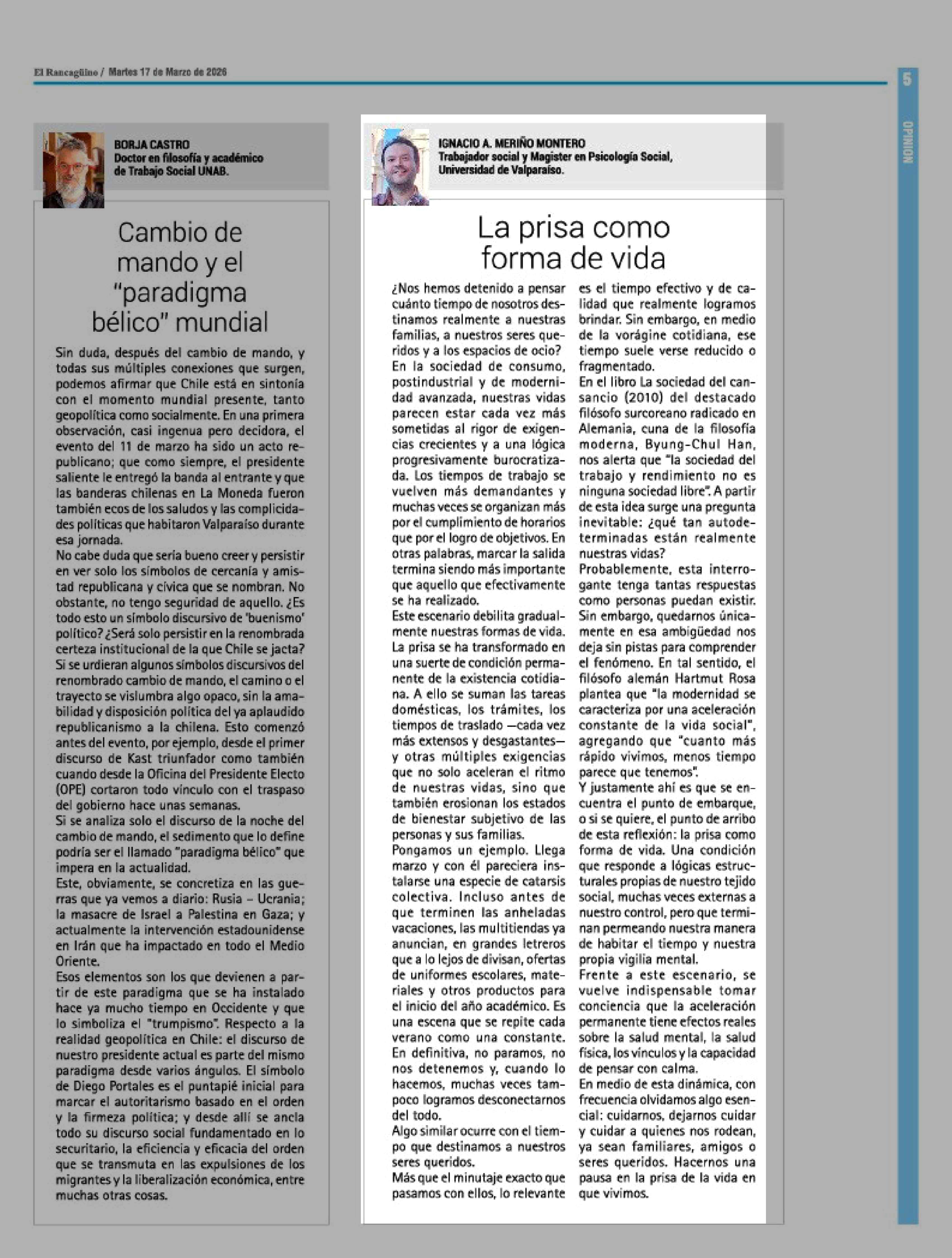 Columnas de Opinión: La prisa como forma de vida 17-03-2026 El Rancagüino |