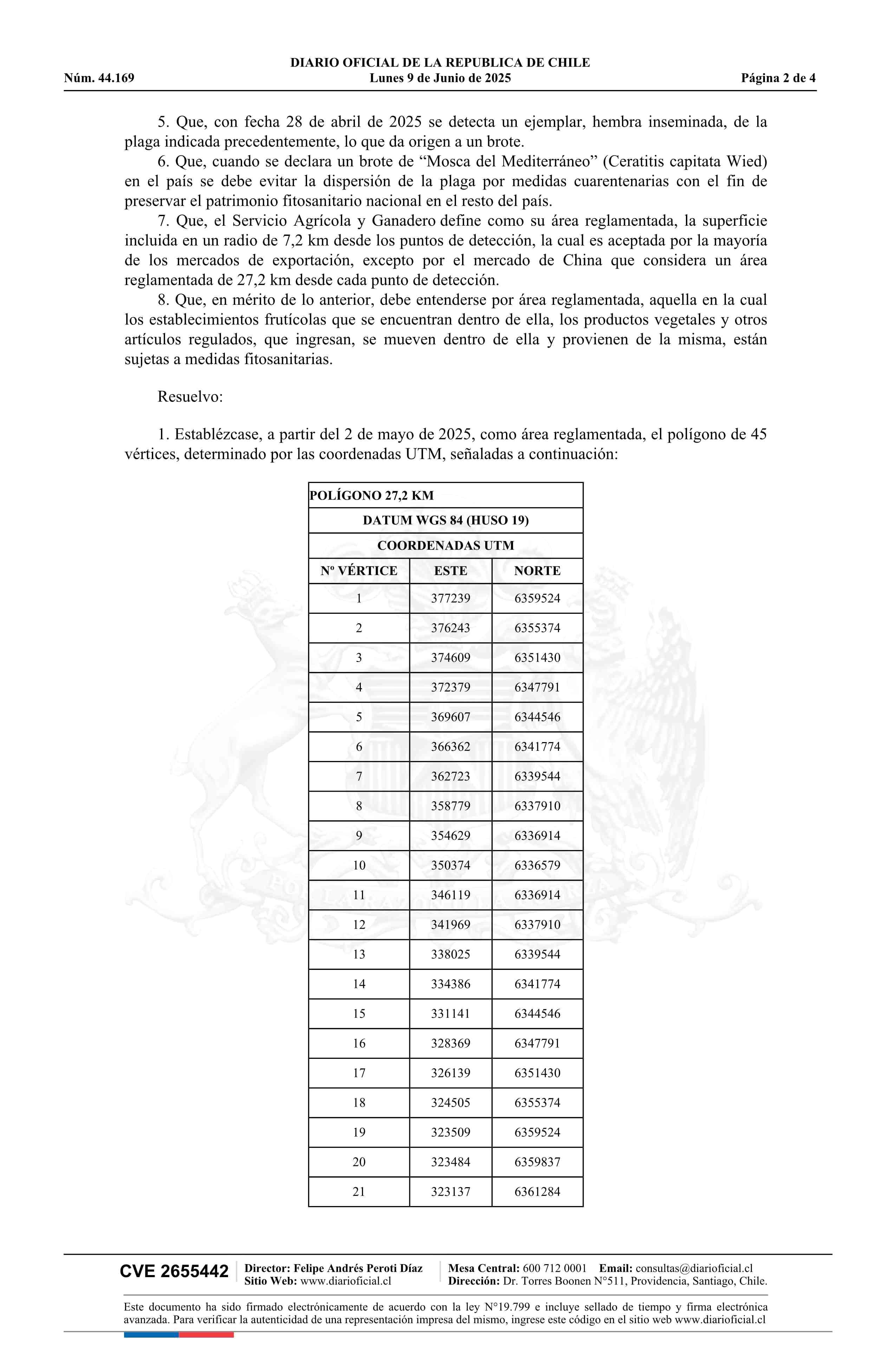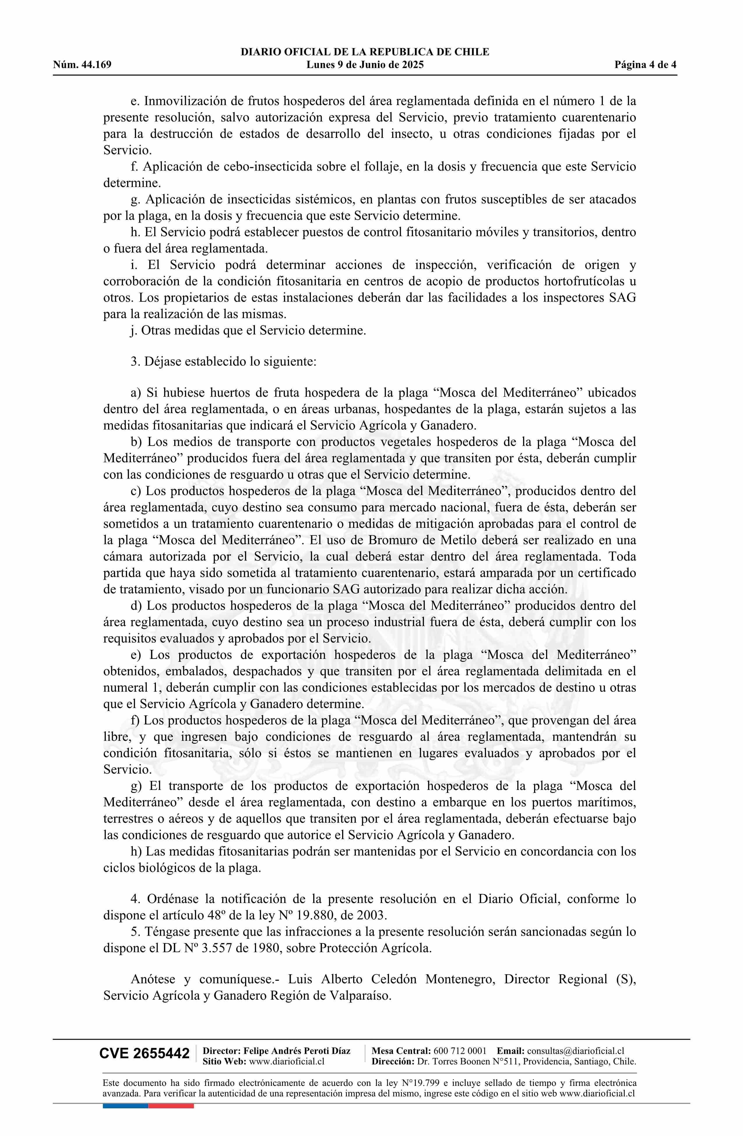 Resolución exenta número 1.171, de 2025.- Establece regulaciones cuarentenarias para el control y erradicación de la Mosca del Mediterráneo (Ceratitis capitata W.) en los lugares que indica 09-06-2025 DIARIO OFICIAL CHILE - BOLETÍN OFICIAL DE MINERÍA |