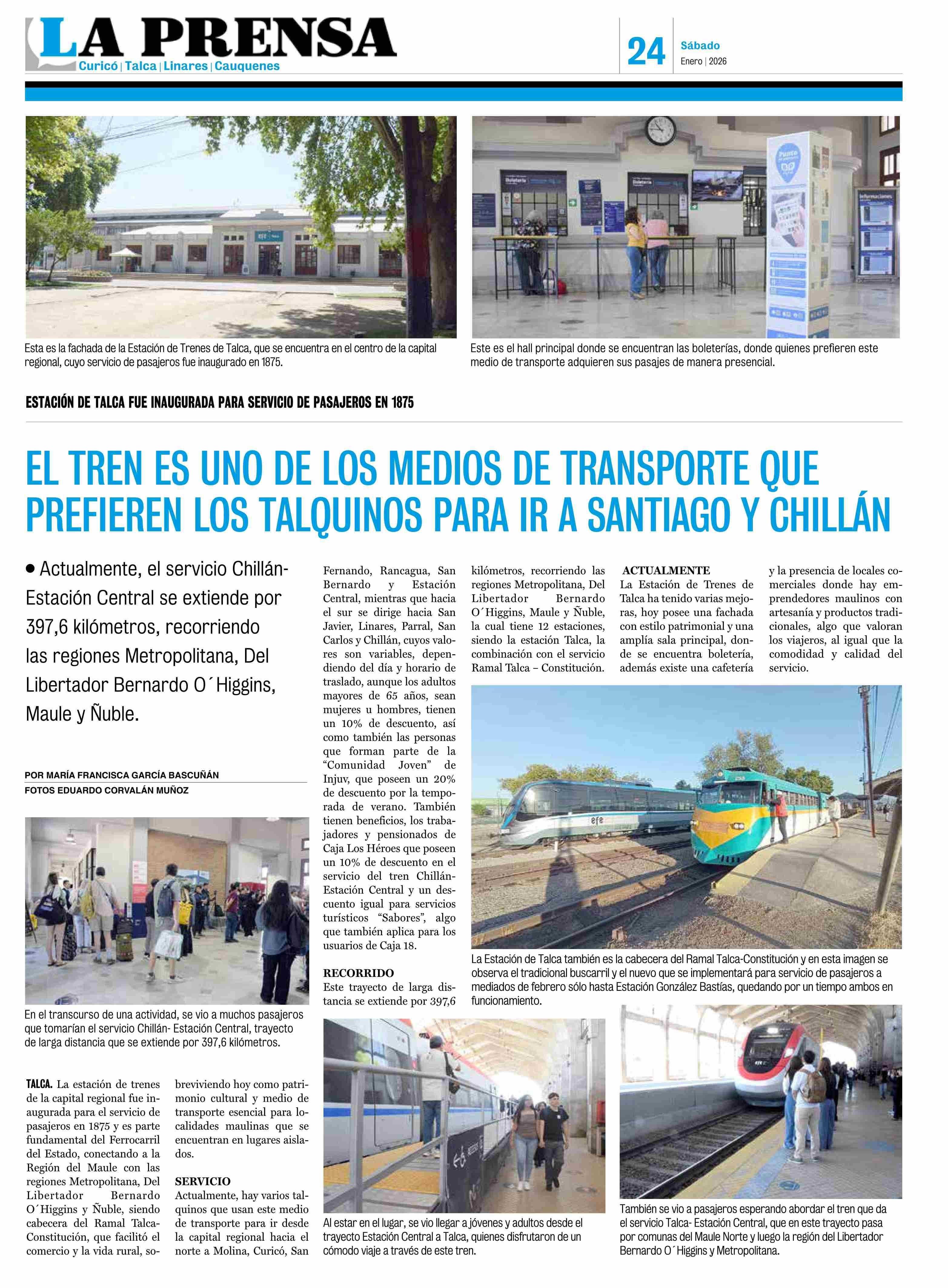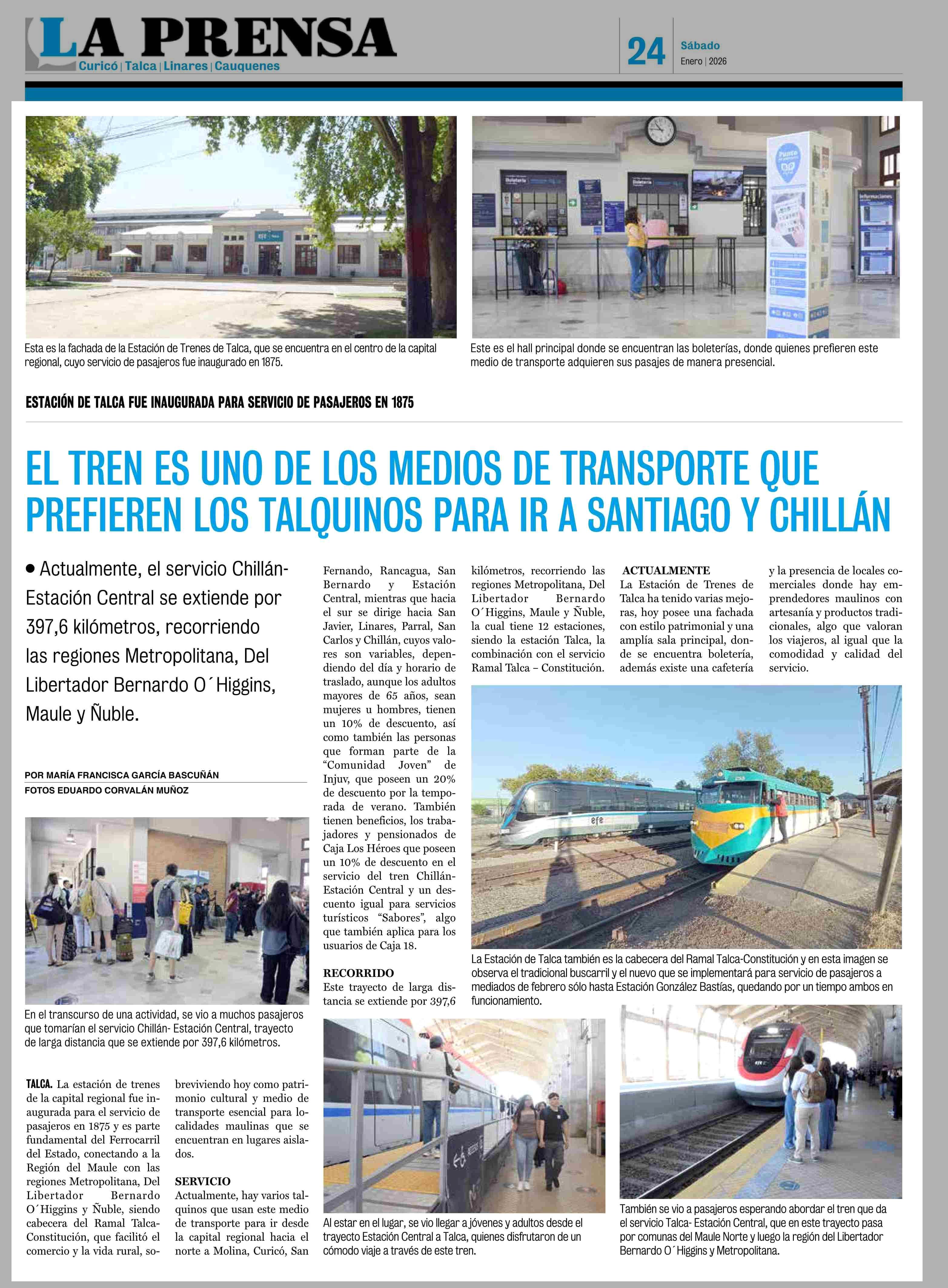 EL TREN ES UNO DE LOS MEDIOS DE TRANSPORTE QUE PREFIEREN LOS TALQUINOS PARA IRA SANTIAGO Y CHILLÁN 24-01-2026 La Prensa de Curicó |