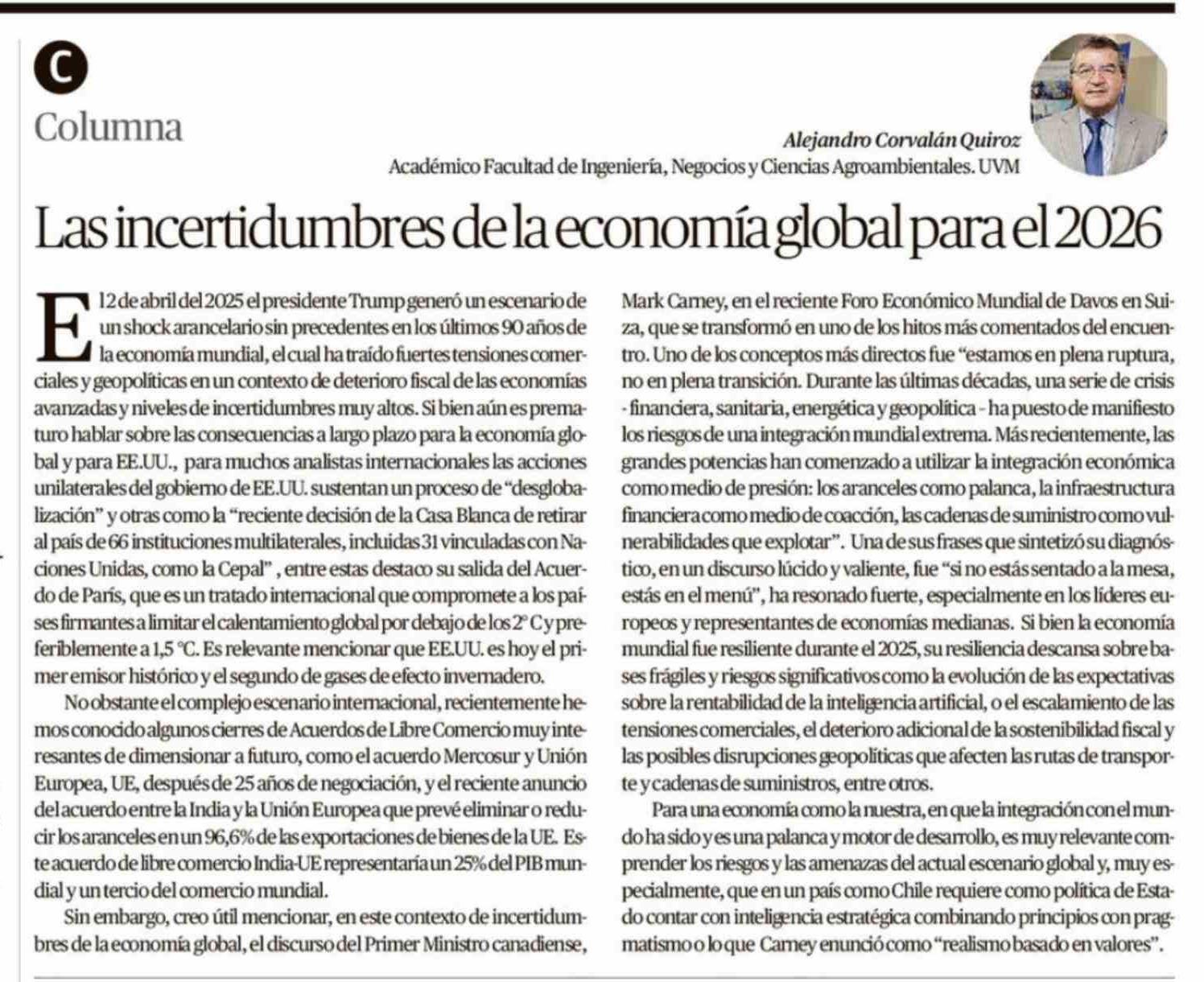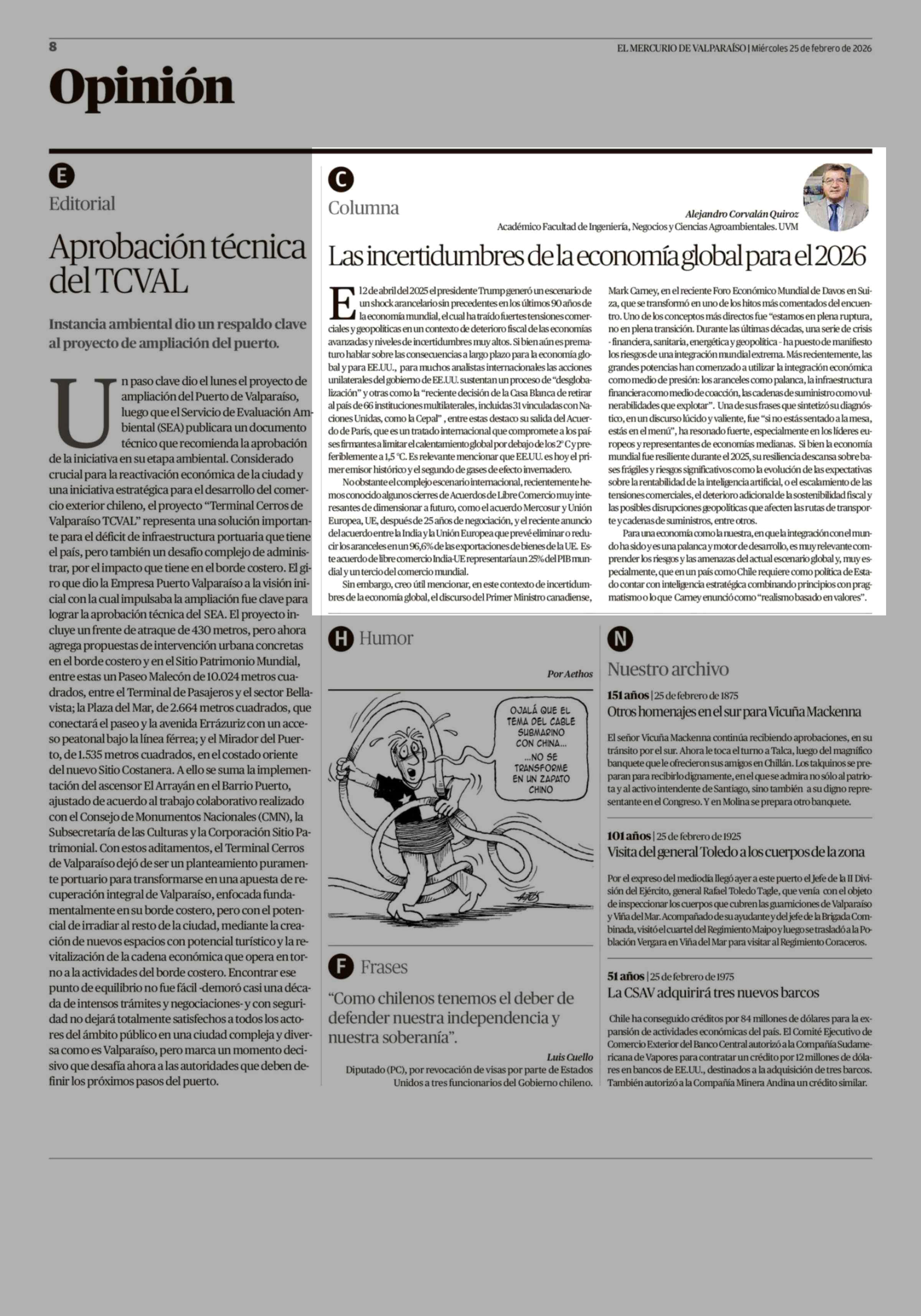 Columnas de Opinión: Las incertidumbres de la economía global para el 2026 25-02-2026 El Mercurio de Valparaíso |
