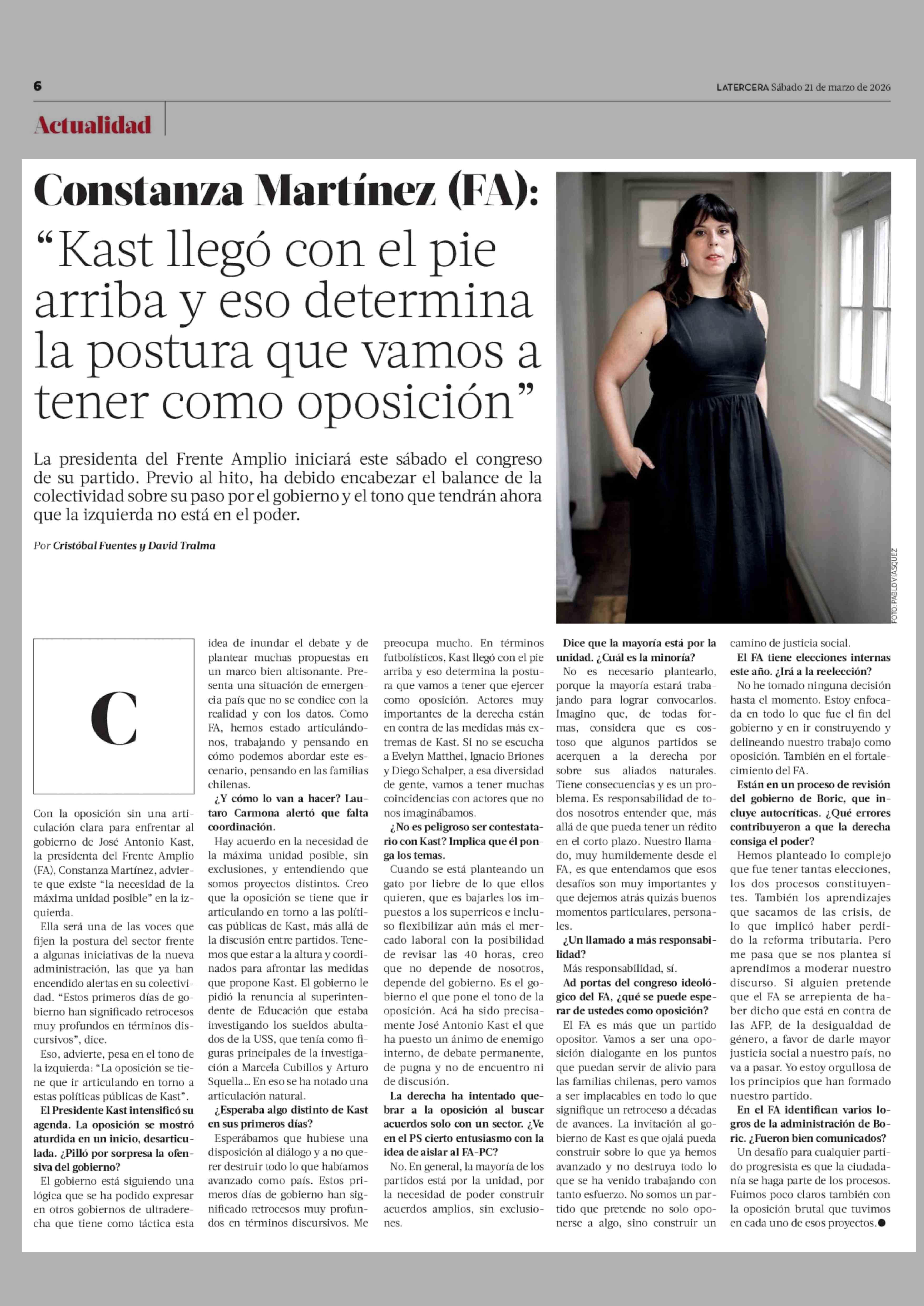 Título: Constanza Martínez (FA): "Kast llegó con el pie arriba y eso determina la postura que vamos a tener como oposición"