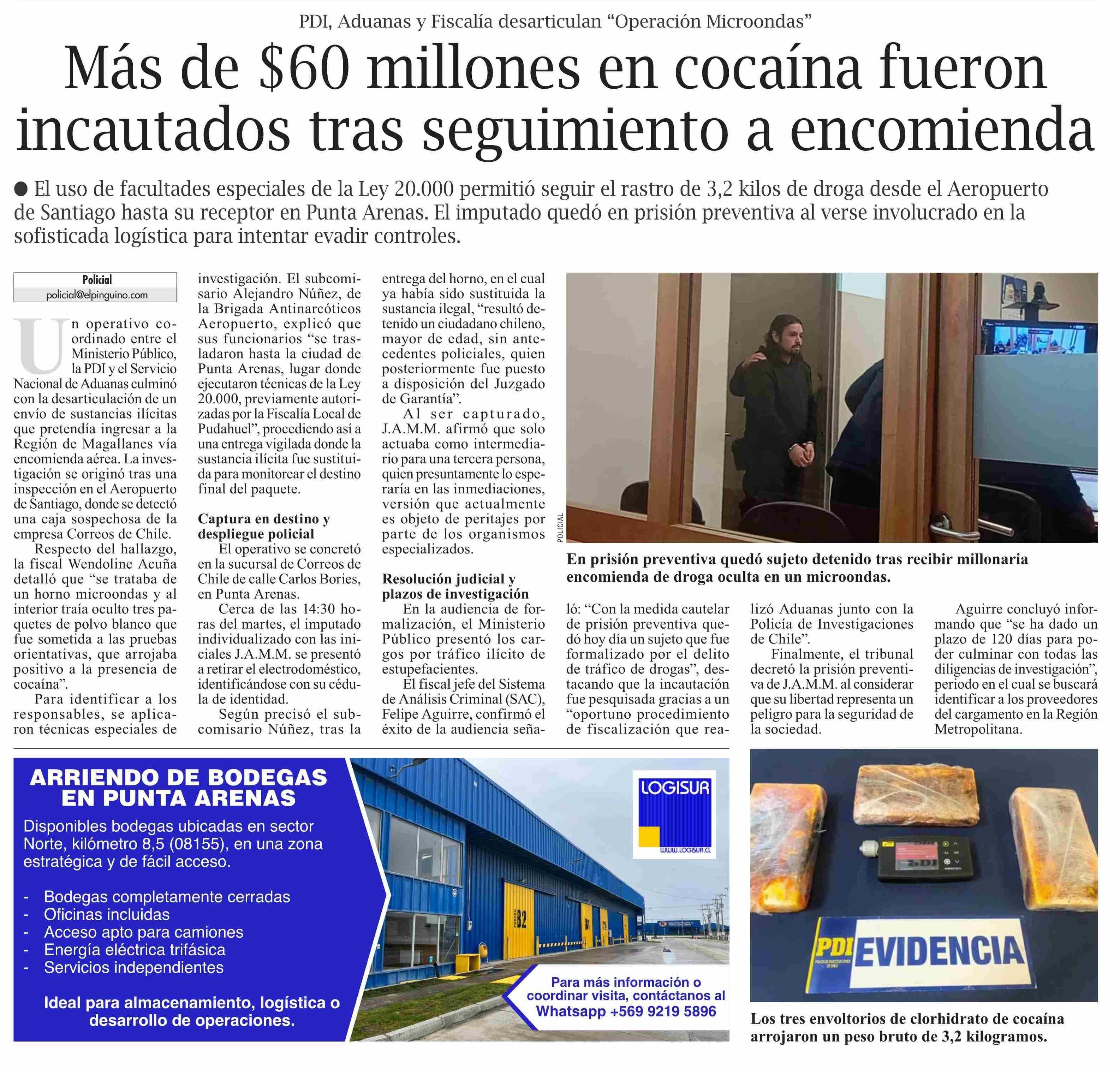 Más de $60 millones en cocaína fueron incautados tras seguimiento a encomienda 09-04-2026 El Pingüino |
