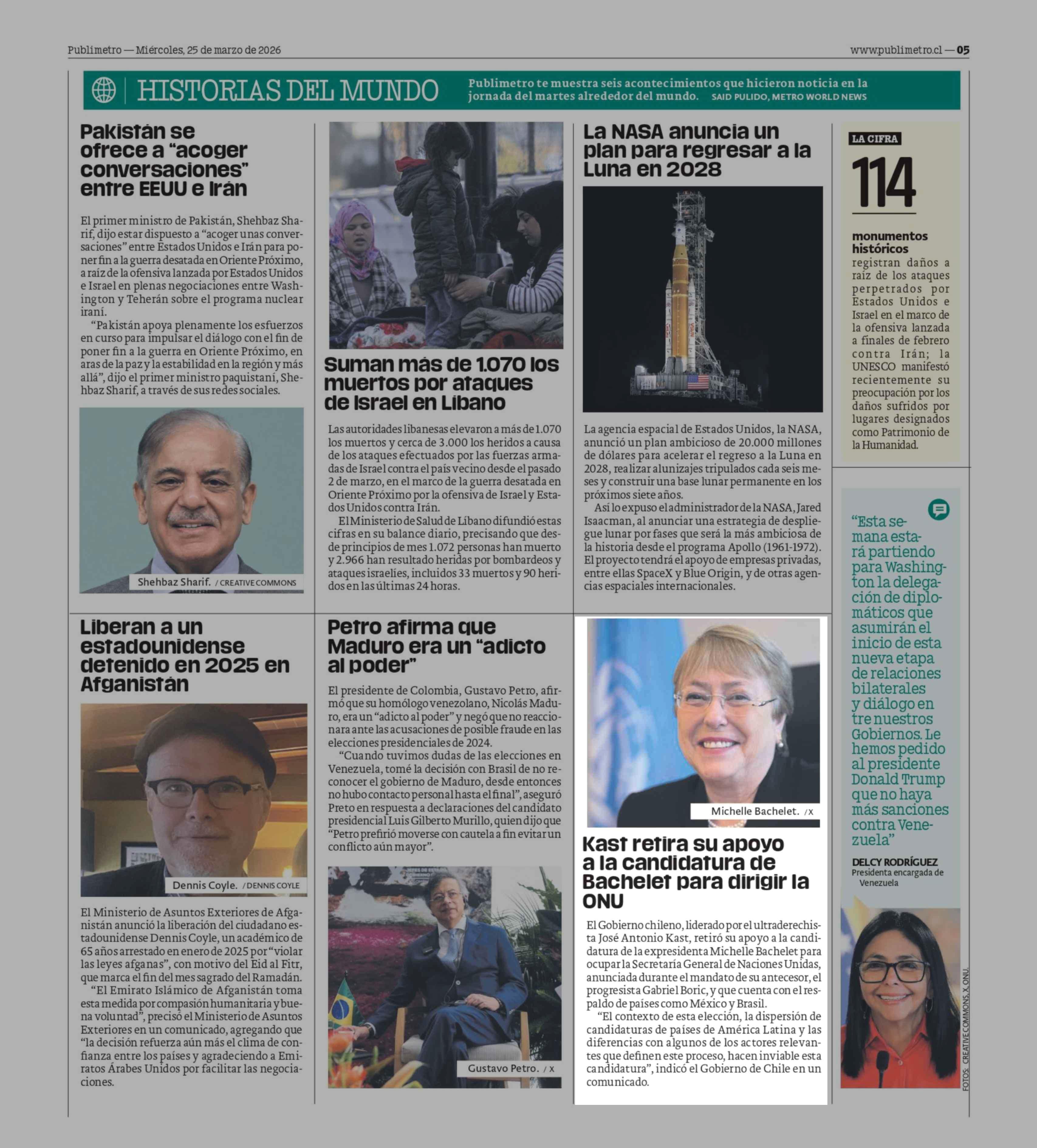 Kast retira su apovo a la candidatura de Bachelet para dirigir la ONU 25-03-2026 Publimetro |