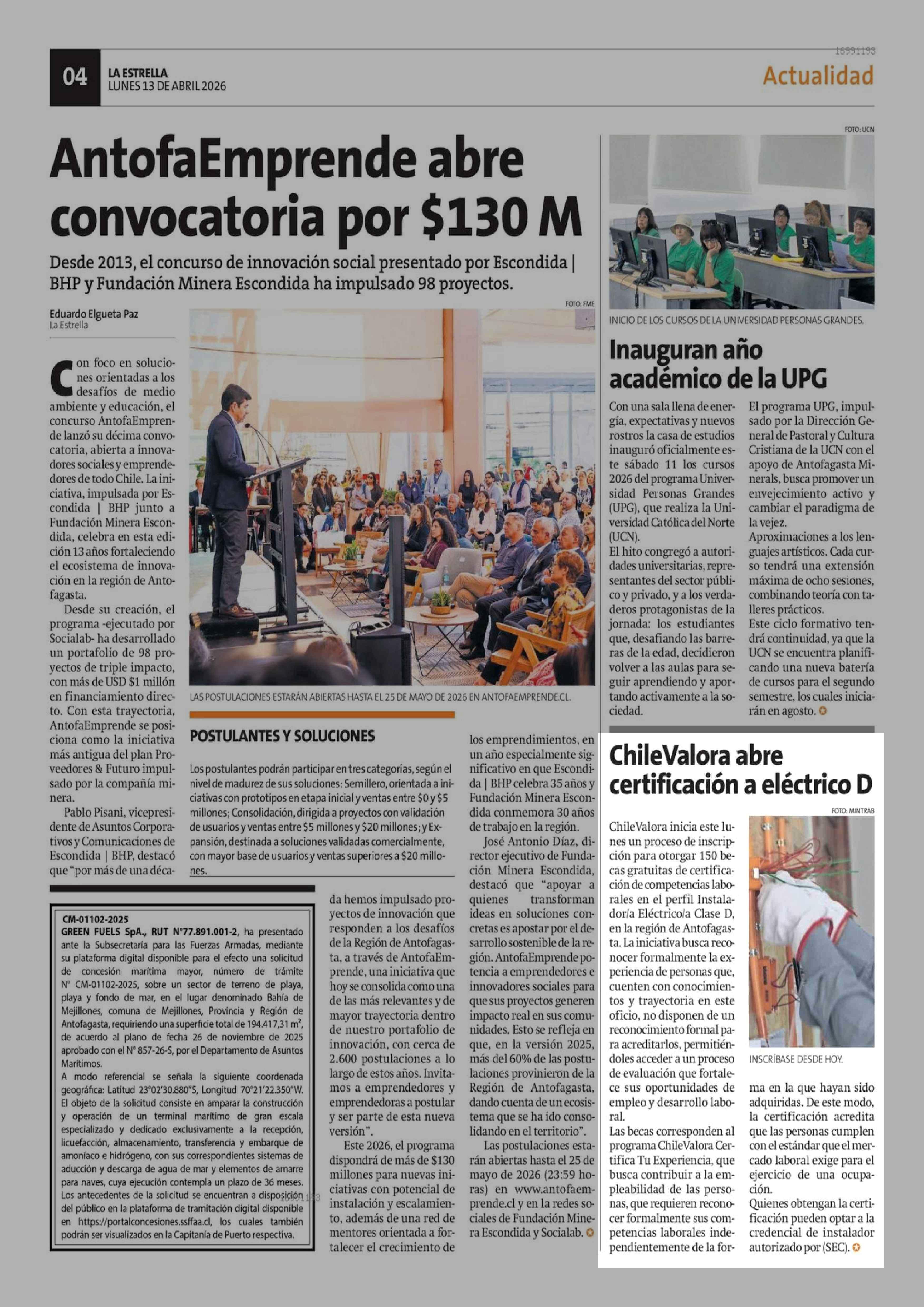 ChileValora abre certificación a eléctrico D 13-04-2026 La Estrella de Antofagasta |