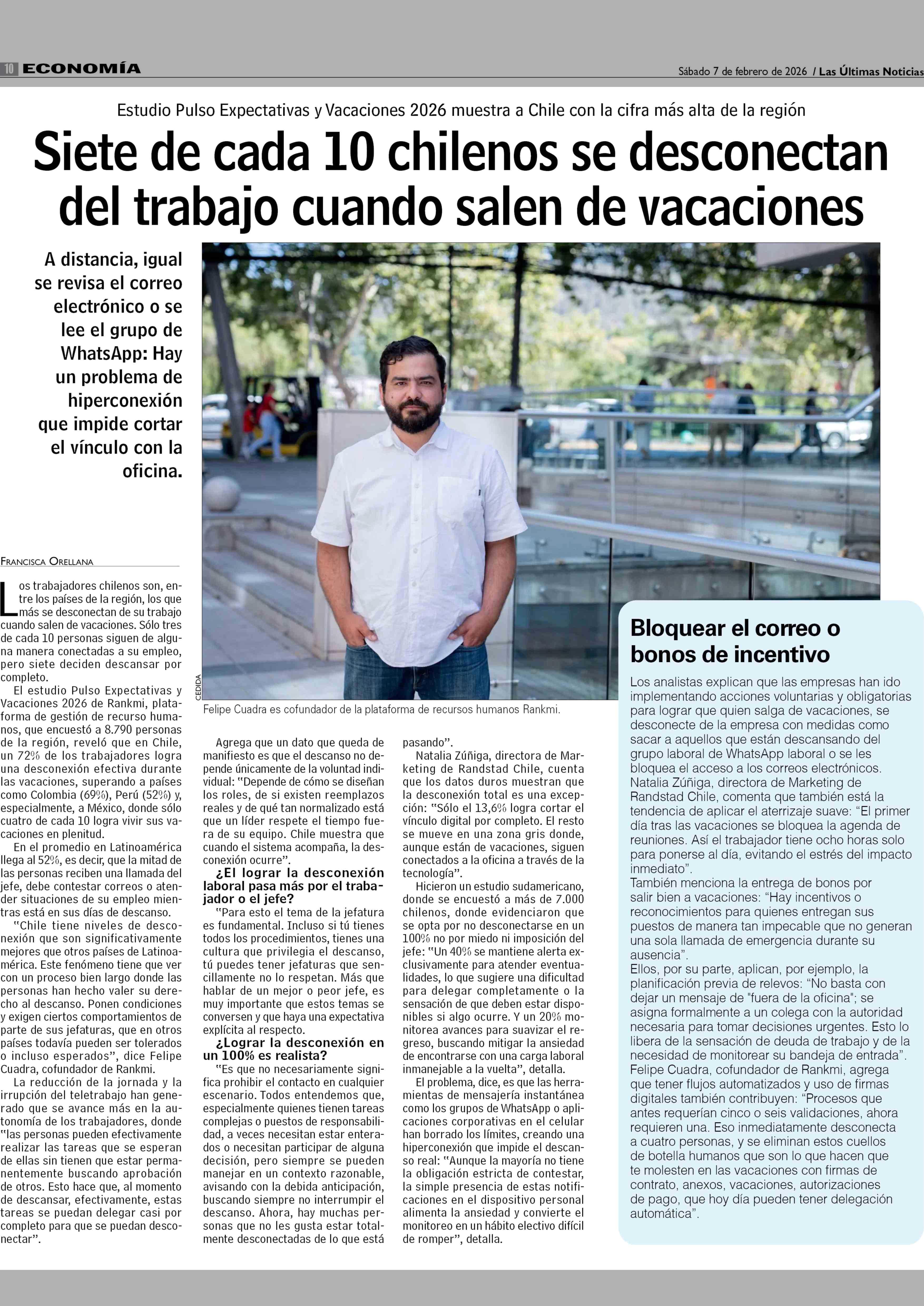 Siete de cada 10 chilenos se desconectan del trabajo cuando salen de vacaciones 07-02-2026 Las Últimas Noticias |