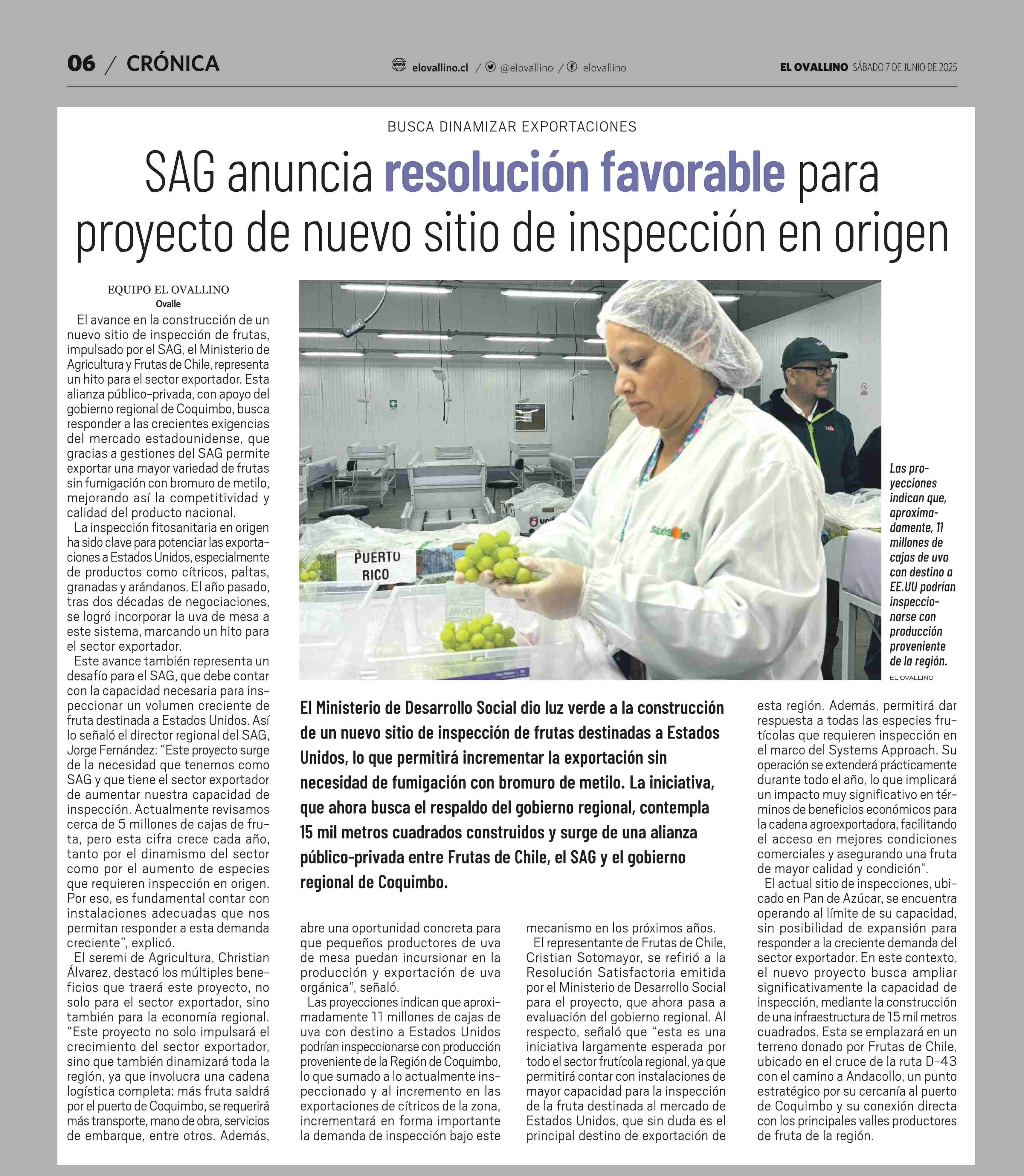 SAG anuncia resolución favorable para proyecto de nuevo sitio de inspección en origen 07-06-2025 El Ovallino |