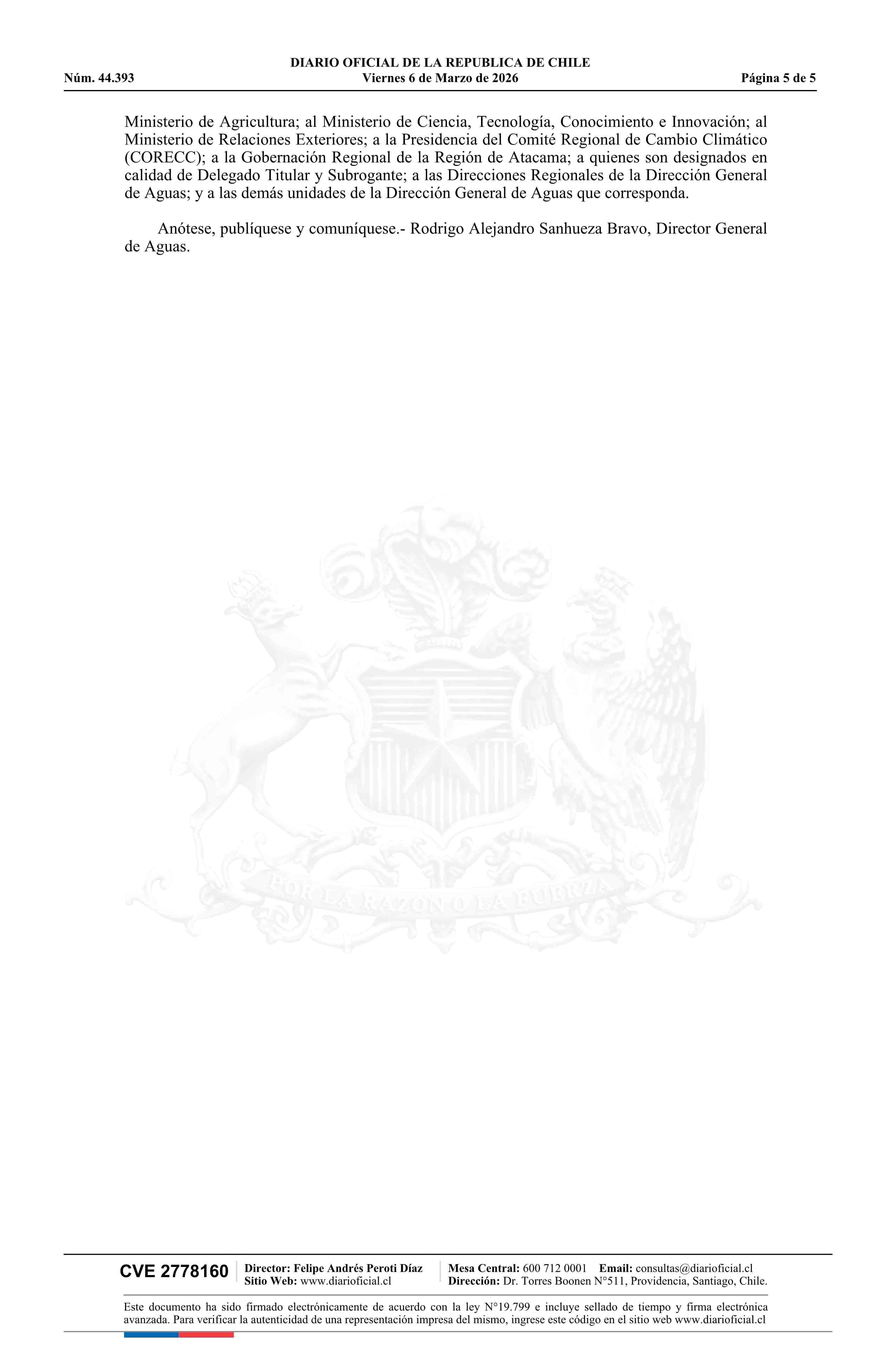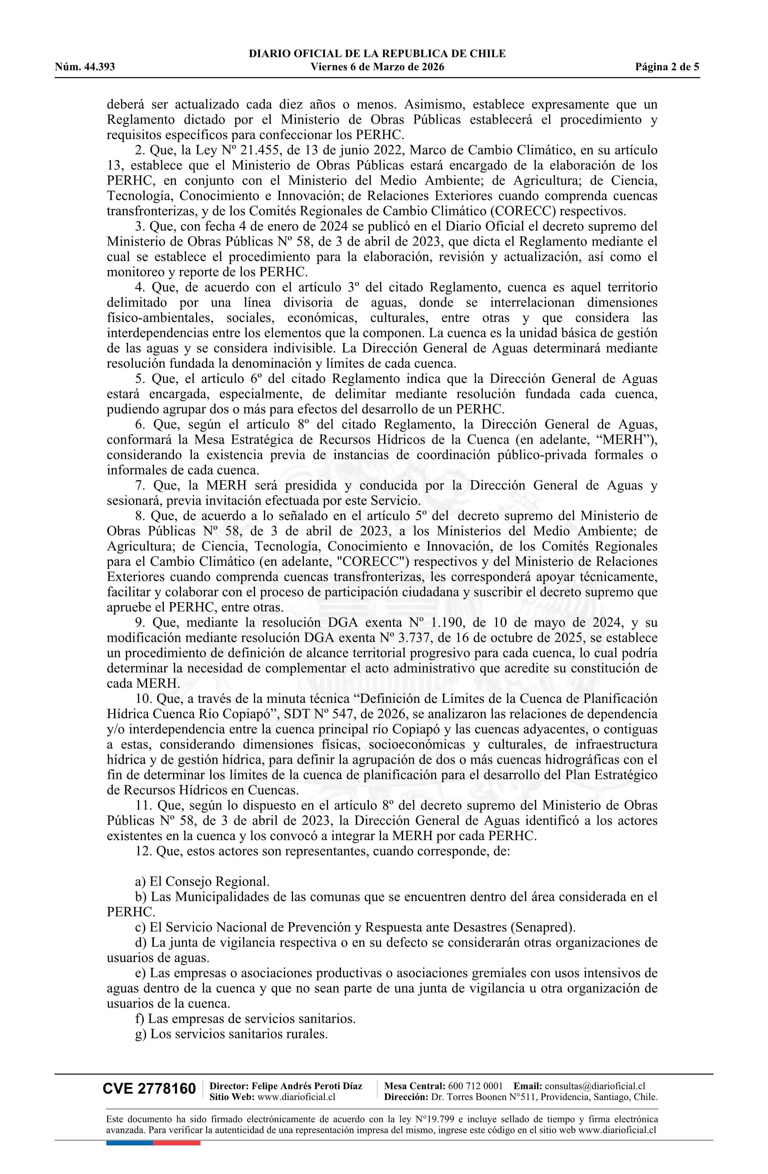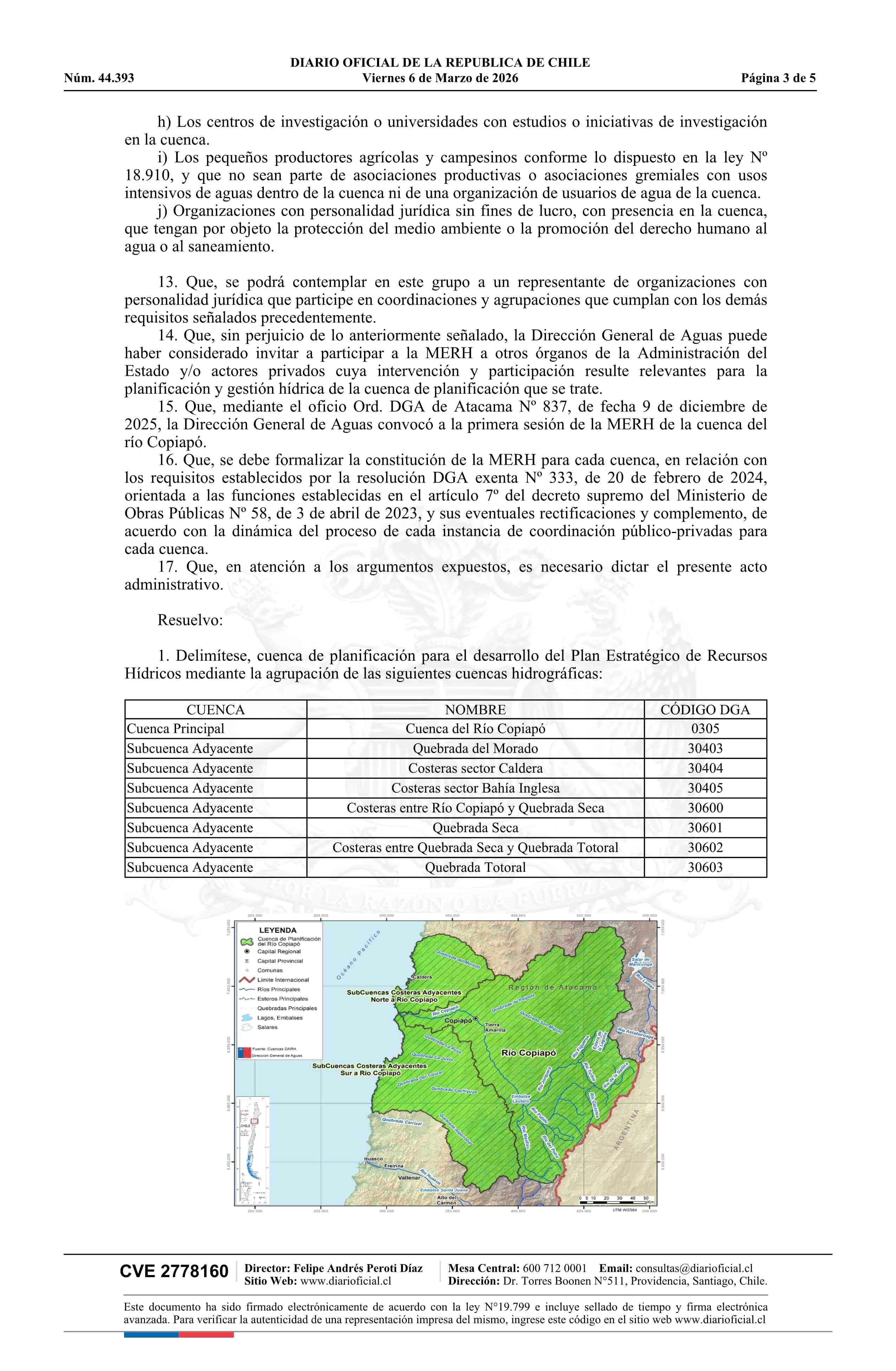 | Título: | Resolución exenta número 431, de 2026.- Delimita y denomina cuenca de planificación para el desarrollo del Plan Estratégico de Recursos Hídricos en la Cuenca del Río Copiapó y Adyacentes; constituye mesa estratégica de recursos hídricos; identifica convocados y asistencia a primera sesión; y designa |