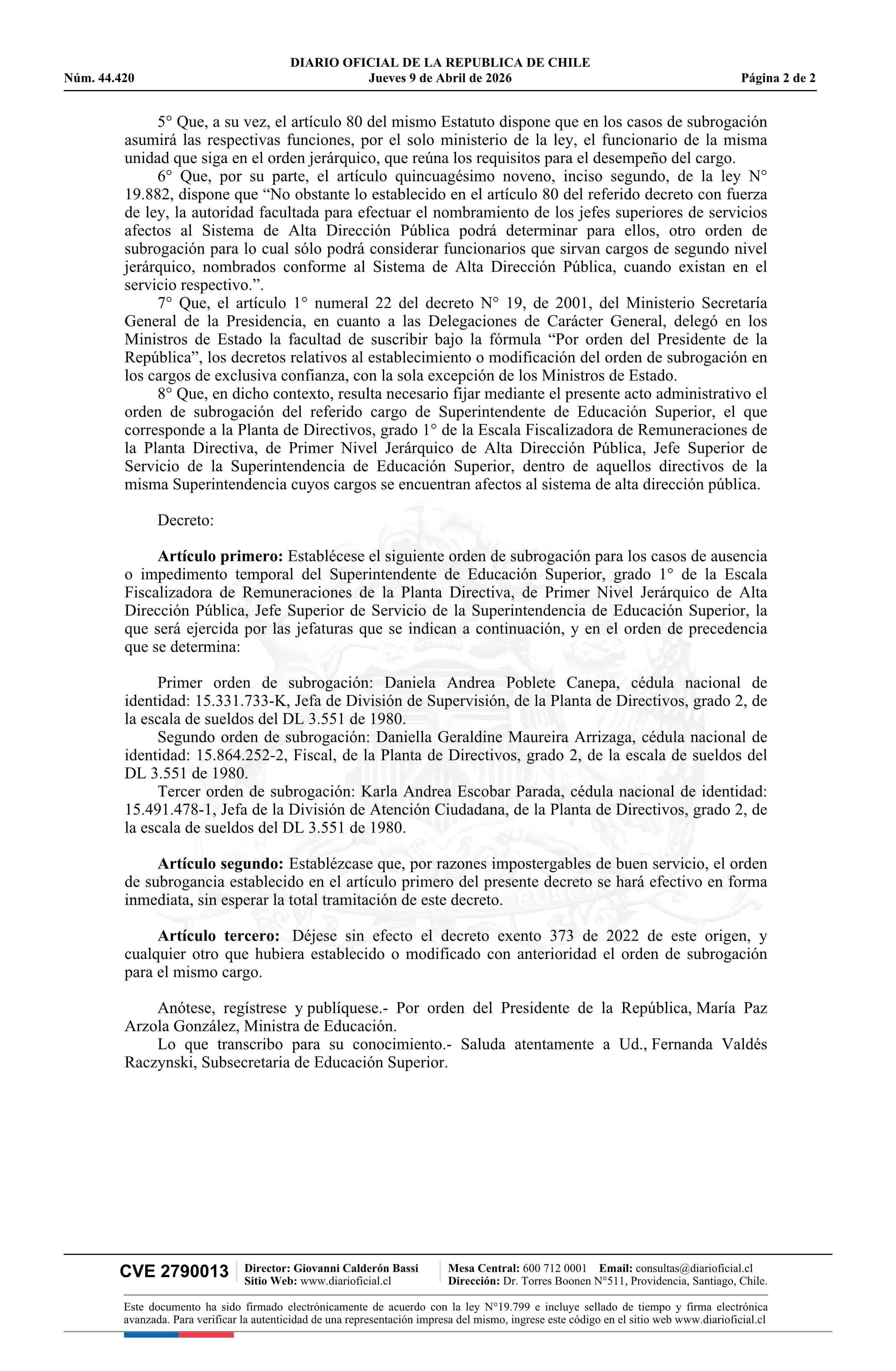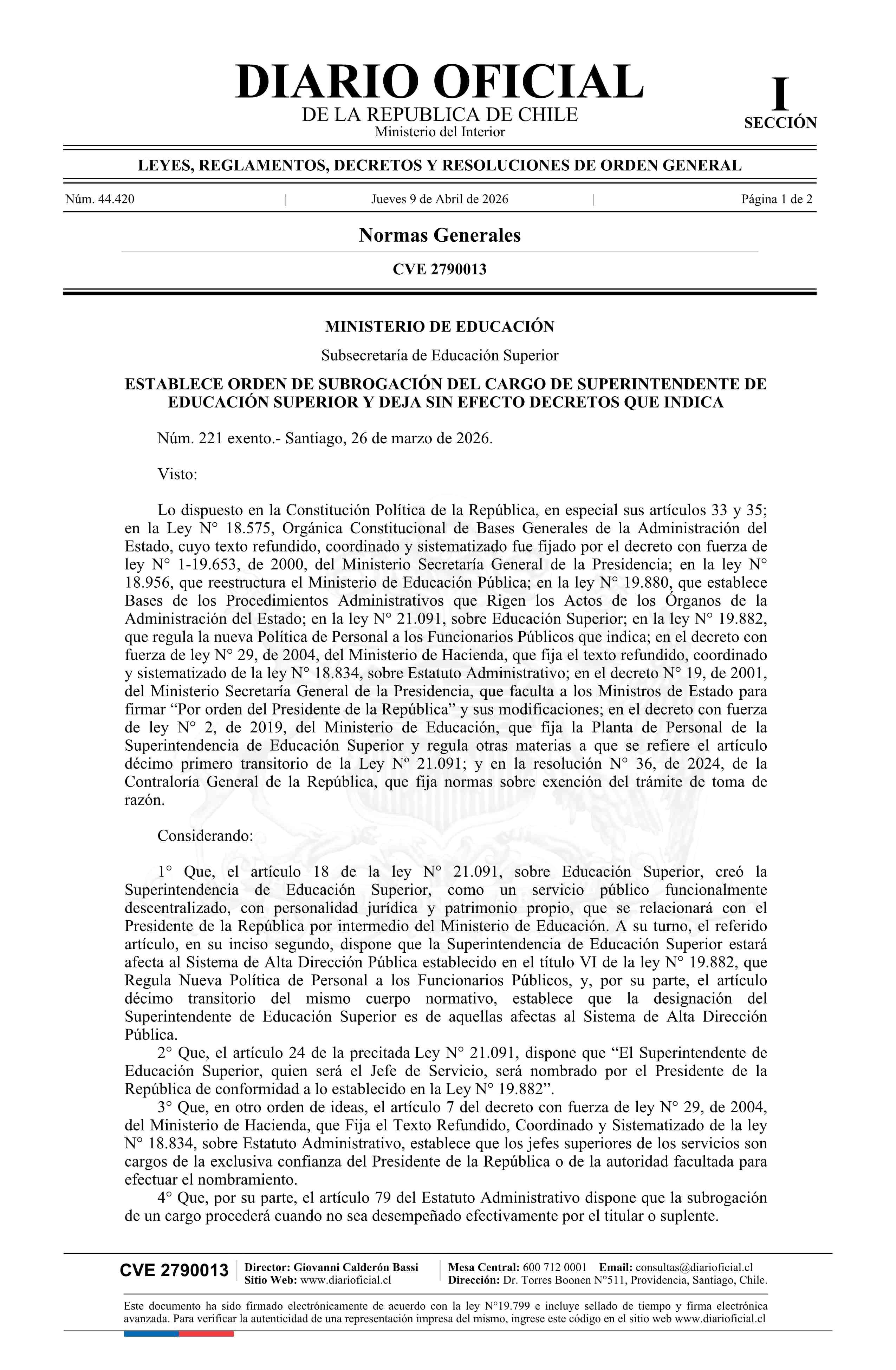 Título: Decreto exento número 221, de 2026.- Establece orden de subrogación del cargo de Superintendente de Educación Superior y deja sin efecto decretos que indica