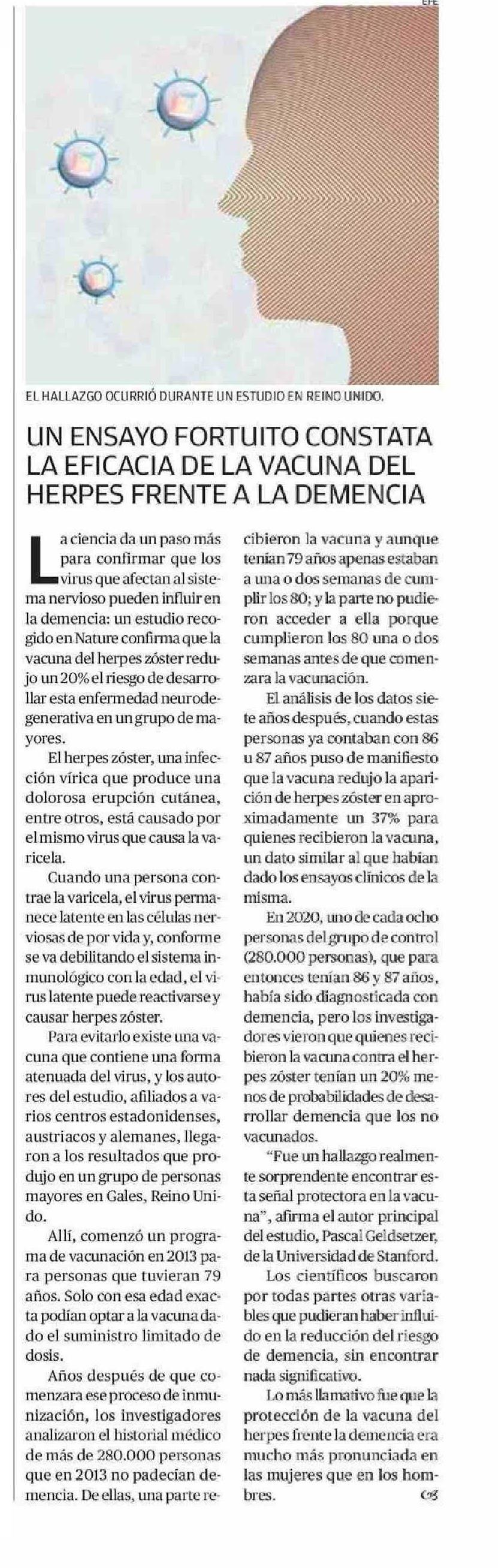 UN ENSAYO FORTUITO CONSTATA LA EFICACIA DE LA VACUNA DEL HERPES FRENTE A LA DEMENCIA 03-04-2025 El Mercurio de Calama |