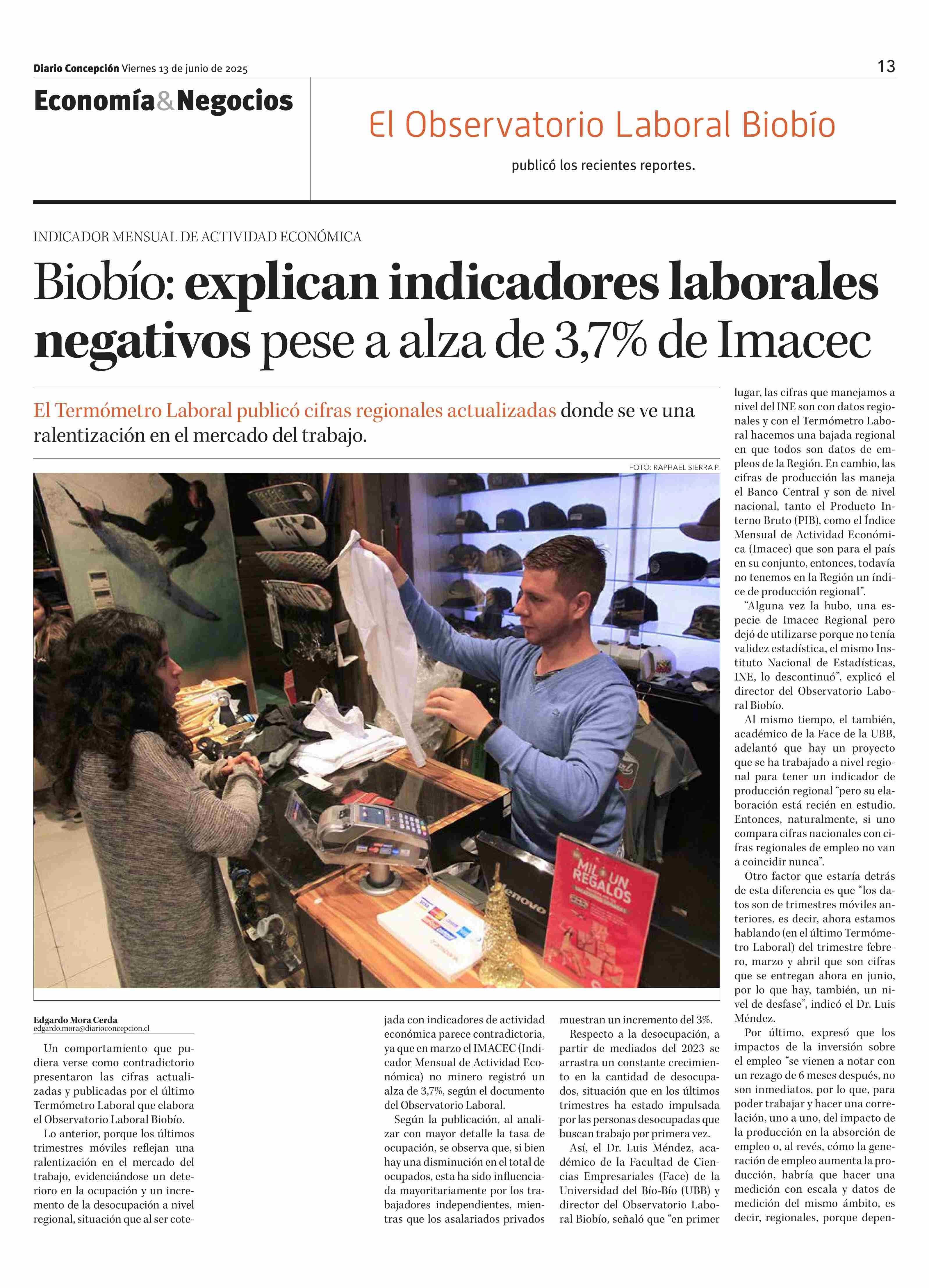 Biobío: explican indicadores laborales negativos pese a alza de 3,7% de Imacec 13-06-2025 Diario Concepción |
