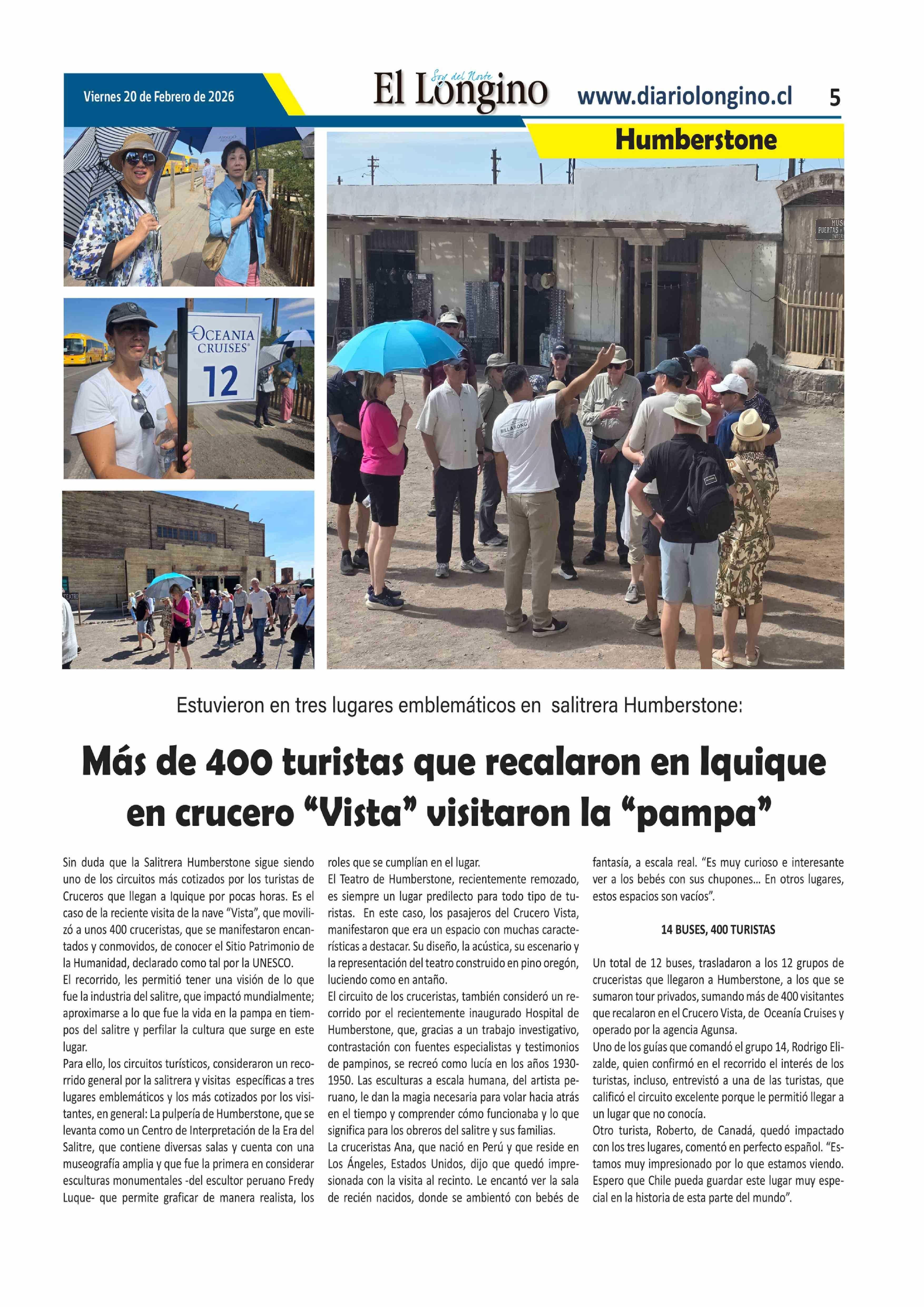 Más de 400 turistas que recalaron en Iquique en crucero "Vista" visitaron la "pampa" 20-02-2026 El Longino |