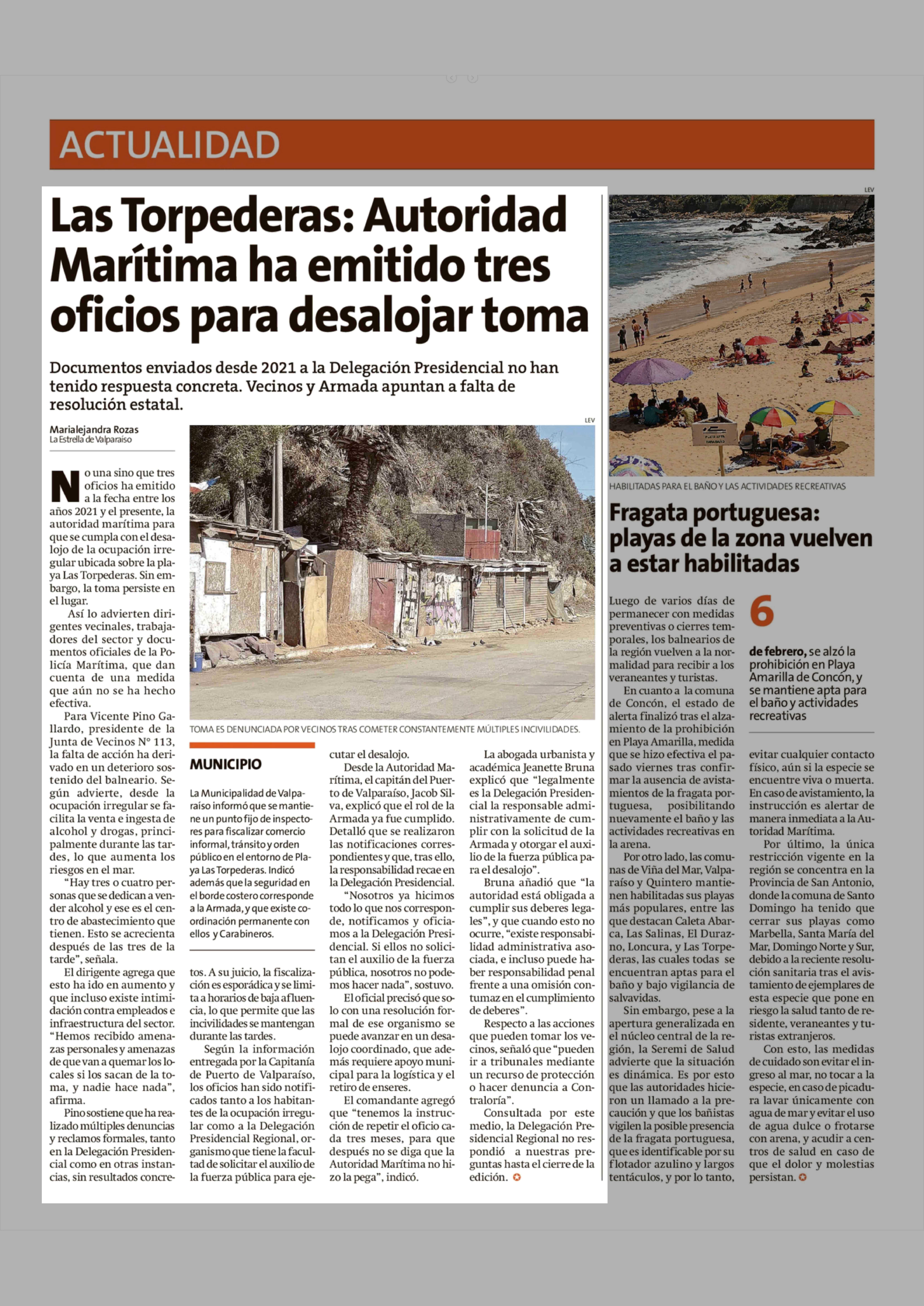 Las Torpederas: Autoridad Marítima ha emitido tres oficios para desalojar toma 11-02-2026 La Estrella de Valparaíso |