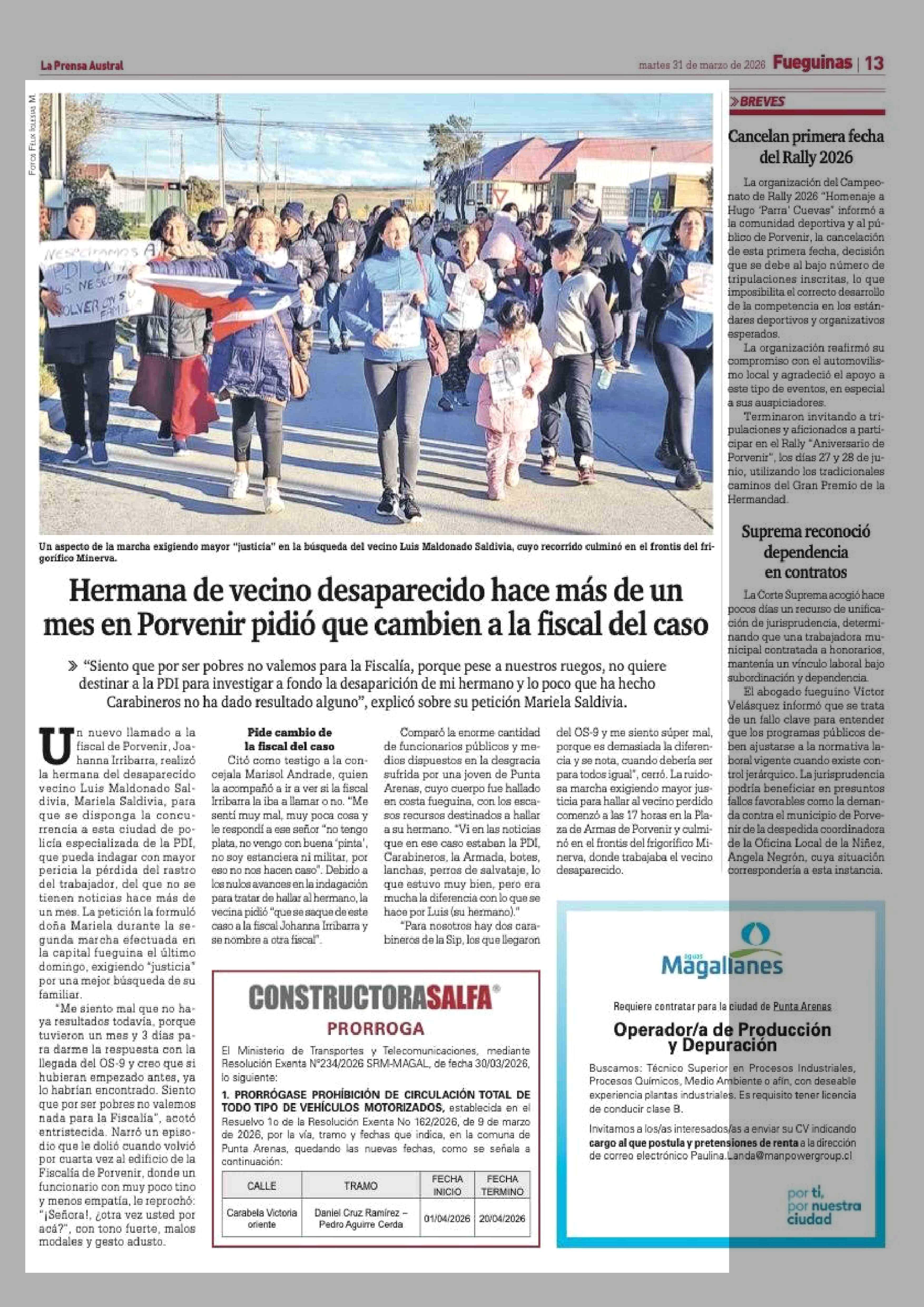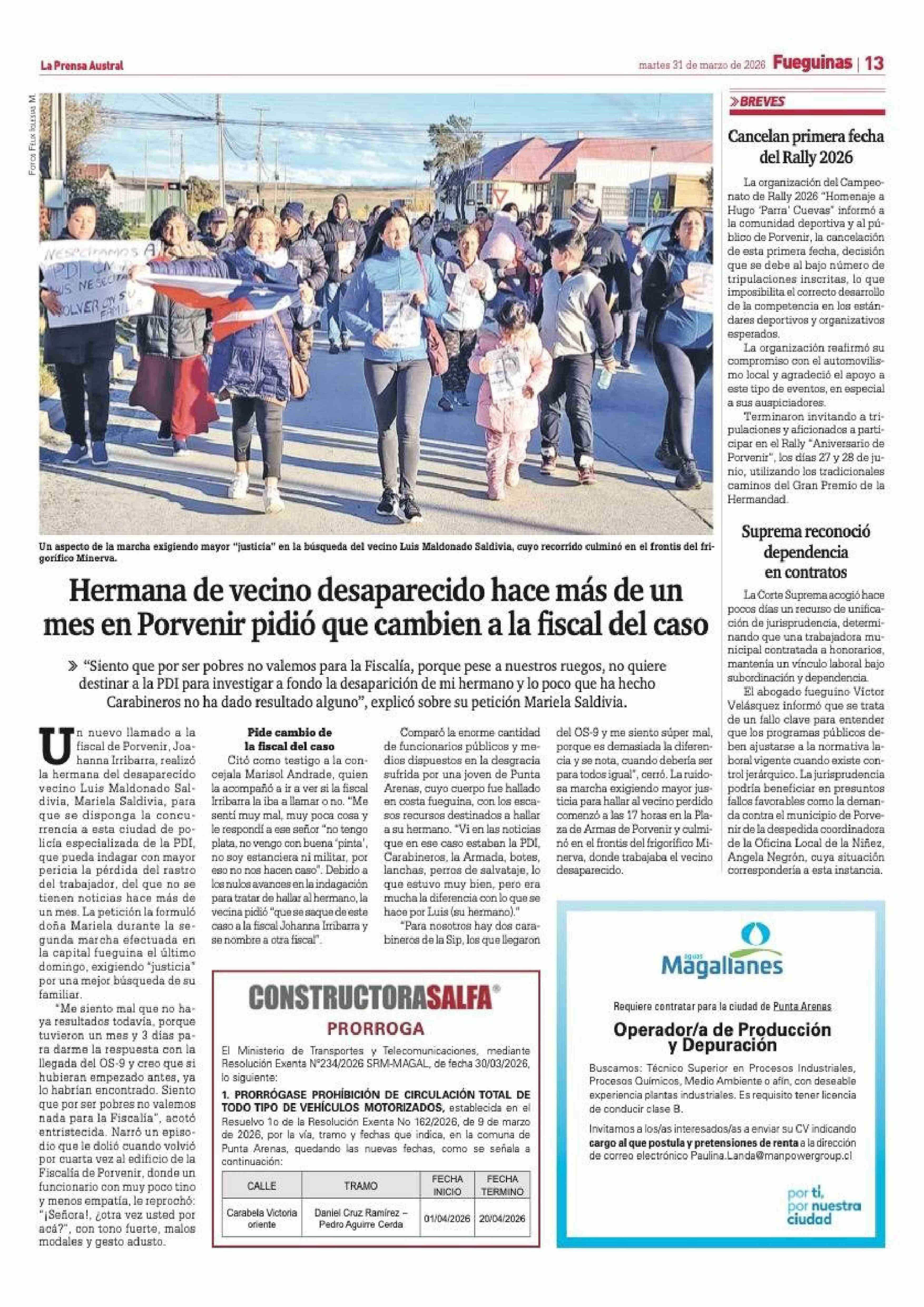 Hermana de vecino desaparecido hace más de un mes en Porvenir pidió que cambien a la fiscal del caso 31-03-2026 La Prensa Austral |