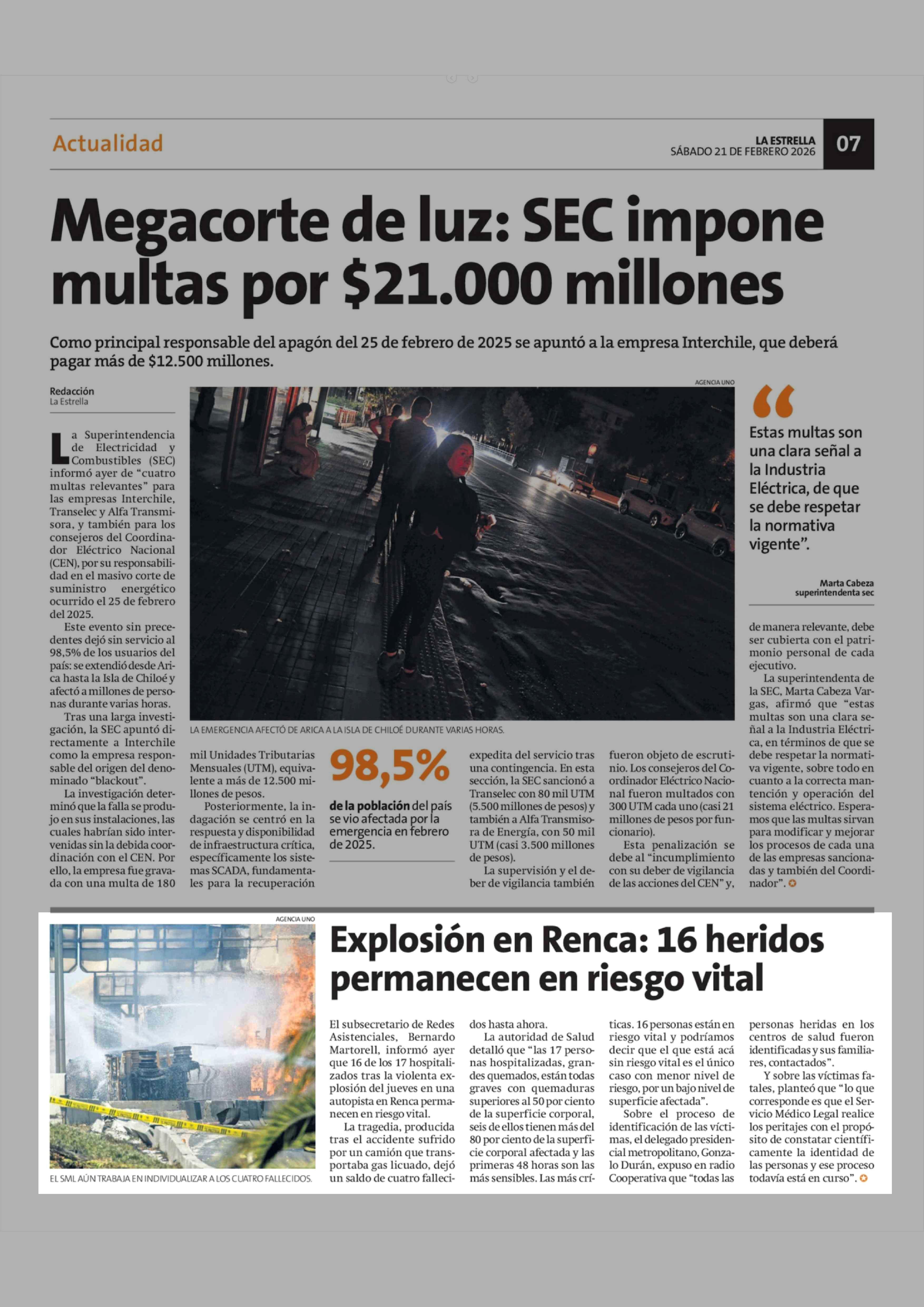 Explosión en Renca: 16 heridos permanecen en riesgo vital 21-02-2026 La Estrella de Antofagasta |